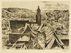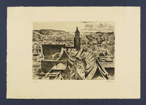 Um 1930. Radierung / Strichätzung & Kaltnadel & Roulette, in Schwarz, mit Plattenton, auf gelblichem Velin. – Originale Künstlergrafik, von Arthur Henne. – Auflage Exemplar Nr. 90/100. – 19,4 x 27,0 cm (Darstellung / Platte), 31 x 44 cm (Blatt).