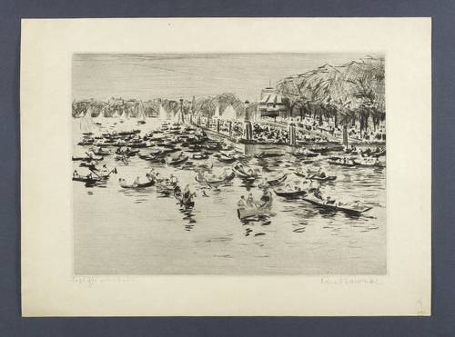 Paul Paeschke (1875 Berlin - 1943 Berlin). Deutscher Maler und Radierkünstler. 1900-06 Studium an der Kunstakademie in Berlin. Meisterschüler von Karl Köpping. Zu seinen Hauptmotiven zählten die belebten, innerstädtischen Straßen und Plätze Berlins und anderer europäischer Städte, die er gern lichtdurchflutet in einer impressionistischen Darstellungsweise wiedergab. Paeschke gilt als begnadeter Radierkünstler, der die diversen Techniken des Tiefdrucks von der Kaltnadel bis zum Roulette nahezu bis zur Perfektion trieb.