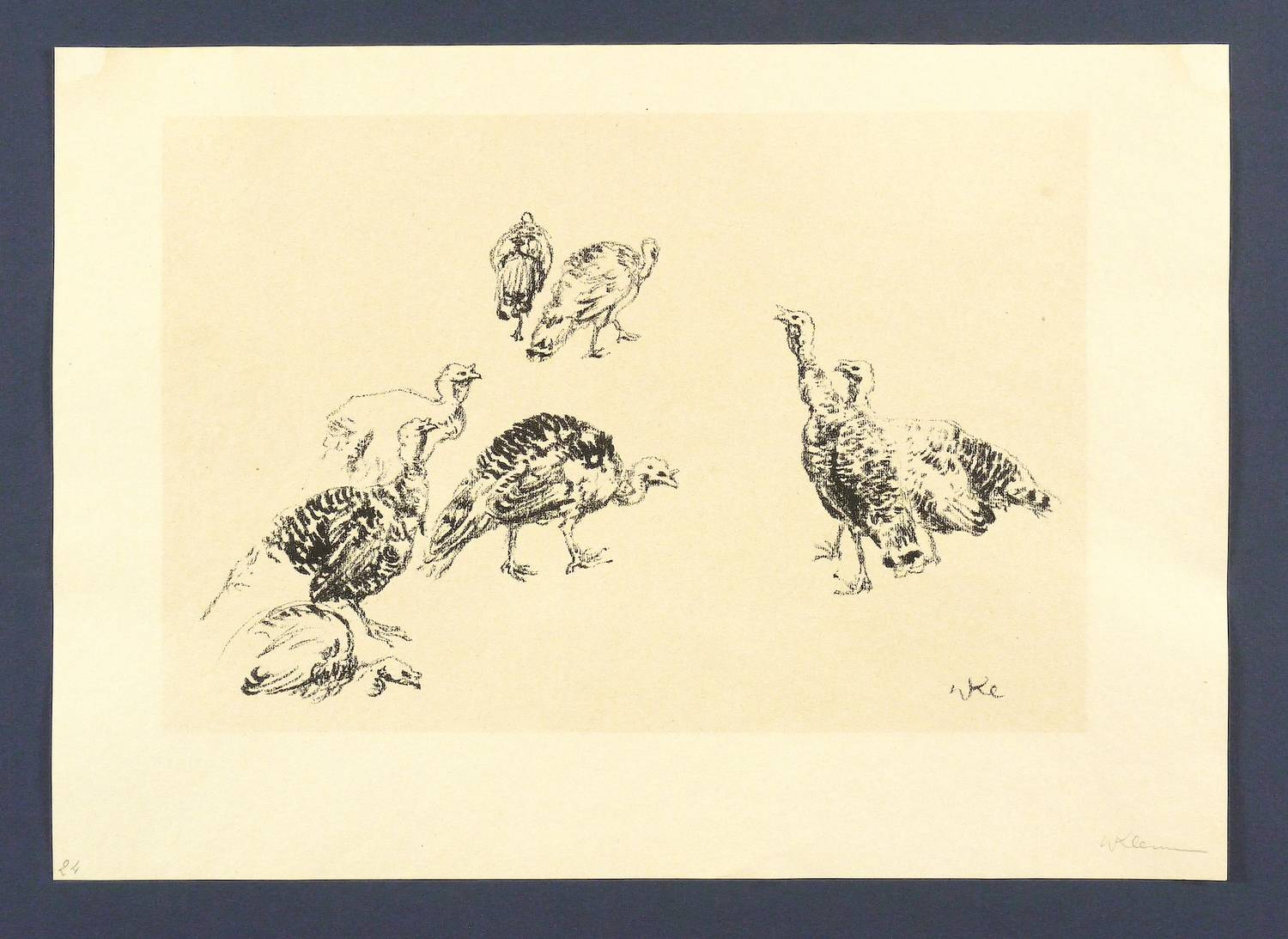 Walther Klemm (1885 Karlsbad – 1957 Weimar). Deutscher Maler, Zeichner und Grafiker, wichtiger Vertreter der neueren Weimarer Malerschule. Der Ermunterung durch Emil Orlik folgend studierte Klemm an der Wiener Kunstgewerbeschule bei Anton von Kenner und Kolo Moser. Um 1903 entstanden unter dem Einfluss des Japonismus erste Farbholzschnitte, in denen sich früh seine außerordentliche Begabung für die Tierdarstellung zeigte. In der Ausstellung der Wiener Sezession von 1904 verhalfen ihm diese Blätter zu unverhofftem Erfolg. Etwa zeitgleich gründete er in Prag eine Ateliergemeinschaft mit Carl Thiemann, mit dem er 1907 zur Künstlerkolonie Dachau überging. 1910 wurde er Mitglied der Berliner Sezession, dessen wohl bedeutendster Vertreter, Max Liebermann, dem noch jungen Künstler lakonisch prophezeit hatte: „Das wird was. Sie haben Talent“. 1913 erfolgte schließlich die Berufung als Professor an die Hochschule für Bildende Kunst in Weimar. Hier entfaltete Klemm einen überreichen Kosmos an Tier-, Figuren- und Landschaftsdarstellungen, entstand eine große Anzahl von Illustrationen und grafischen Folgen. Fruchtbare Beziehungen unterhielt er zu Harry Graf Kessler, Theodor von Hagen, Fritz Mackensen, Alexander Olbricht und Ludwig von Hofmann. Nach dem Krieg verwendete sich Klemm nachhaltig für den Wiederaufbau der Kunsthochschule Weimar.