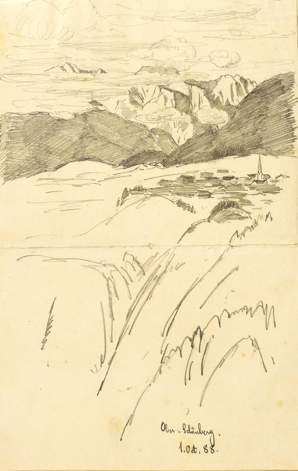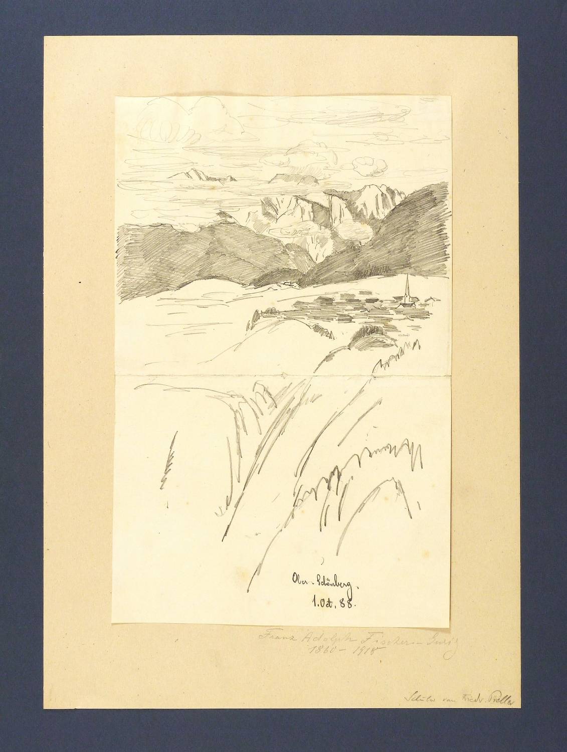 Unten in Bleistift bezeichnet: ″Ober-Schönberg 1/Oct. 88.″ Auf dem Trägerkarton rechts unten bezeichnet. Verso Nachlass-Stempel Fischer- Gurig und Sammlerstempel. – Mittig originale horizontal verlaufende Bindefalte. Alt auf Trägerkarton montiert. Insgesamt gut erhalten.