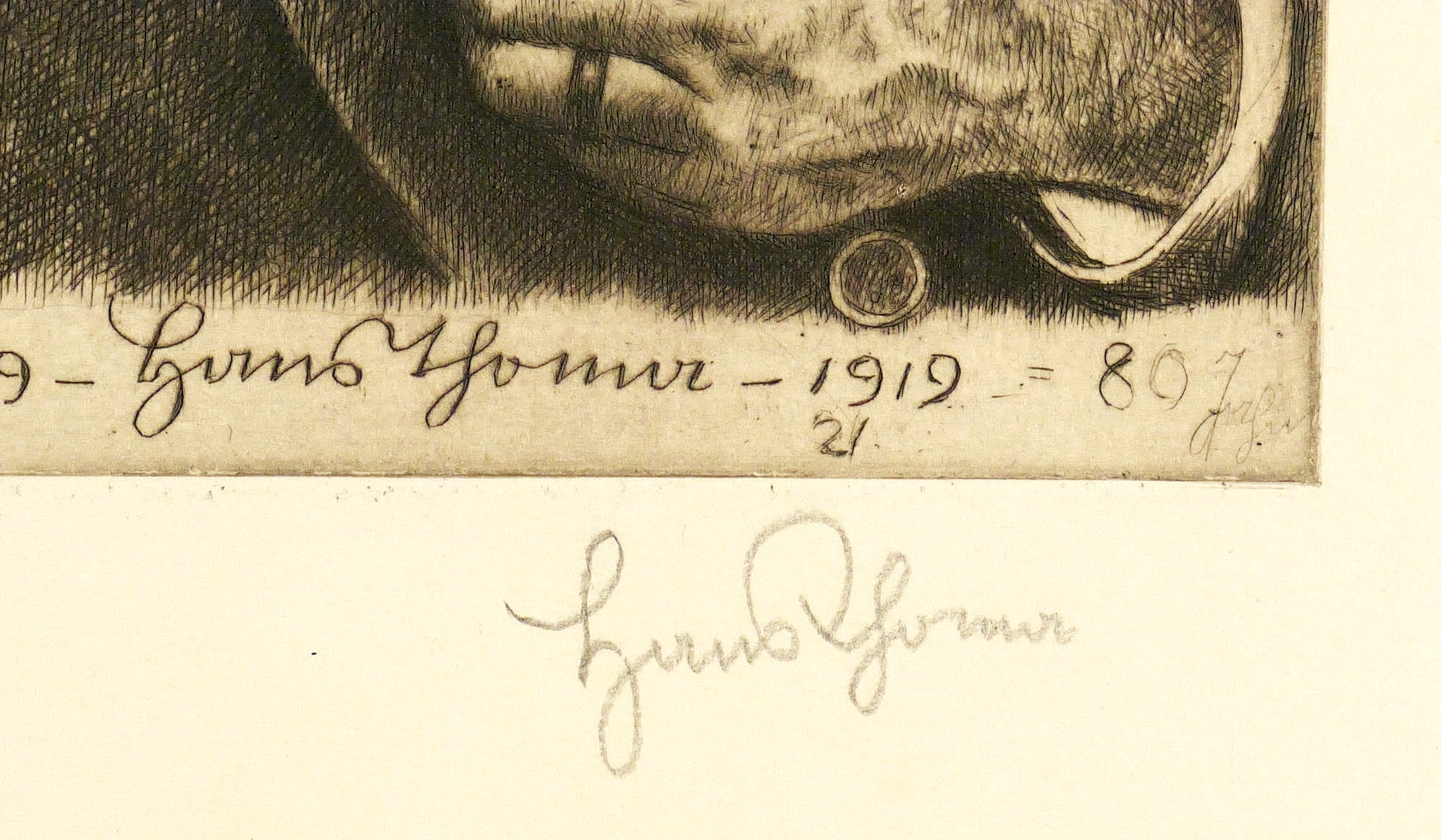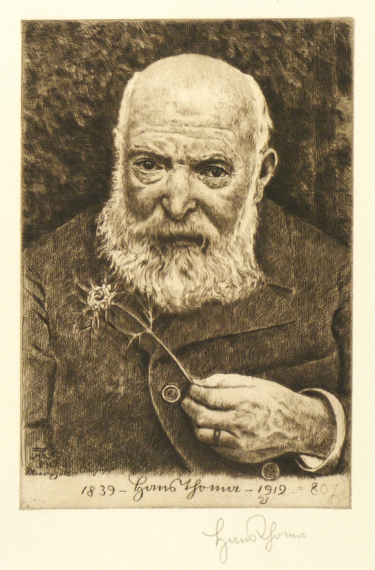 Beringer 237 5 (von 6). – Rechts unten in Bleistift signiert: ″Hans Thoma″. In der Platte links unten Monogramm und Jahr: ″HTh / 1919 Marxzell″. Im unteren Plattenrand Inschrift: ″1839 - Hans Thoma - 1919 = 80 Jahr / 21.″ – Originalrandiges Blatt. Im oberen Rand kaum merklich fleckig. Sonst tadellos. Guter Zustand.