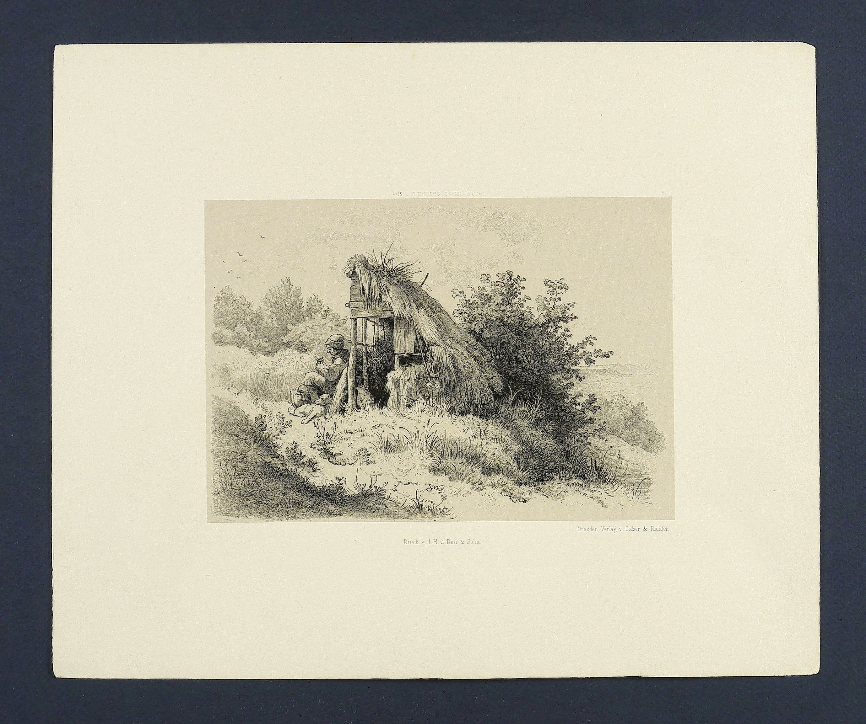 Hoff-Budde 3238. Hoff 3026. – Aus: Adrian Ludwig Richter, Aus Ludwig Richter's Skizzenbuch. Landschaftliche Studien und Staffagen, nach den Originalen auf Stein übertr. von Woldemar Rau (Dresden: Gaber & Richter 1857). – Oberhalb der Darstellung bezeichnet. Unterhalb Drucker- und Verlagsadressen. – Blatt Nr. 5 der Folge. – Sehr guter Zustand.