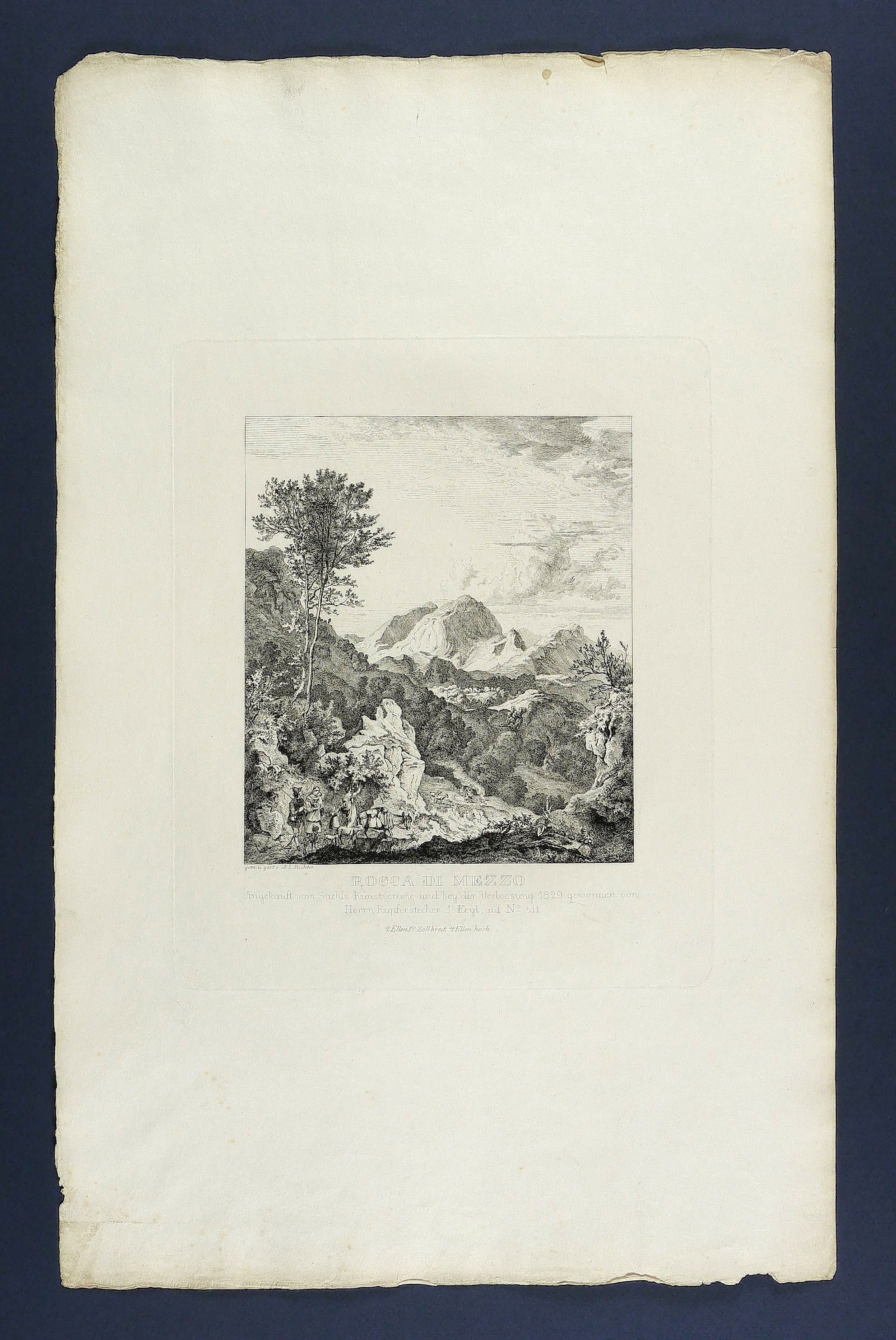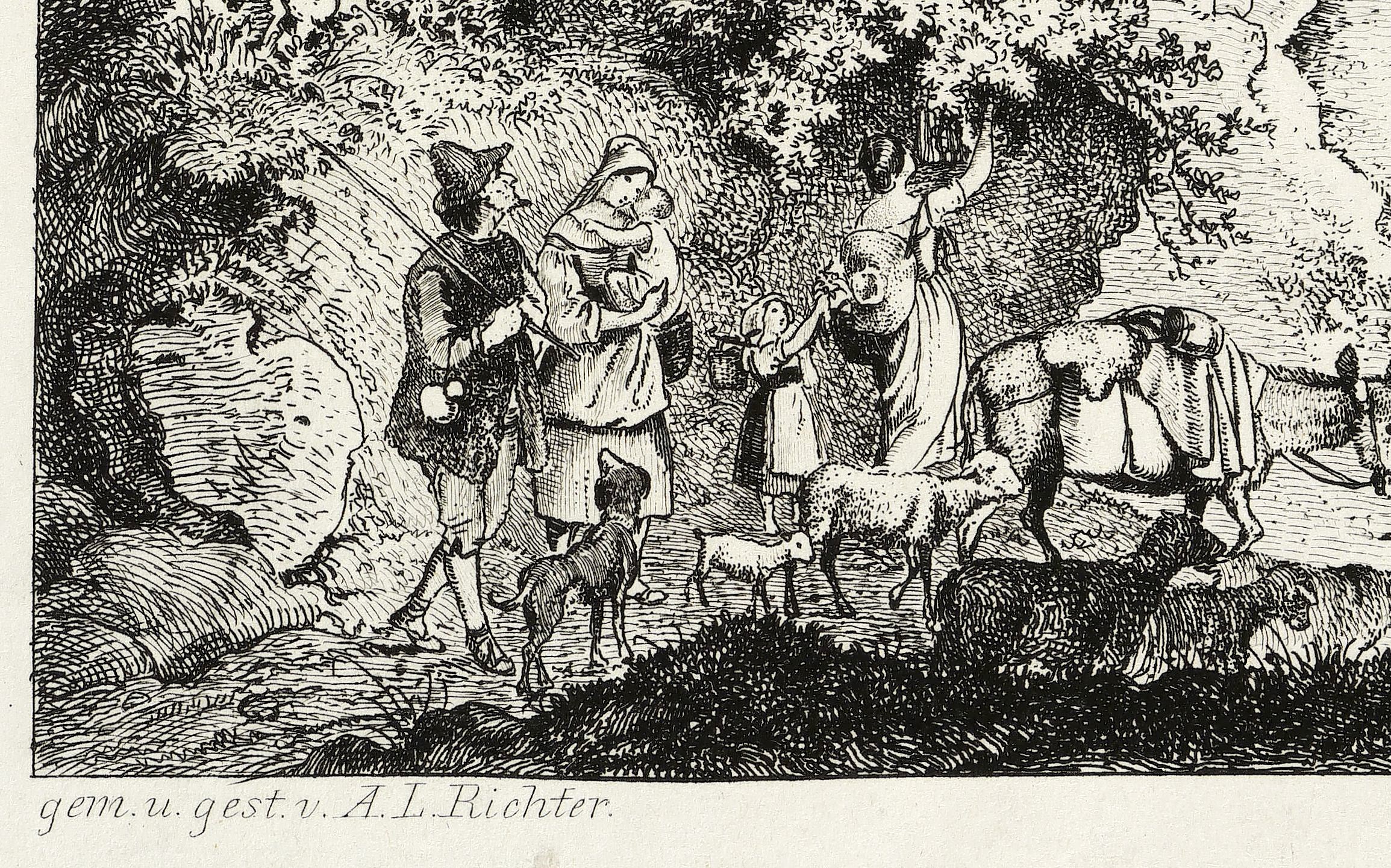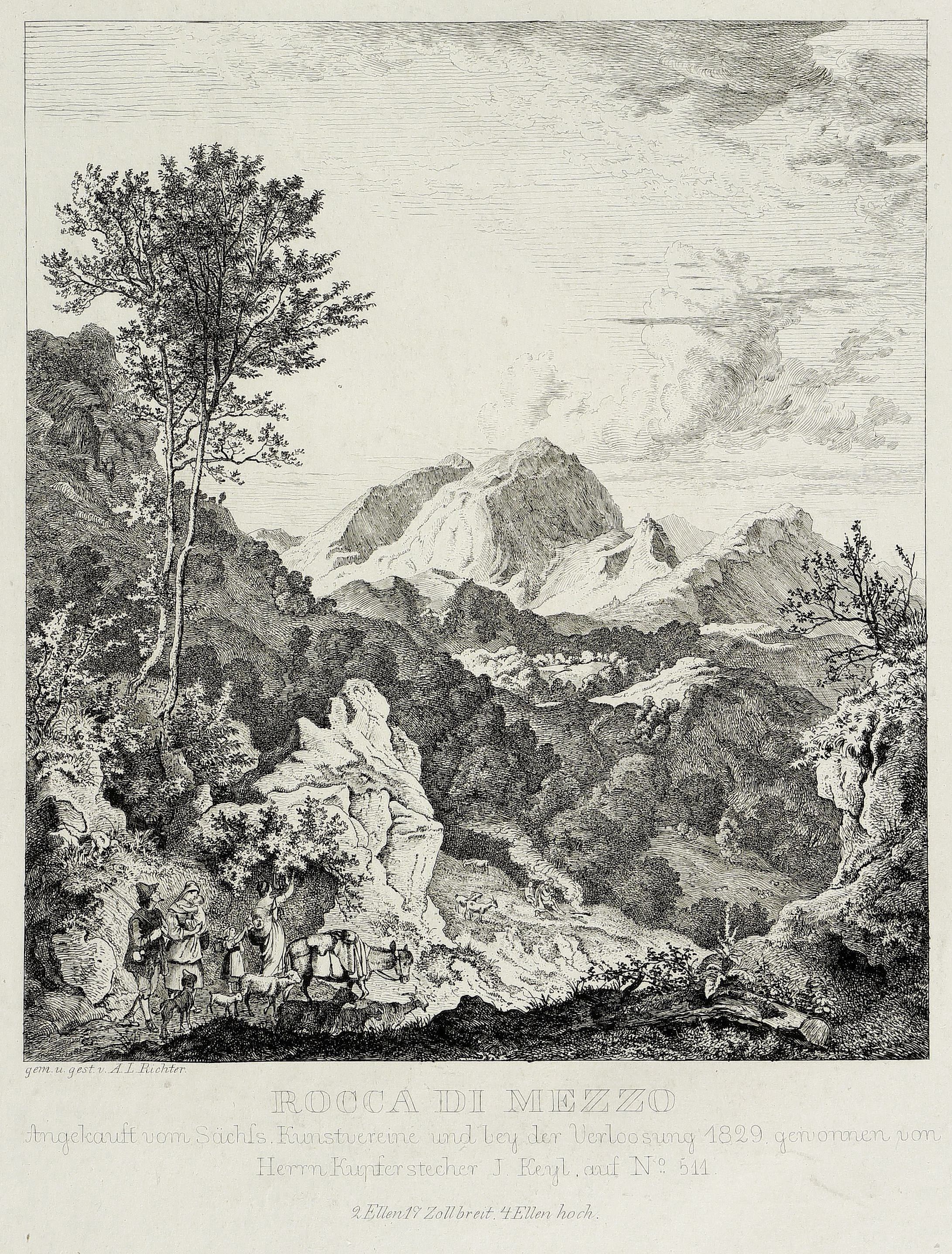 Kovalevski B-C 27. Hoff-Budde 192 III. Hoff 156. – Aus: Bilderchronik des Sächsischen Kunstvereins (Dresden: Sächsischer Kunstverein 1828-1836). – Signiert unten links: "gem. u. gest. v. A.L. Richter." – Malerischer Ausblick auf die Berge der Abruzzen. Im Vordergrund links eine kleine Gruppe italienischer Landleute. Auf einer Anhöhe im Bildmittelgrund an einem Feuer ein Knabe und ein Schäfer auf dem Dudelsack spielend. – Originalrandiges Blatt. Im Randbereich leicht angeschmutzt und gebräunt. Im äußeren oberen Rand zwei kleinere Flecken. Insgesamt aber guter Erhaltungszustand.