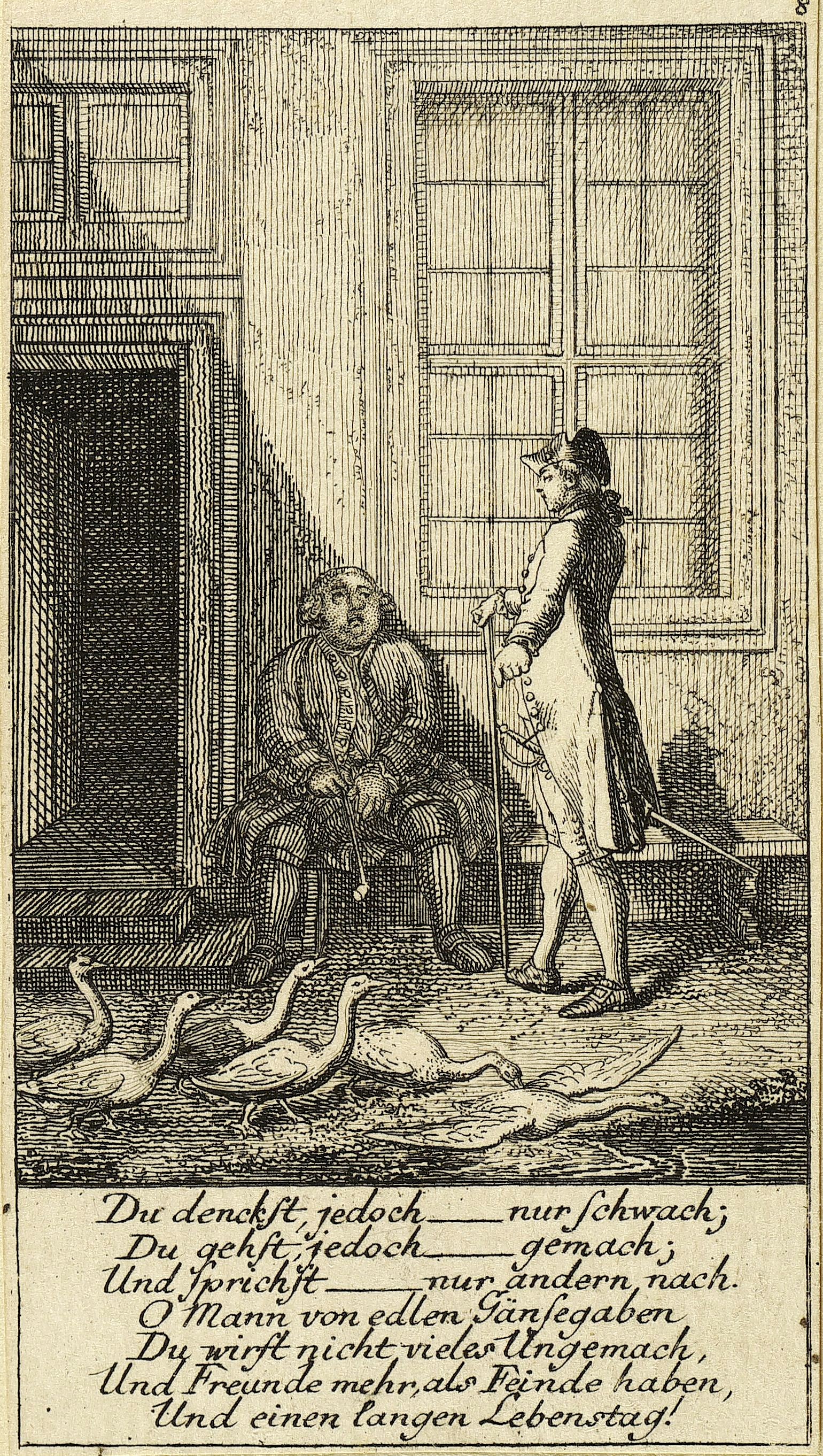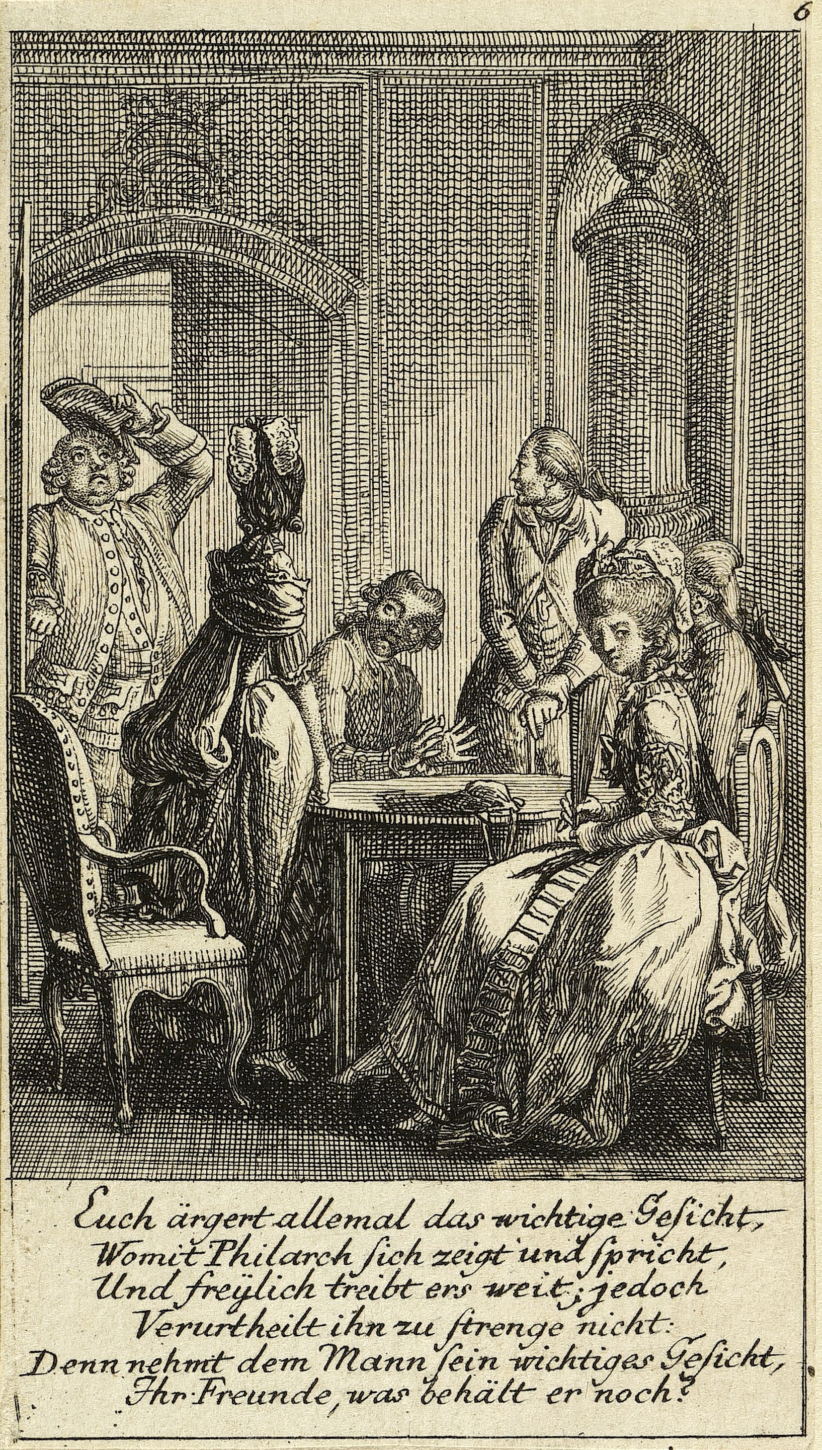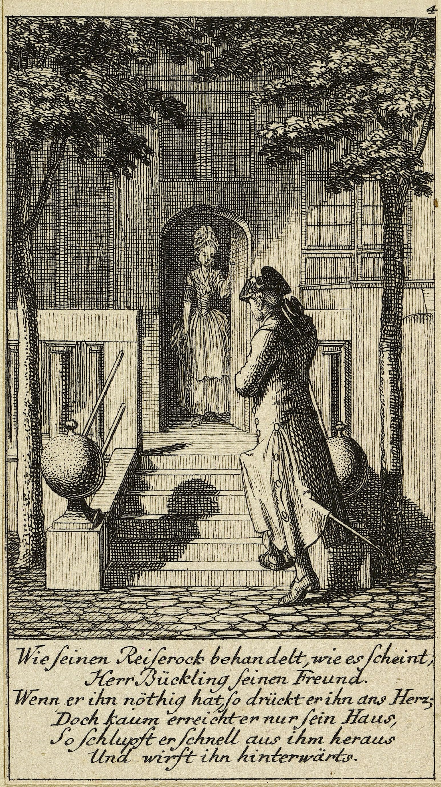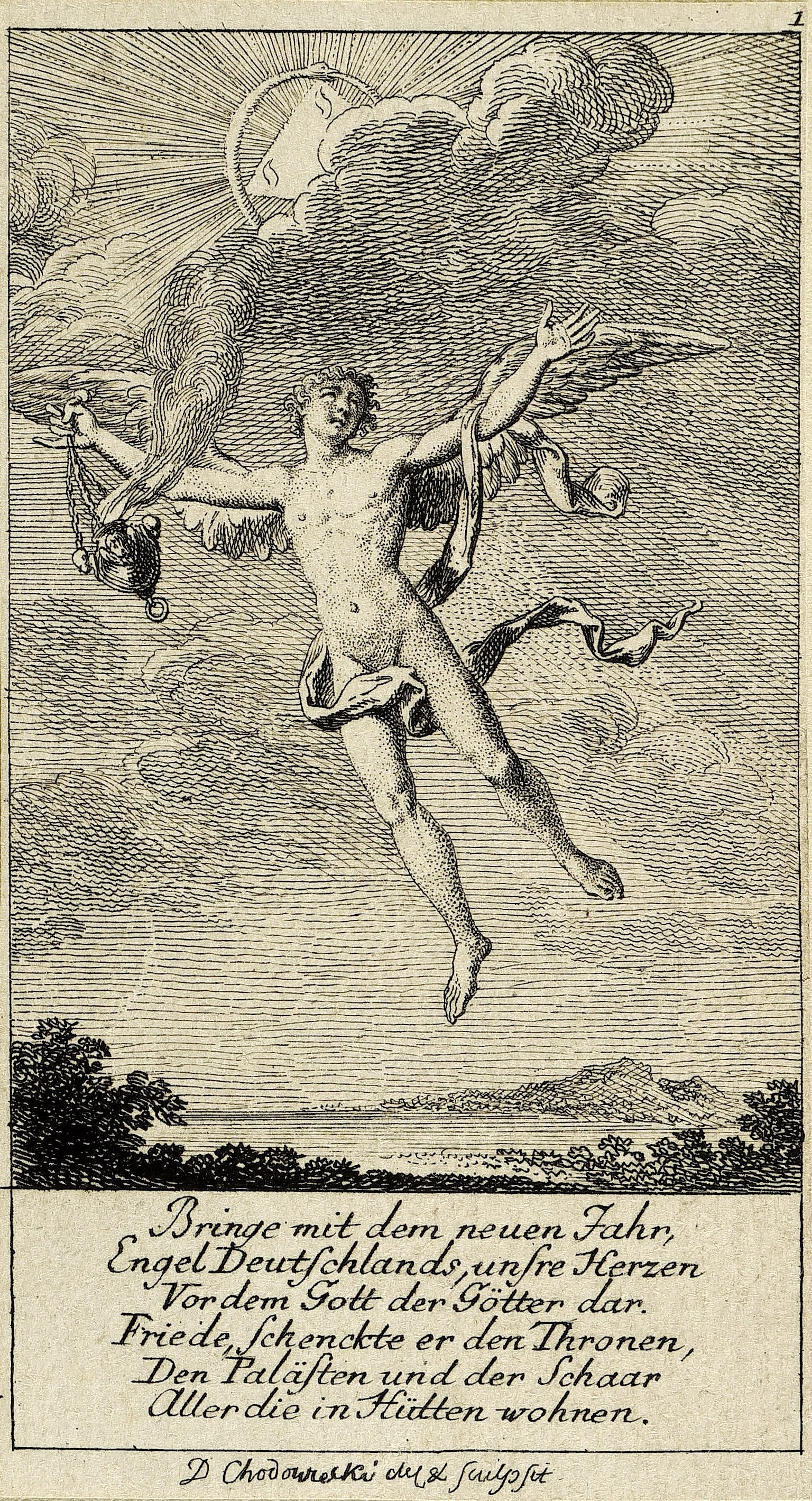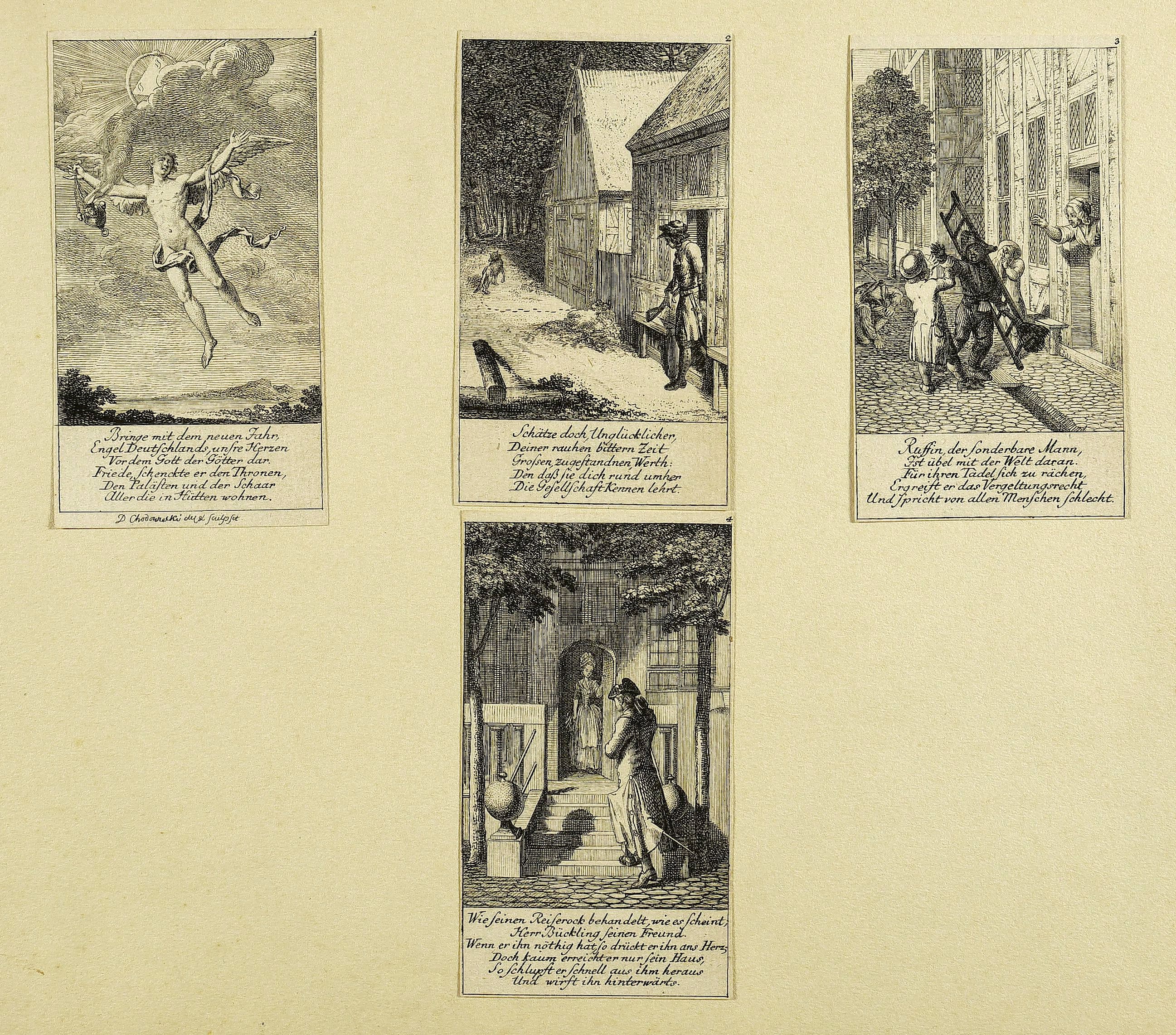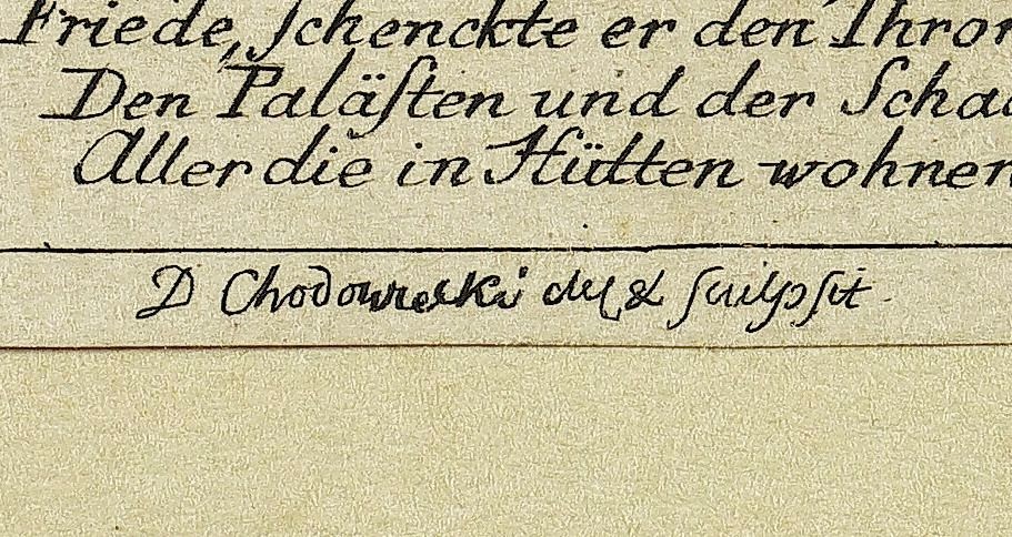 Daniel Nikolaus Chodowiecki (1726 Danzig - 1801 Berlin). Deutscher Kupferstecher, Grafiker und Illustrator. Bedeutender Vertreter der Kunst des Deutschen Klassizismus. Begann 1740 zunächst eine kaufmännische Lehre. Ab 1743 in der Haushaltswarenhandlung seines Onkels Antoine Ayrer in Berlin tätig. Letzterer unterstützte seine und seines Bruders Gottfried künstlerische Ausbildung und ließ beide von Johann Jakob Haid, Bernhard Rode und Johann Heinrich Meil unterrichten. Von den Ladengeschäften befreit, konnten sie sich 1754 mit Miniaturen und Emailmalereien selbstständig machen. Seit 1758 erste Radierversuche in allerlei Techniken wie Strichätzung, Aquatinta und Crayon-Manier. Frühe Verbindungen zu Verlegern von Almanachen und Kalendern beförderten diese Entwicklung. Vielbeschäftigt hat er Berlin nur selten verlassen. Eine längere Reise zu seiner Mutter nach Danzig im Jahre 1773 schlug sich dann entsprechend intensiv in seiner Arbeit nieder. Seit 1764 Mitglied der Königlich-Preußischen Akademie der Künste, ab 1797 deren Direktor.