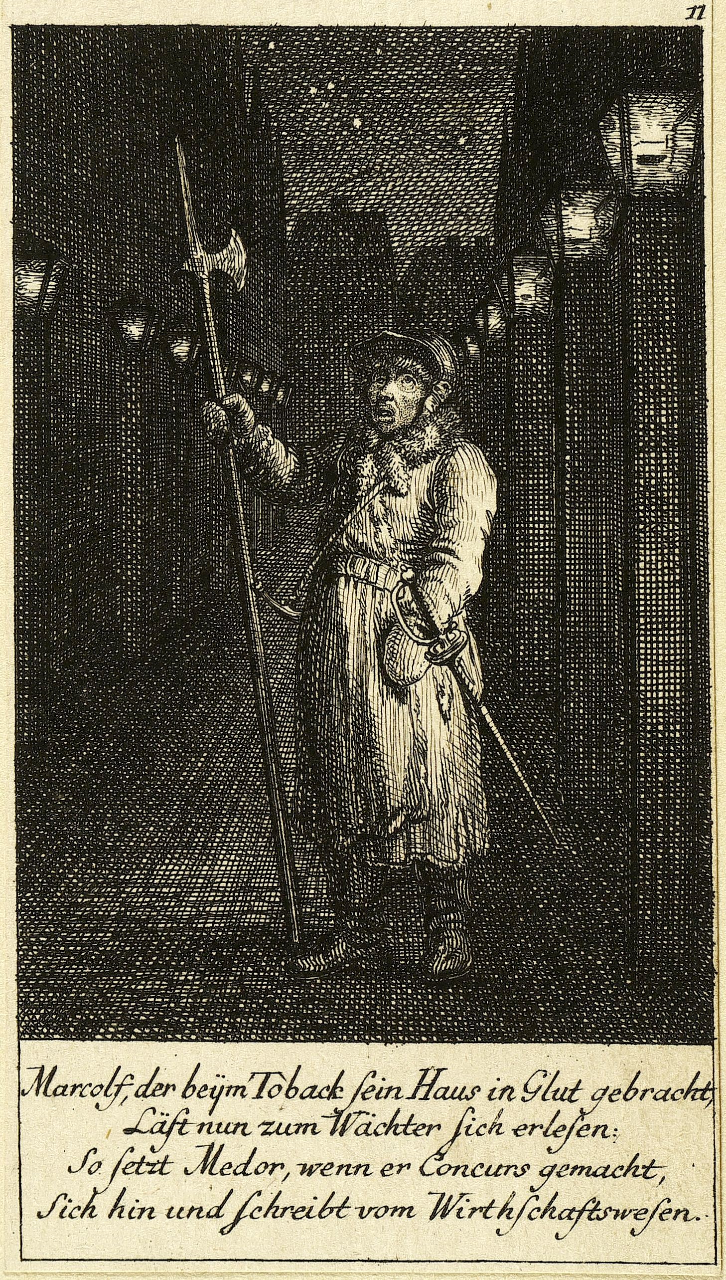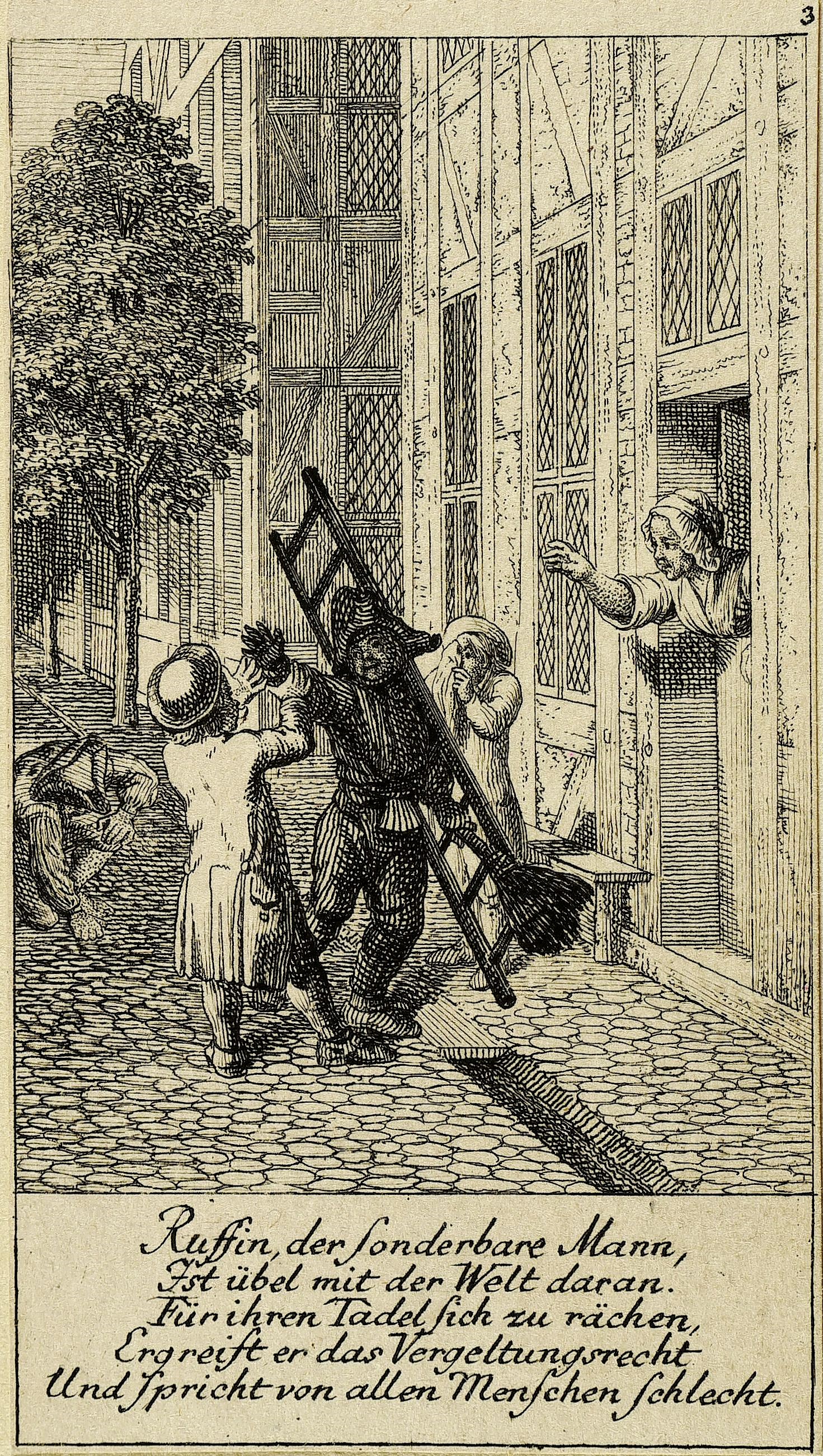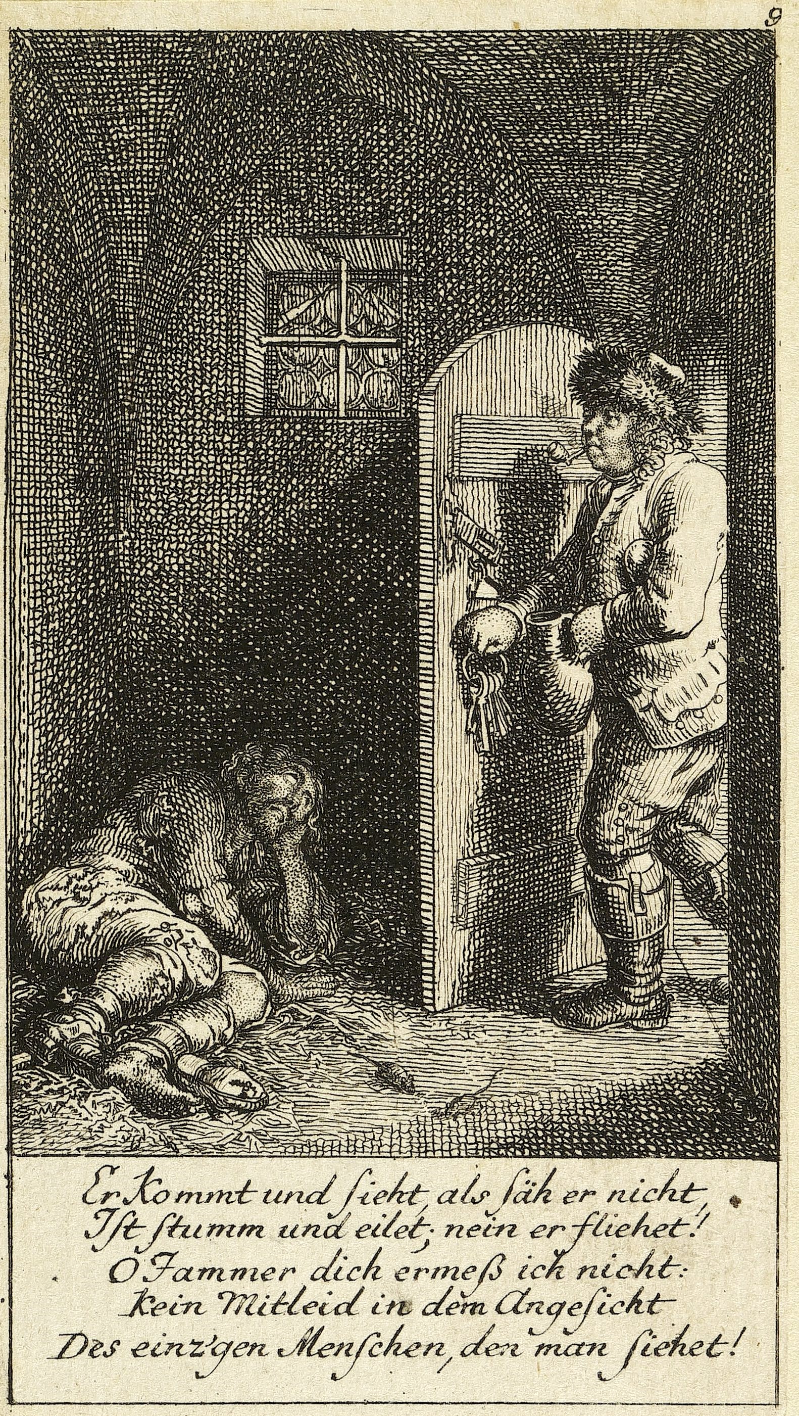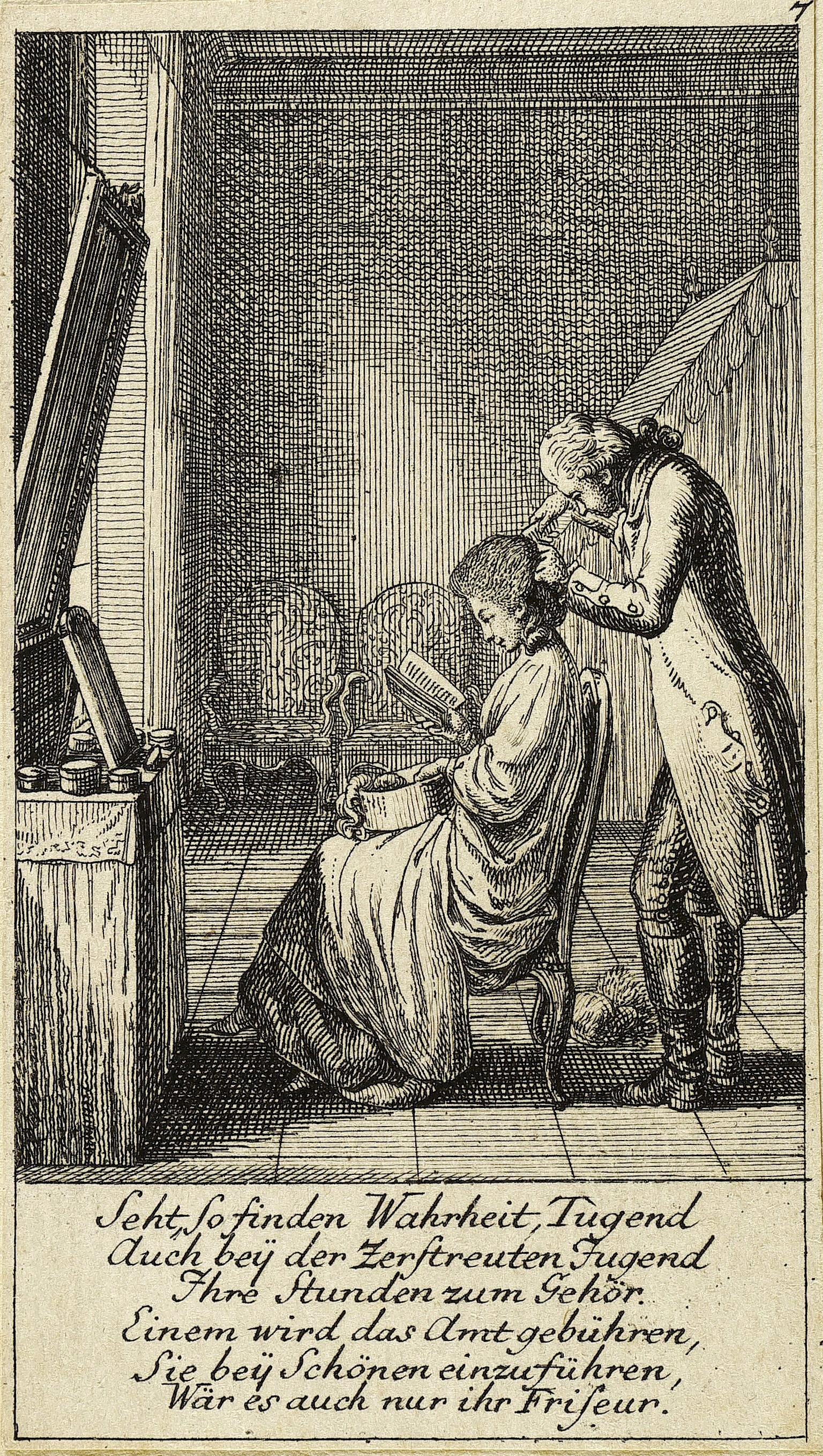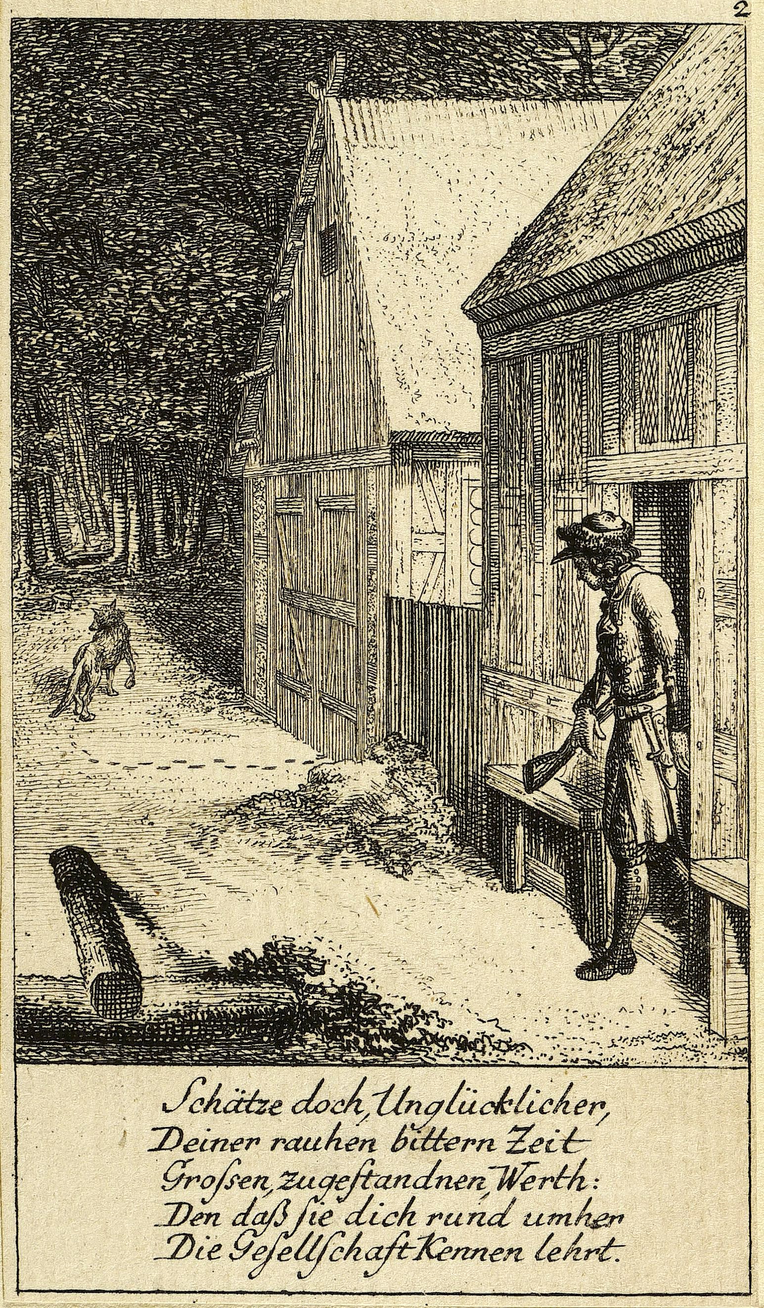 Daniel Nikolaus Chodowiecki (1726 Danzig - 1801 Berlin). Deutscher Kupferstecher, Grafiker und Illustrator. Bedeutender Vertreter der Kunst des Deutschen Klassizismus. Begann 1740 zunächst eine kaufmännische Lehre. Ab 1743 in der Haushaltswarenhandlung seines Onkels Antoine Ayrer in Berlin tätig. Letzterer unterstützte seine und seines Bruders Gottfried künstlerische Ausbildung und ließ beide von Johann Jakob Haid, Bernhard Rode und Johann Heinrich Meil unterrichten. Von den Ladengeschäften befreit, konnten sie sich 1754 mit Miniaturen und Emailmalereien selbstständig machen. Seit 1758 erste Radierversuche in allerlei Techniken wie Strichätzung, Aquatinta und Crayon-Manier. Frühe Verbindungen zu Verlegern von Almanachen und Kalendern beförderten diese Entwicklung. Vielbeschäftigt hat er Berlin nur selten verlassen. Eine längere Reise zu seiner Mutter nach Danzig im Jahre 1773 schlug sich dann entsprechend intensiv in seiner Arbeit nieder. Seit 1764 Mitglied der Königlich-Preußischen Akademie der Künste, ab 1797 deren Direktor.