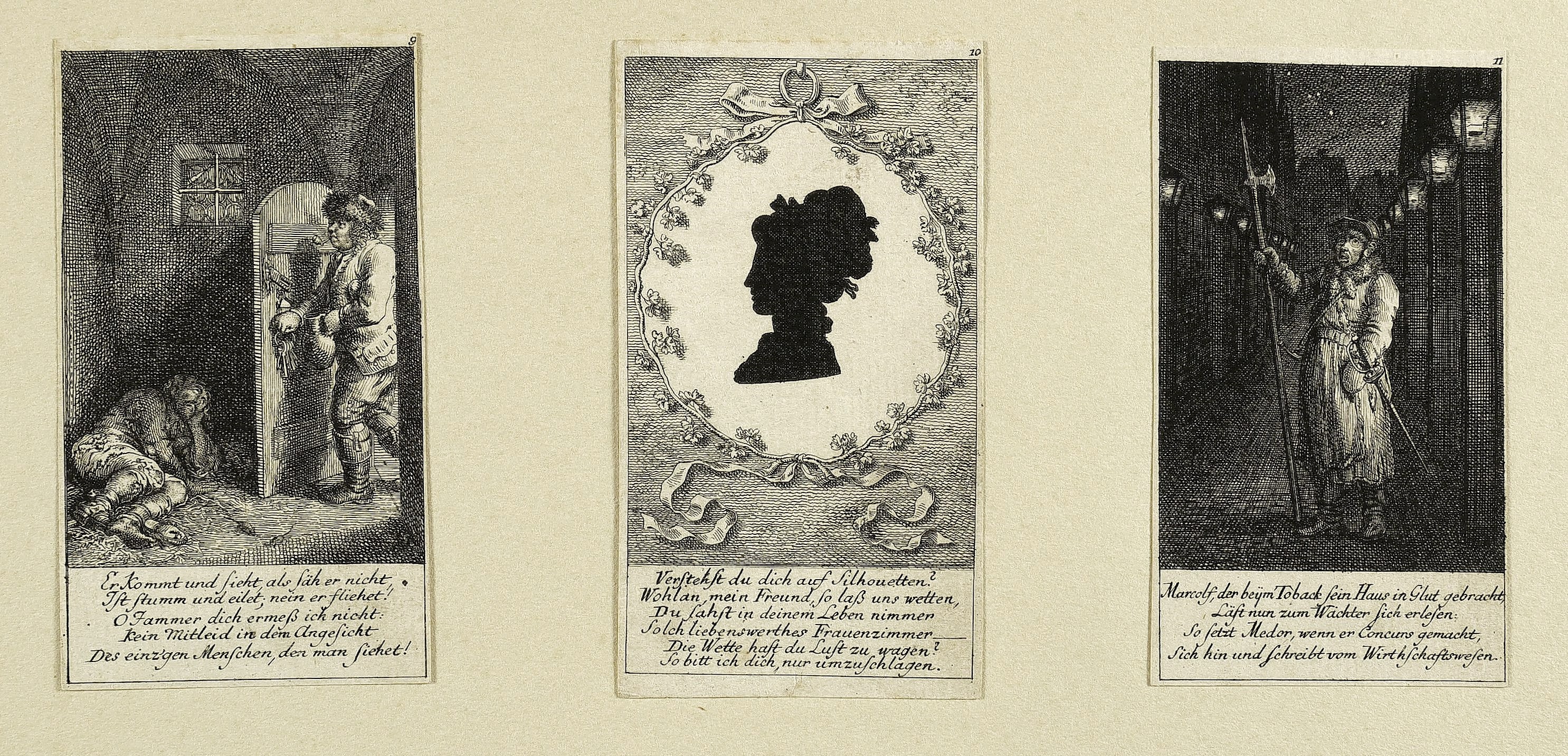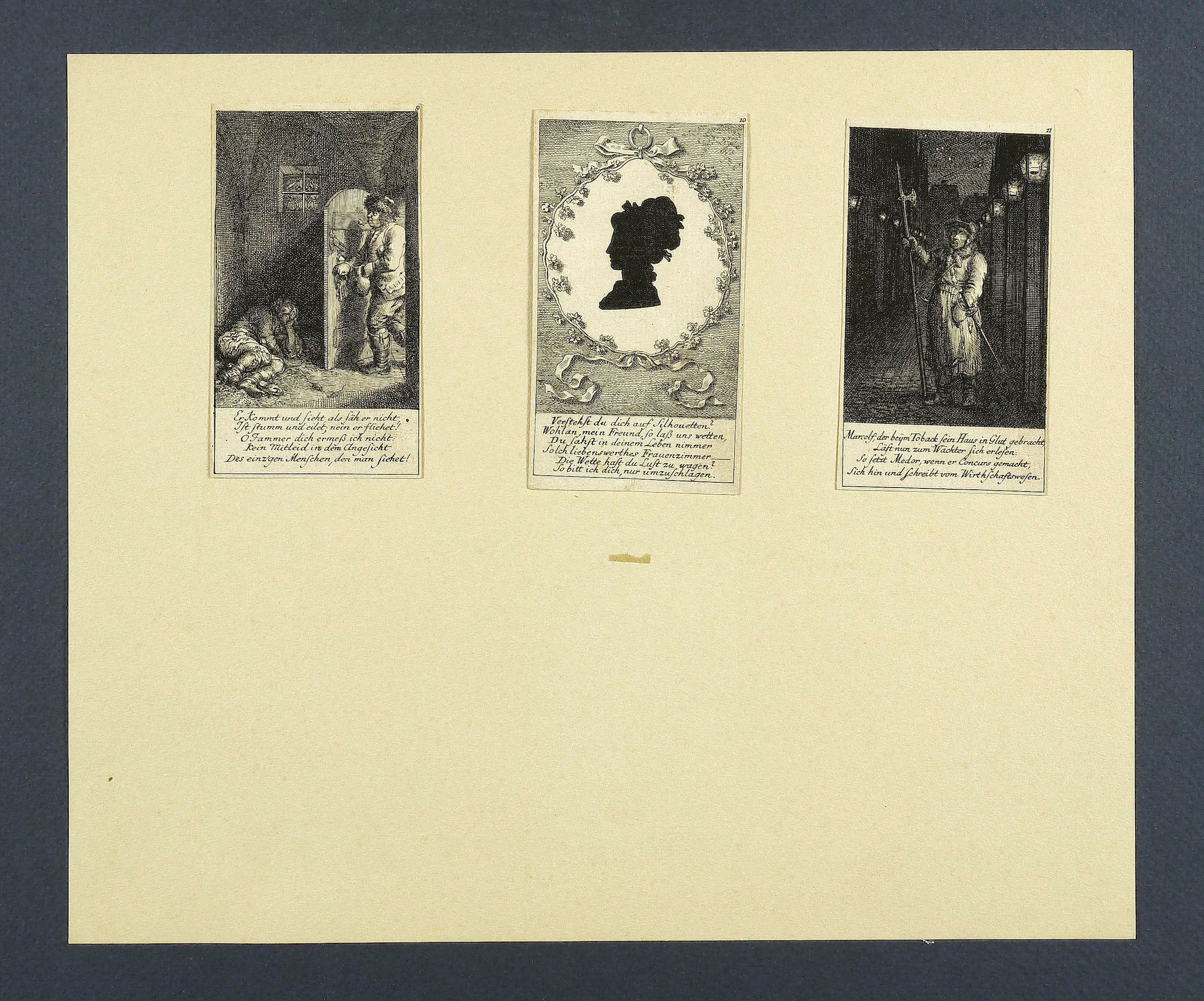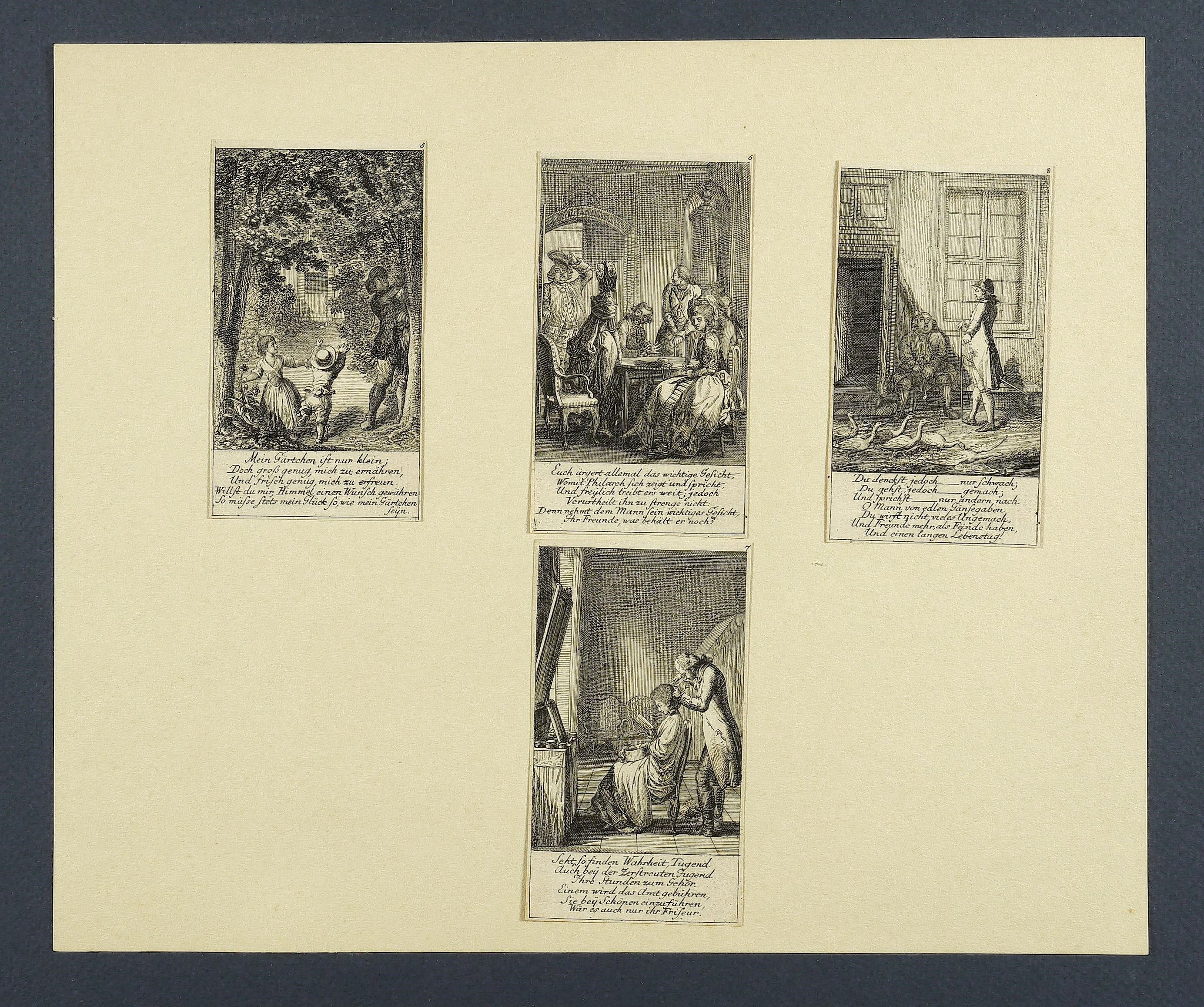 1779. Radierung / Strichätzung. – Originale Künstlergrafik, von Daniel Nikolaus Chodowiecki. – 8,8 x 5,0 cm (Darstellungen), 9,2 x 5,2 cm (Blätter), 22 x 26 cm (Trägerblatt).