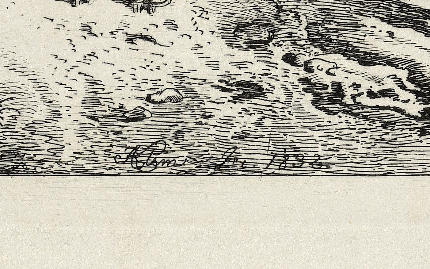 Johann Adam Klein (1792 Nürnberg - 1875 München). Deutscher Maler und Radierkünstler des Biedermeier. Erster Zeichenunterricht mit 8 Jahren bei dem Maler Georg Christoph von Bemmel. Ab 1805 Lehrling im Atelier des Kupferstechers Ambrosius Gabler. 1811 Schüler der von Gustav Philipp Zwinger geleiteten Nürnberger Zeichenschule. 1811-18 Studium an der Kunstakademie in Wien. Während einer Reise an Rhein und Main 1815 Begegnung mit dem Werk des Malers Wilhelm von Kobell. 1818 Reise ins Salzkammergut mit Johann Christoph Erhard, den Brüdern Friedrich Philipp und Heinrich Reinhold und Ernst Welker. 1819/20 Italienaufenthalt. 1839 Umsiedelung nach München und Heirat der Tochter des Kupferstechers Wolf. Mit seinen zahlreichen Tierstücken zählt Klein zu den wichtigsten Radierkünstlern des frühen 19. Jahrhunderts.