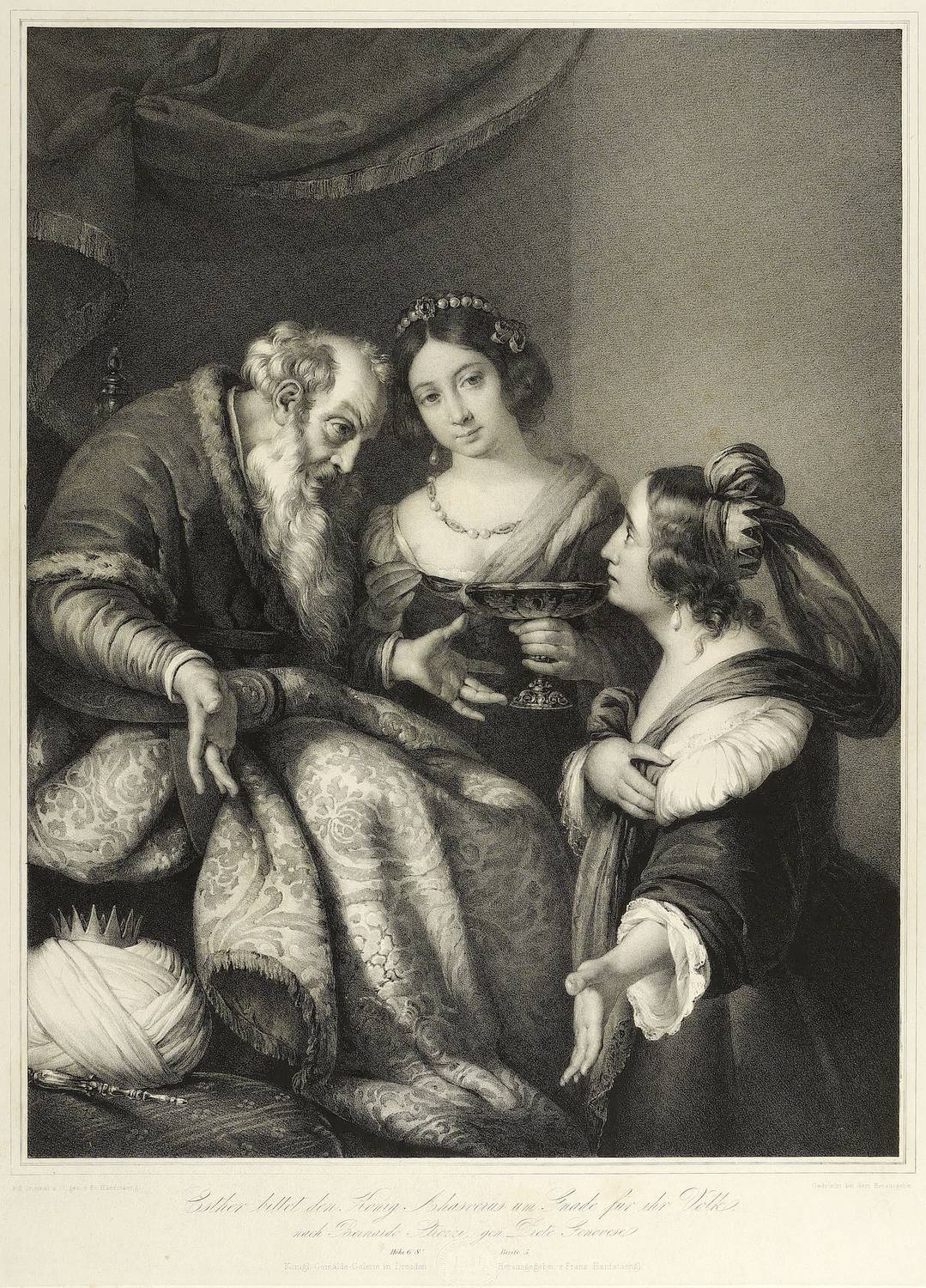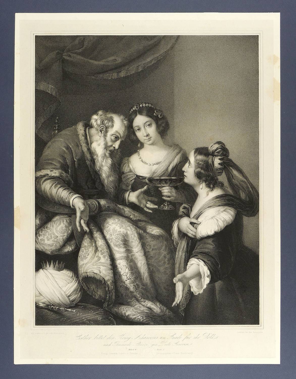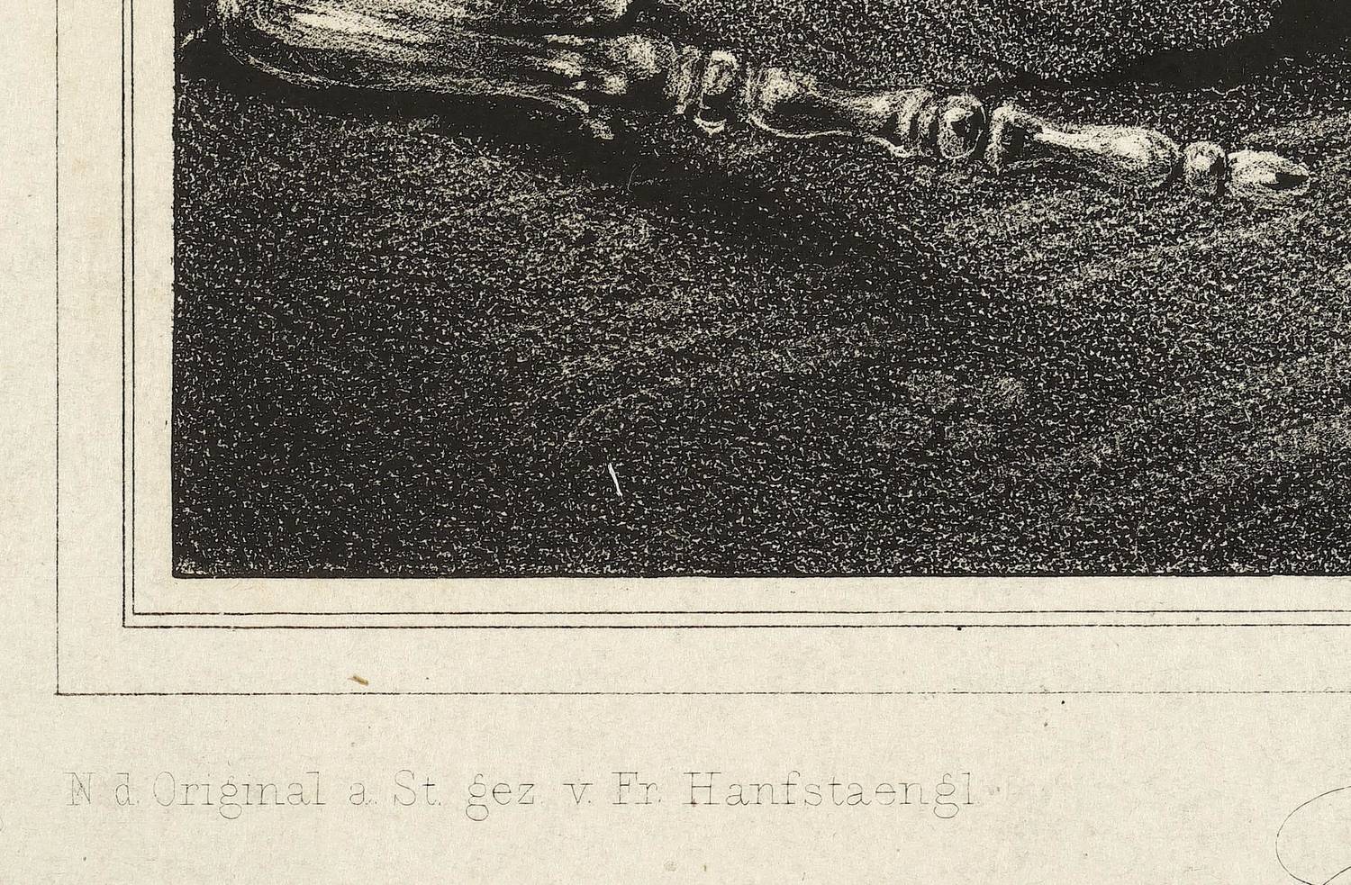 Aus: Franz Seraph Hanfstaengl, Die vorzüglichsten Gemälde der königlichen Gallerie in Dresden (Dresden: Hanfstaengl 1836-1846). – Links unter der Darstellung signiert "N. d. Original a. St. gez. v. Fr. Hanfstaengl." Unterhalb lithografierter Titel sowie Trockenstempel und Verlegeradresse. – Bei leichten Mängeln, wenigen Flecken im Rand, mäßig gut erhalten