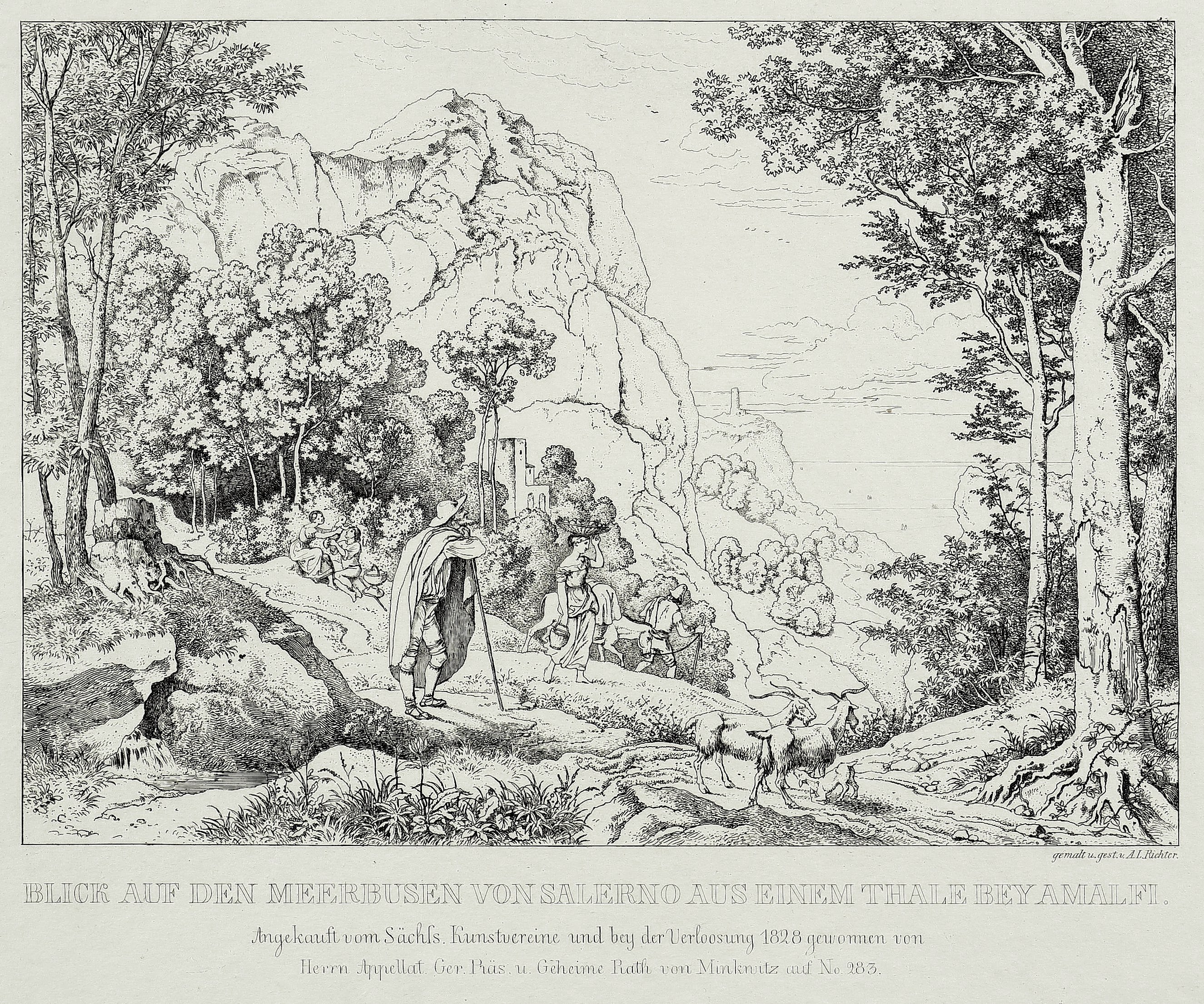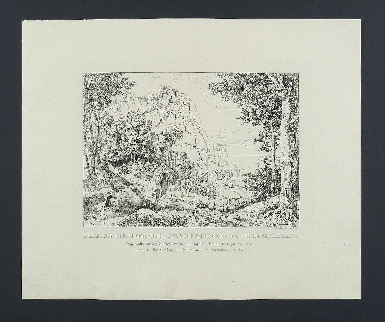 Kovalevski B-C 4. Hoff-Budde 185 III (von III). – In der Platte rechts unten signiert: ″gemalt u. gest. v. A.L. Richter.″ Darunter betitelt und bezeichnet ″Angekauft vom Sächs. Kunstvereine und bey der Verloosung 1828 gewonnen von Herrn Apellat. Ger. Präs. u. Geheime Rath von Minkwitz auf No. 283.″ – Blatt etwas beschnitten. Sonst sehr guter Erhaltungszustand.