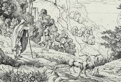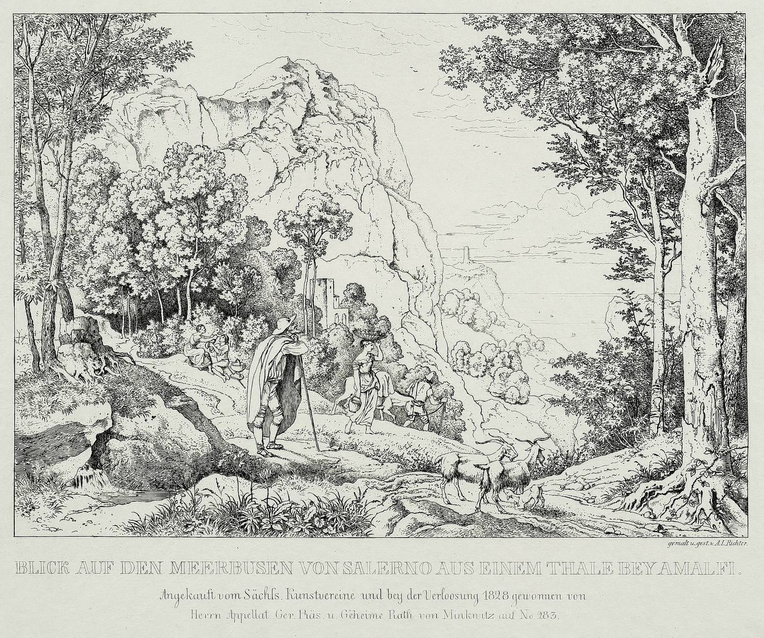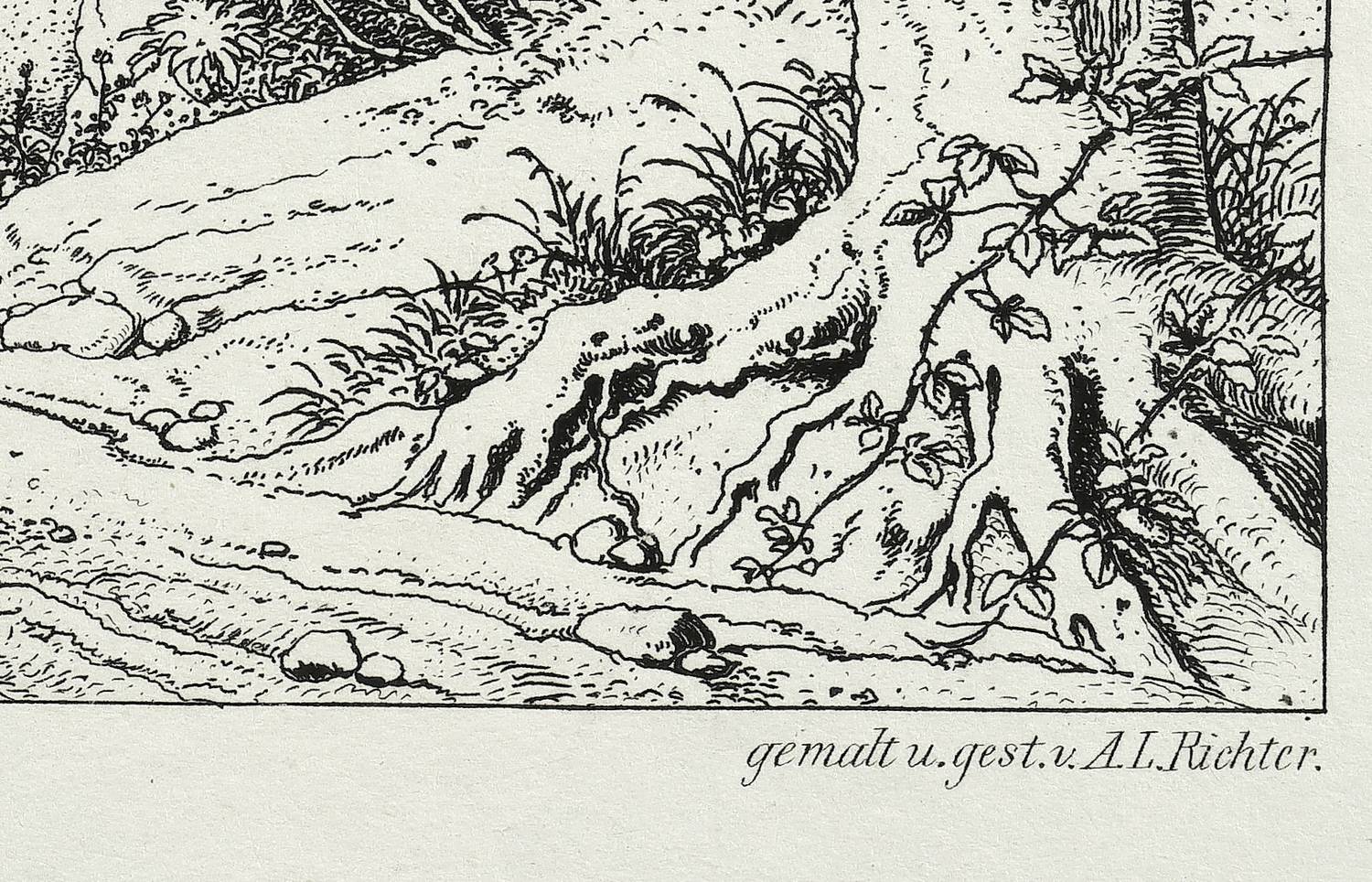 Adrian Ludwig Richter (1803 Dresden - 1884 Dresden). Bedeutender Maler, Zeichner und Grafiker der deutschen Romantik und des Biedermeier. Sohn des Zeichners und Kupferstechers Carl August Richter. Nach der Schulzeit begann er 1815 als Lehrling seines Vaters, studierte daneben an der Kunstakademie in Dresden. 1820/21 begleitete er den russischen Fürst Narischkin als Zeichner auf einer Reise nach Paris. 1823-26 reiste er nach Italien, wo er unter anderen mit Joseph Anton Koch und Julius Schnorr von Carolsfeld zusammentraf. Dies prägte seine idealistisch-harmonische Landschaftsauffassung. 1828-35 lehrte er an der Zeichenschule der Porzellanmanufaktur in Meißen, wo Gottfried Pulian zu seinen Schülern zählte. 1826 wurde er als Lehrer für Lasndschaftsmalerei an die Dresdner Kunstakademie berufen. Für die Reihe „Das malerische und romantische Deutschland“ des Leipziger Verlegers Georg Wigand schuf er die Ansichten für die Bände zu Harz, Franken und Riesengebirge. In den späten 1830er Jahren begann er mit Holzschnitt-Illustrationen für Bücher, die ihn unter einem größeren Laienpublikum in Deutschland bekannt machten. Schließlich wurde er zum Professor für Landschaftsmalerei in Dresden ernannt. 1873 musste er aufgrund eines Augenleidens mit dem Malen aufhören und schied 1876 aus der Kunstakademie in Dresden aus.