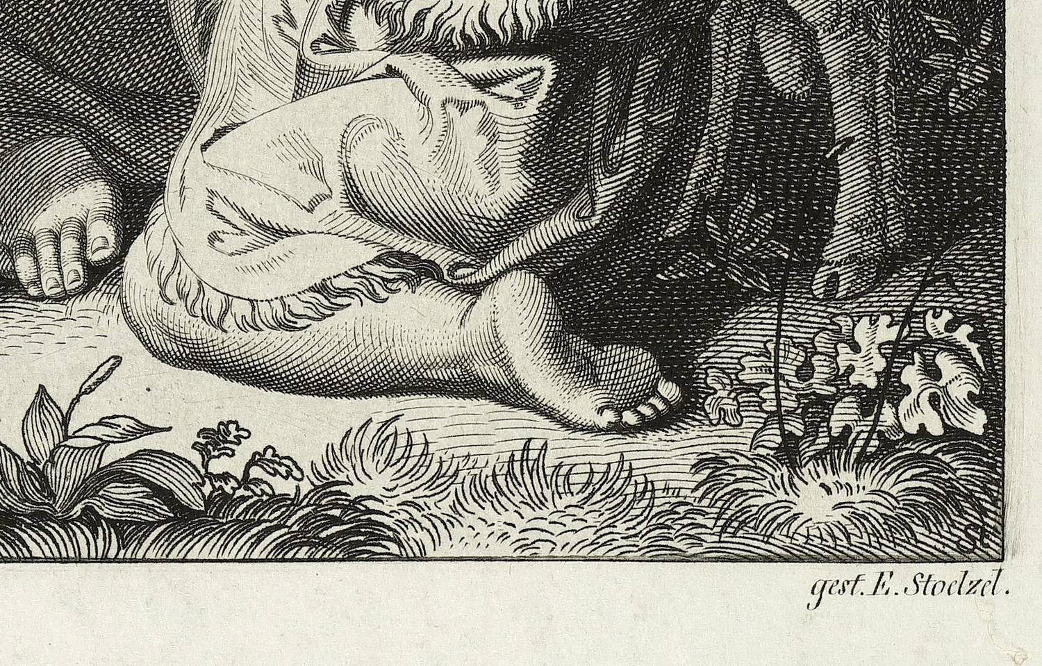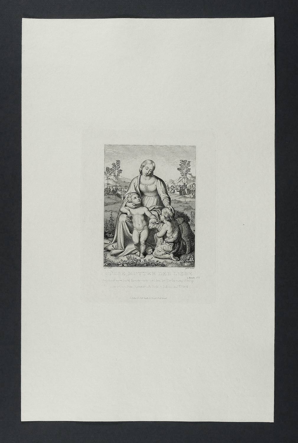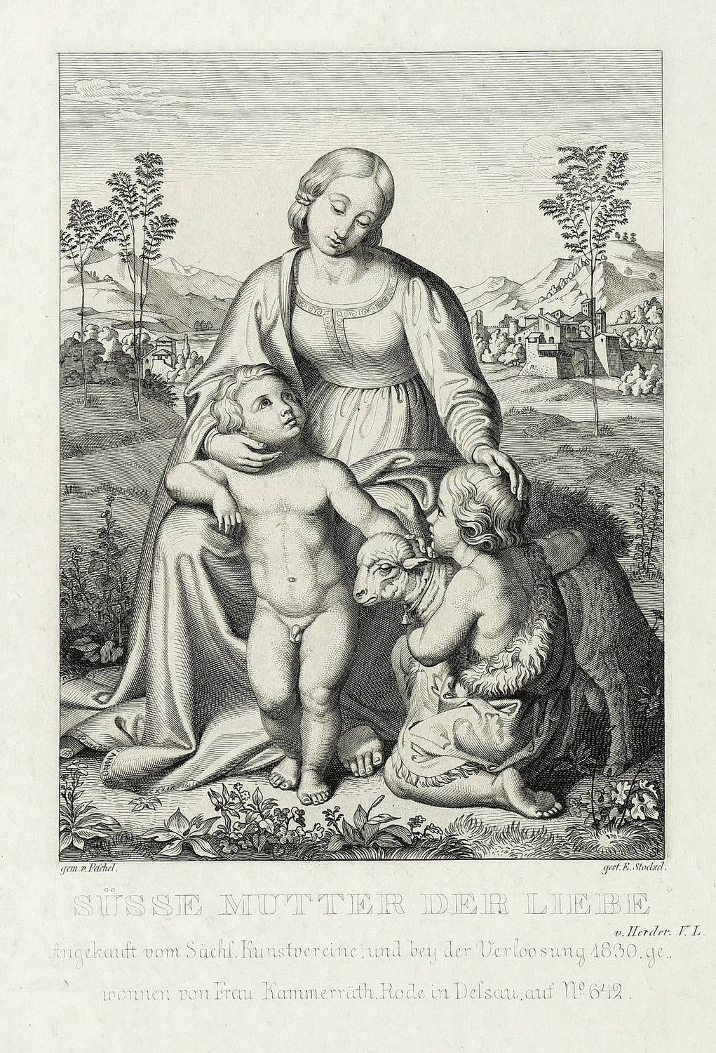 Kovalevski B-C 30. – Aus: Bilderchronik des Sächsischen Kunstvereins (Dresden: Sächsischer Kunstverein 1828-1836). – In der Platte direkt unter der Darstellung bezeichnet: "gem. v. Peschel // gest. E. Stölzel." In der Mitte betitelt und bezeichnet "Angekauft vom Sächs. Kunstvereine und bey der Verloosung 1830. gewonnen von Frau Kammerräth. Rode in Dessau. auf No. 642." – Breitrandiges Blatt in sehr gutem Erhaltungszustand.