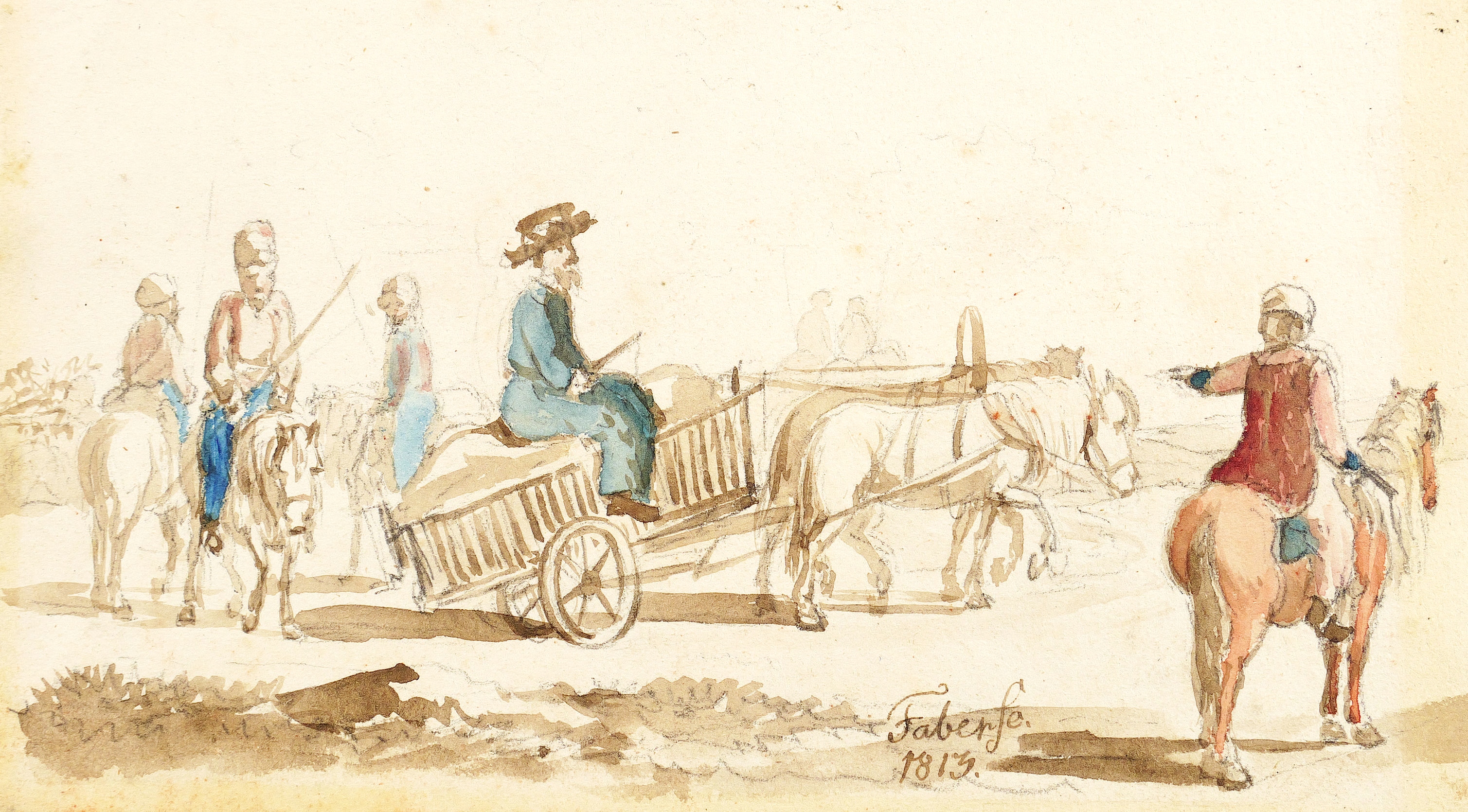In brauner Feder unten signiert und datiert: ″Faber fc. / 1813.″ – Szene zeigt wohl das Biwak (Feldlager) russischer Kosaken in den Befreiungskriegen 1813-1815 im näheren zeitlichen Zusammenhang der Völkerschlacht bei Leipzig. - Vgl. die Zeichnungen ″Feldlager der Franzosen im Wald am 2. Juli 1813″ (1813, Aquarell über Feder und Bleistift, Kupferstich- Kabinett Dresden, Inv.-Nr. C 2010-400) und ″Das Essen am 10. August 1813″ (1813, Aquarell, Kupferstich-Kabinett Dresden, ohne Inv.-Nr. A, 4, INT XVIII-XIX, Samml. Hentschel). – Papier auf der Rückseite in bräunlicher Fettkreide gefasst. Ältere Montagespuren. Insgesamt gut erhalten.
