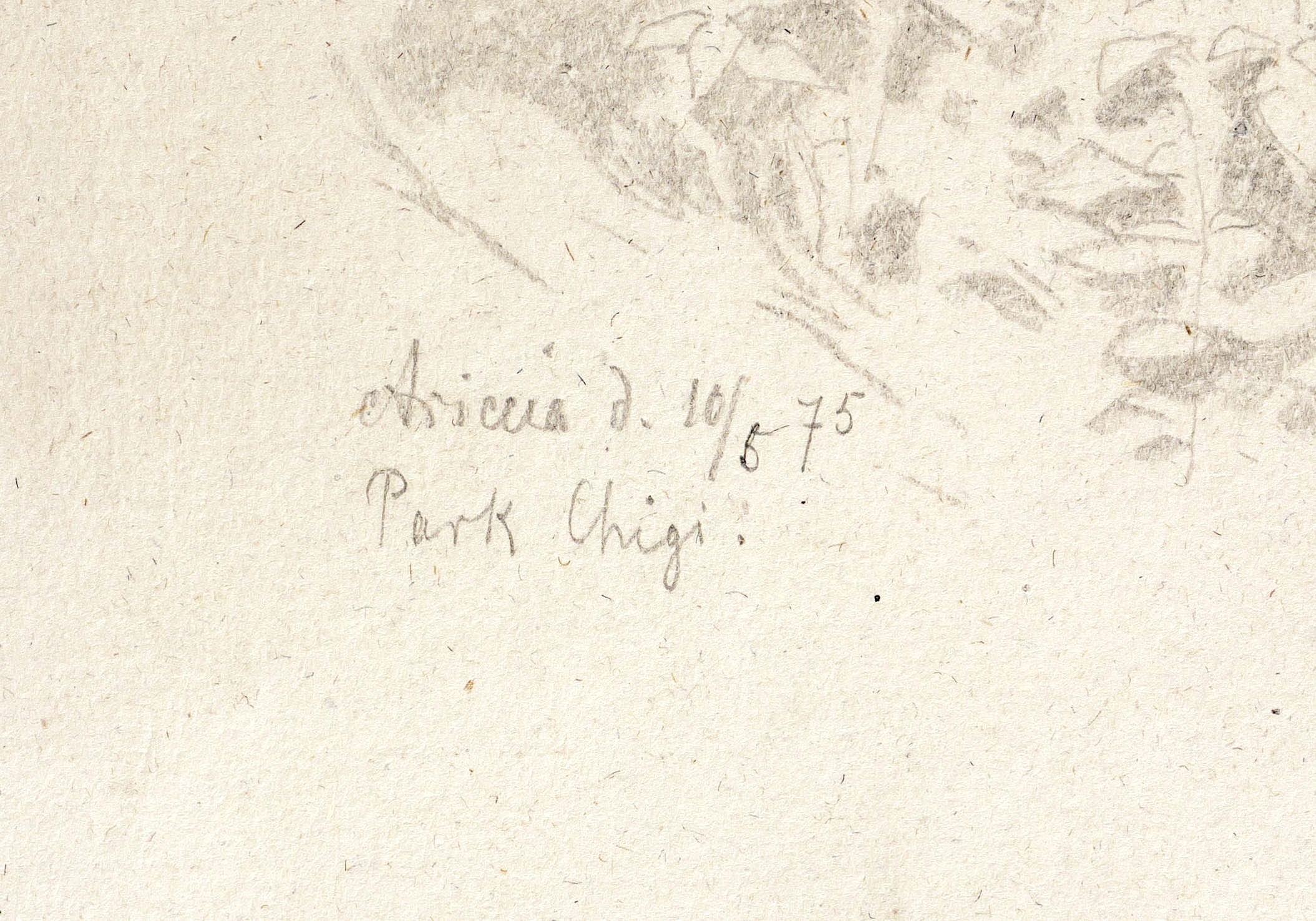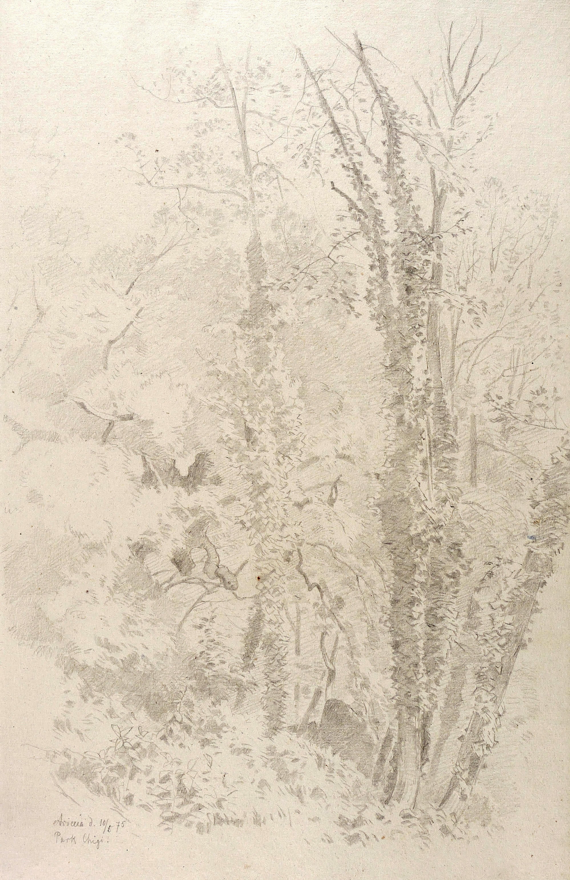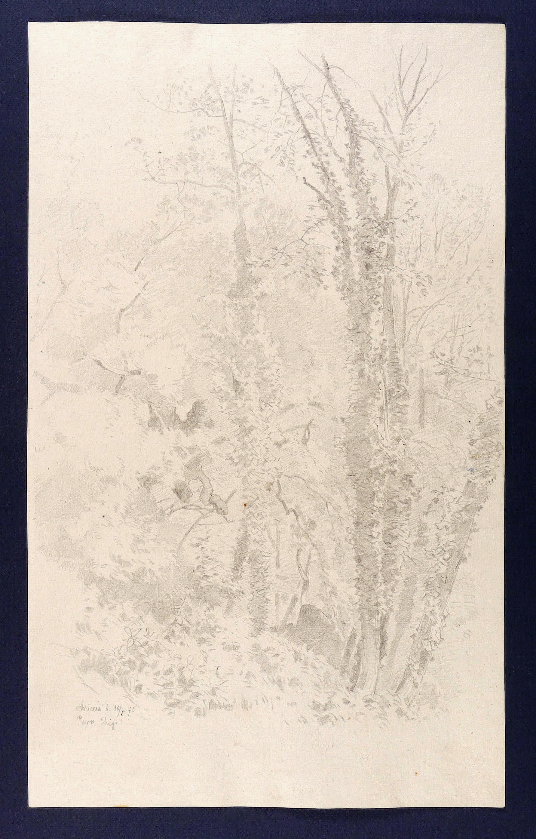 Links unten in Bleistift bezeichnet: ″Ariccia d. 10/5 75 / Park Chigi.″ Verso Sammlernotiz: ″Aus Louis Neuberts Skizzenbuch″. – Weitgehend tadellos. Sehr guter Zustand.