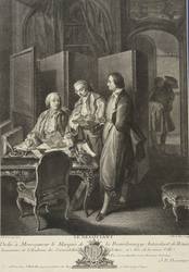 Rechts unterhalb der Darstellung signiert, mittig darunter betitelt. Verlegeradresse: Jacques Philippe Le, Bas Paris. Mit einer Widmung an Marquis de La Bourdonnaye. – Blatt bis auf die Plattenkante beschnitten und verso mit Resten vormaliger Montierung. Insgesamt aber dem Alter entsprechend guter Erhaltungszustand.
