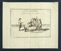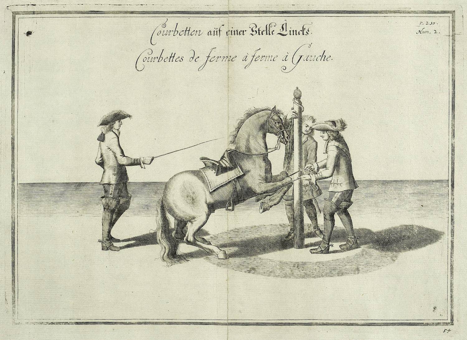 Aus: William Cavendish of Newcastle, Wilhelms Herzogs von Neukastel neueröfnete Reitbahn oder vollkommener Stallmeister (Nürnberg: Raspe / Raspische Buchhandlung 1764). – Innerhalb der Darstellung deutsch und französisch betitelt: "Courbetten auf einer Stelle Lincks. / Courbettes de ferme à ferme à Gauche". Rechts oben und unten nummeriert. – Blatt mit entfernter mittiger Bugfalte und fachkundig auf Japan aufgezogen. Im oberen Rand etwas knickspurig. Insgesamt eher mäßiger Zustand.