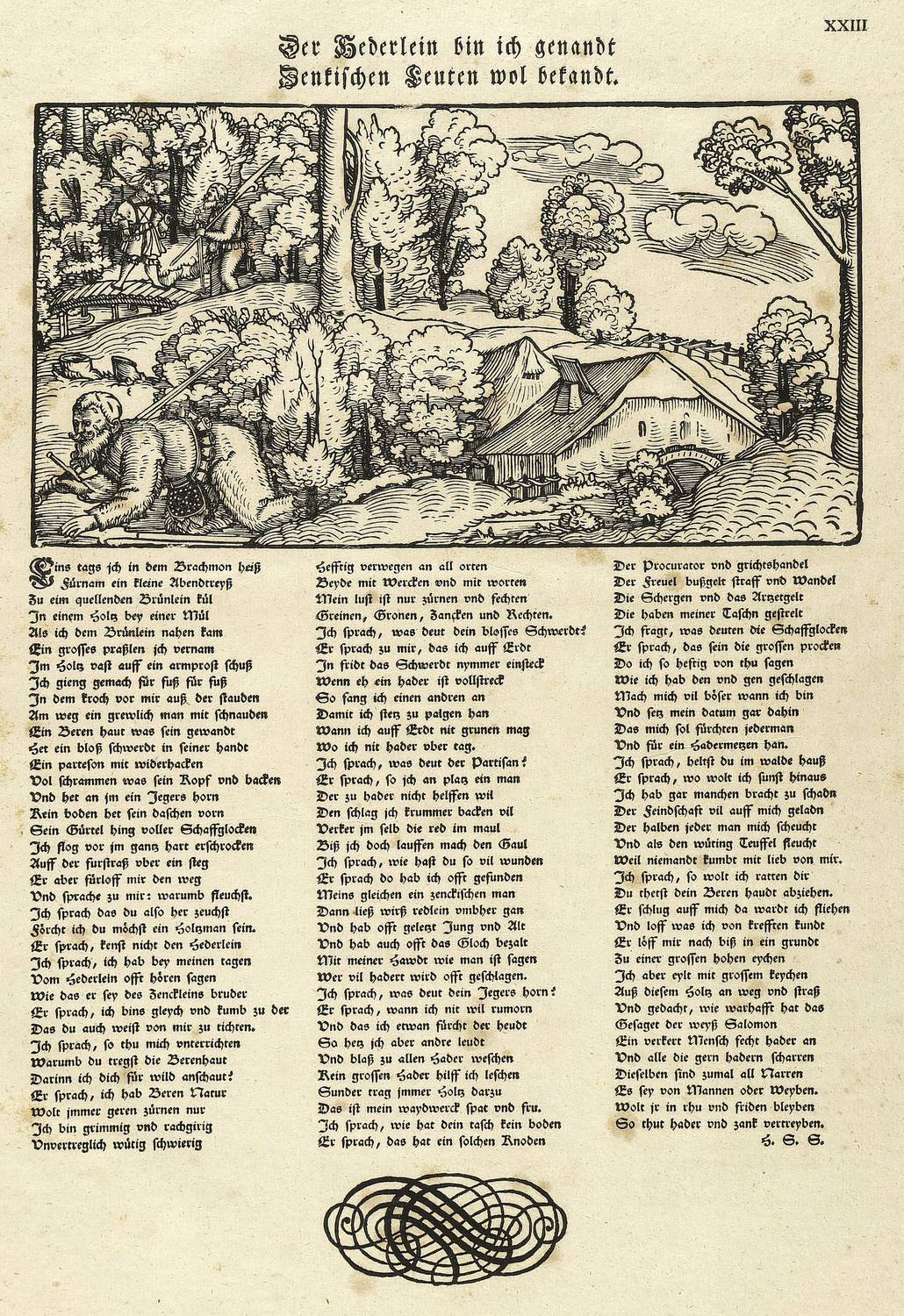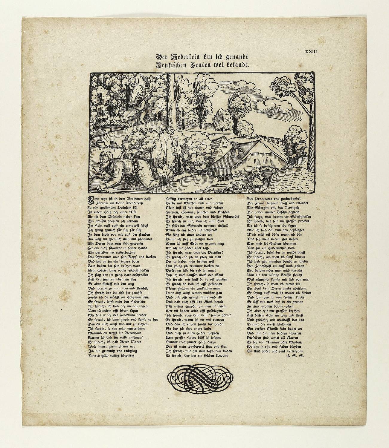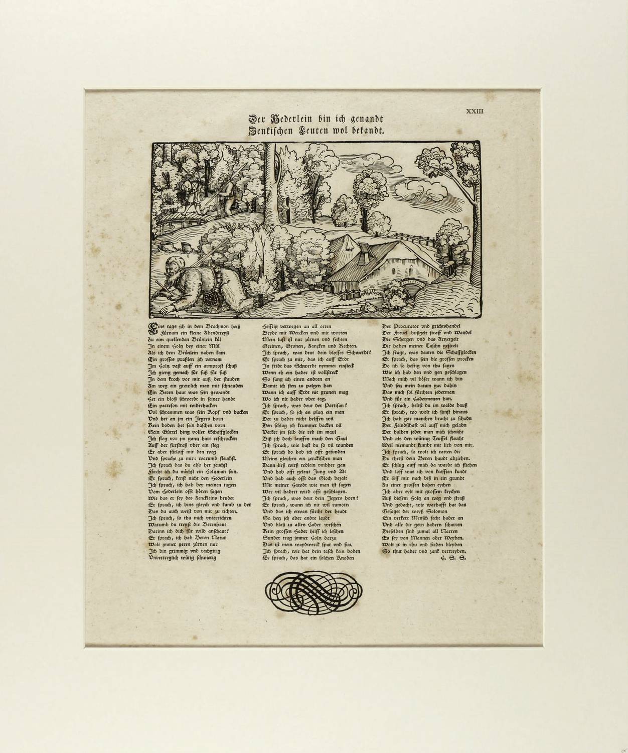 Aus: Hans Sachs, Hans Sachs im Gewande seiner Zeit (Gotha: Rudolf Zacharias Becker 1821). – Oberhalb der Darstellung typografisch betitelt: ″Der Hederlein bin ich genandt / Zenkischen Leuten wol bekandt.″ Darunter das Gedicht von Hans Sachs. – Das 1535 entstandene Gedicht erschien ursprünglich als Einblattdruck. - Der Holzschnitt ist ein Abdruck vom originalen Druckstock. – Das derbe Büttenpapier teils leicht fleckig und schwach gebräunt. Sonst guter Erhaltungszustand. Im Passepartout montiert.