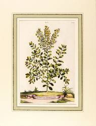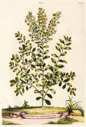 Aus: Abraham Munting, Naauwkeurige Beschryving der Aardgewassen. waar in de veelerley aart en bijzondere eigenschappen der boomen, heesters, kruyden, bloemen met haare vrugten, zaden, wortelen en bollen, neevens derzelver waare voortteeling gelukkige aanwinning, en heylzaame geneeskrachten, na een veel-jarige oeff (Leyden & Utrecht: Pieter van der Aa & Francois Halma 1696). – Auf dem Schriftband in der Darstellung betitelt. Im oberen Plattenrand nummeriert. – Die dargestellte Pflanze wird heute als Hypericum chapmanii W.P. Adams bezeichnet. – Blatt in ein Passepartout montiert und leicht randrissig. Fleck im rechten Rand. Dem Alter entsprechend guter Zustand.