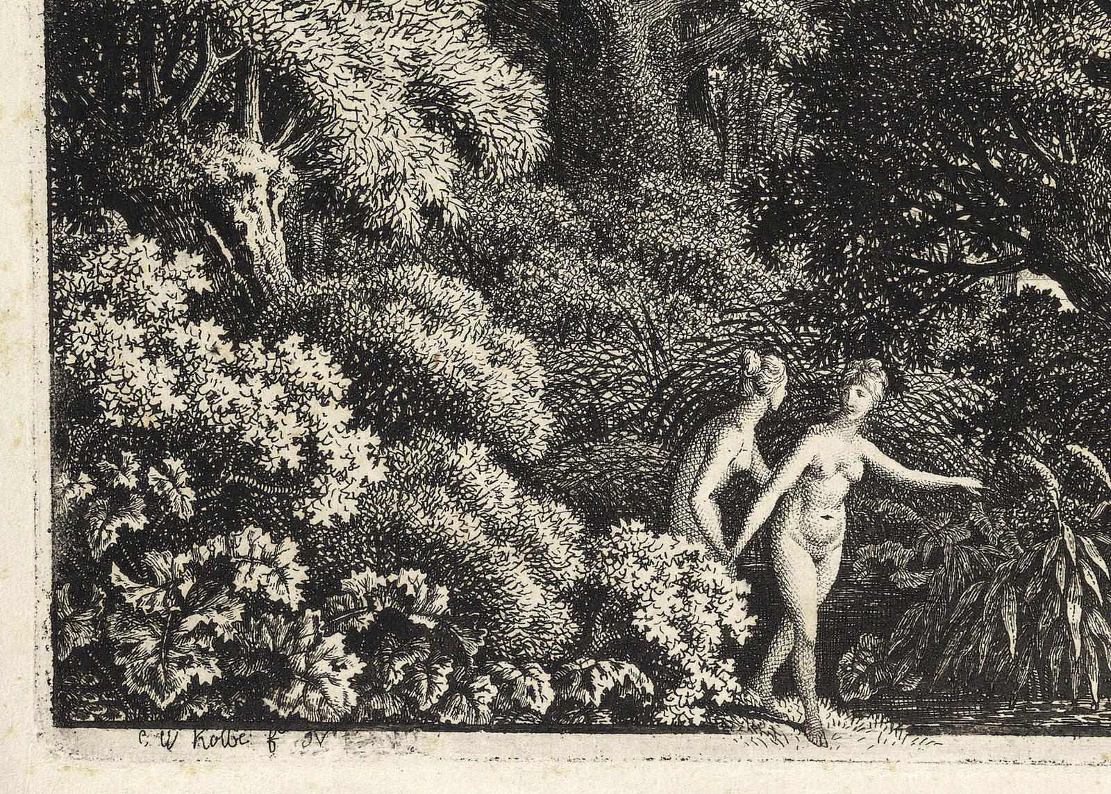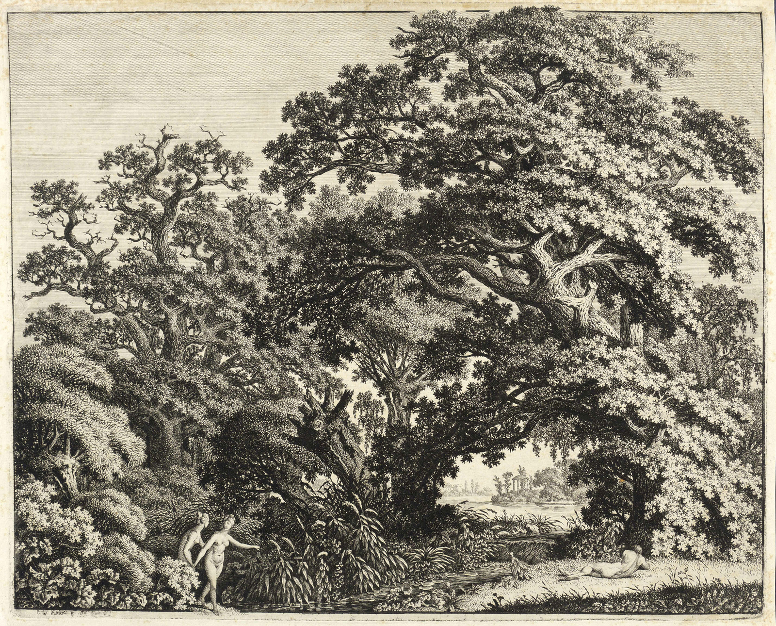 Martens 208 I (von II). – Im Plattenrand links unten signiert: ″C.W. Kolbe f. N″. Verso Sammlernotizen in Bleistift. – Mit der links unten schon gelöschten alten Nummer sowie der links oben noch fehlenden neuen Nummer streng genommen ein Zustand zwischen den bei Martens gelisteten Zuständen I und II. - Bei Martens beschrieben: ″Üppiges Eichenwaldstück an einem See. Vorn links zwei nackte Mädchen, rechts liegender Jüngling.″ – Schmaler Rand um die Platte. Papier mit leichten Knickspuren etwas gebräunt und gering fleckig. Sonst guter Zustand.