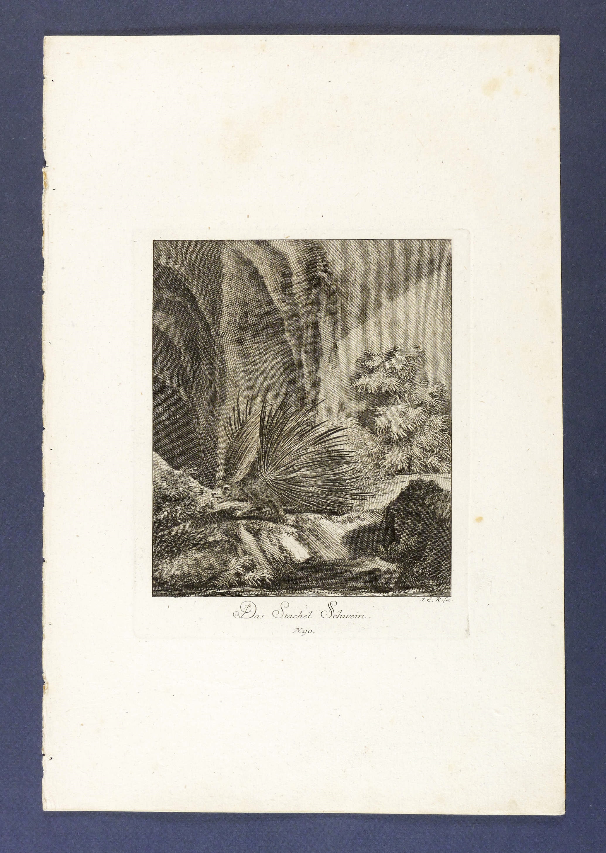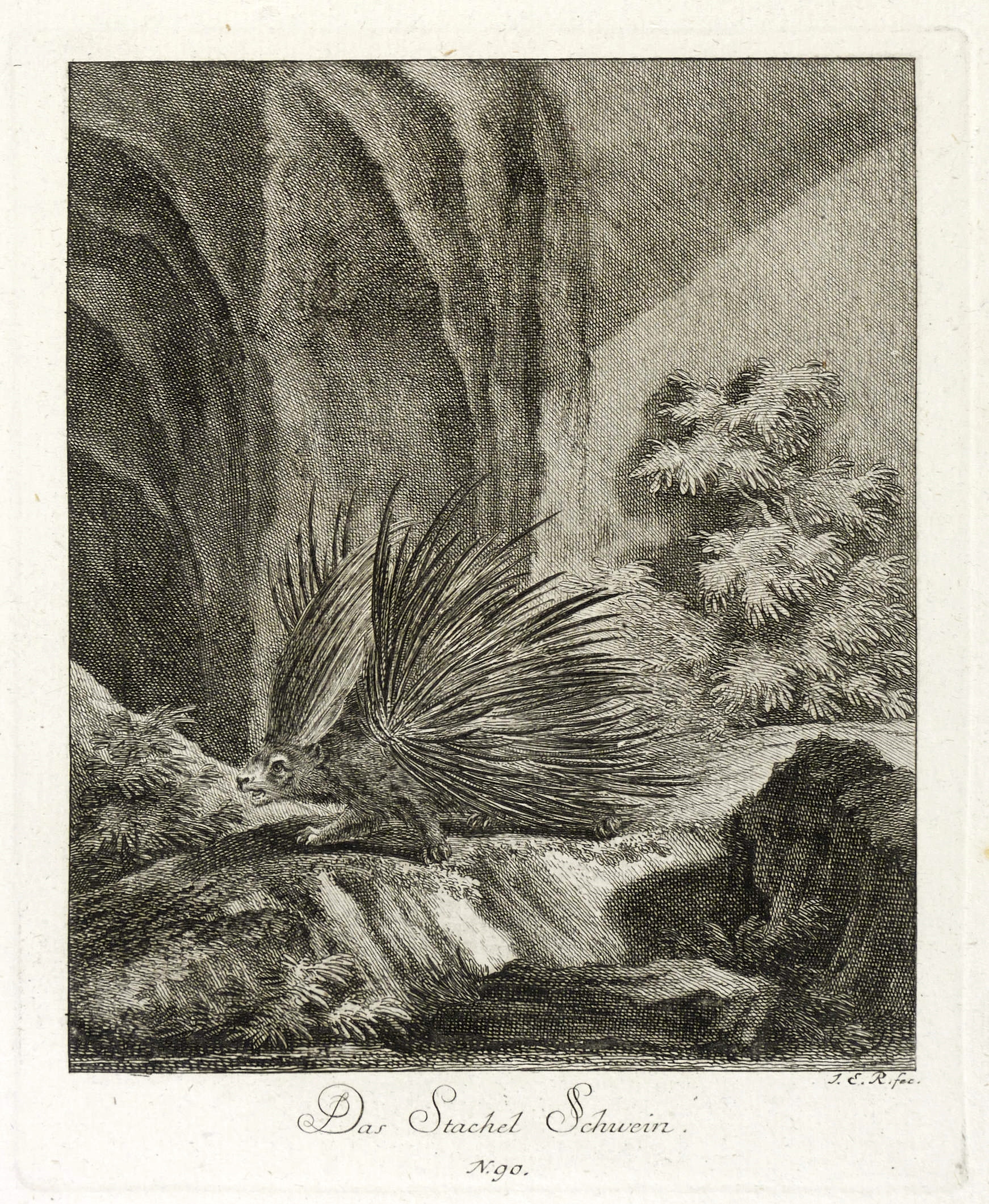 Thienemann 480. – Aus: Johann Elias Ridinger, Entwurff einiger Thiere, wie solche nach ihren unterschiedenen Arten, Actionen und Leidenschafften, nach dem Leben gezeichnet (Augsburg: Johann Elias Ridinger 1738-1754), Bd. 1-7. – In der Platte rechts unten signiert: ″J.E.R. fec.″ Dazu Titel sowie Platten- Nr.: ″N. 90.″ – Bei Thienemann wie folgt beschrieben: ″In gereiztem Zustande die Stacheln erhebend, keine sonderliche Figur.″ – Im linken Rand Bindungsspuren. Sehr guter Zustand.