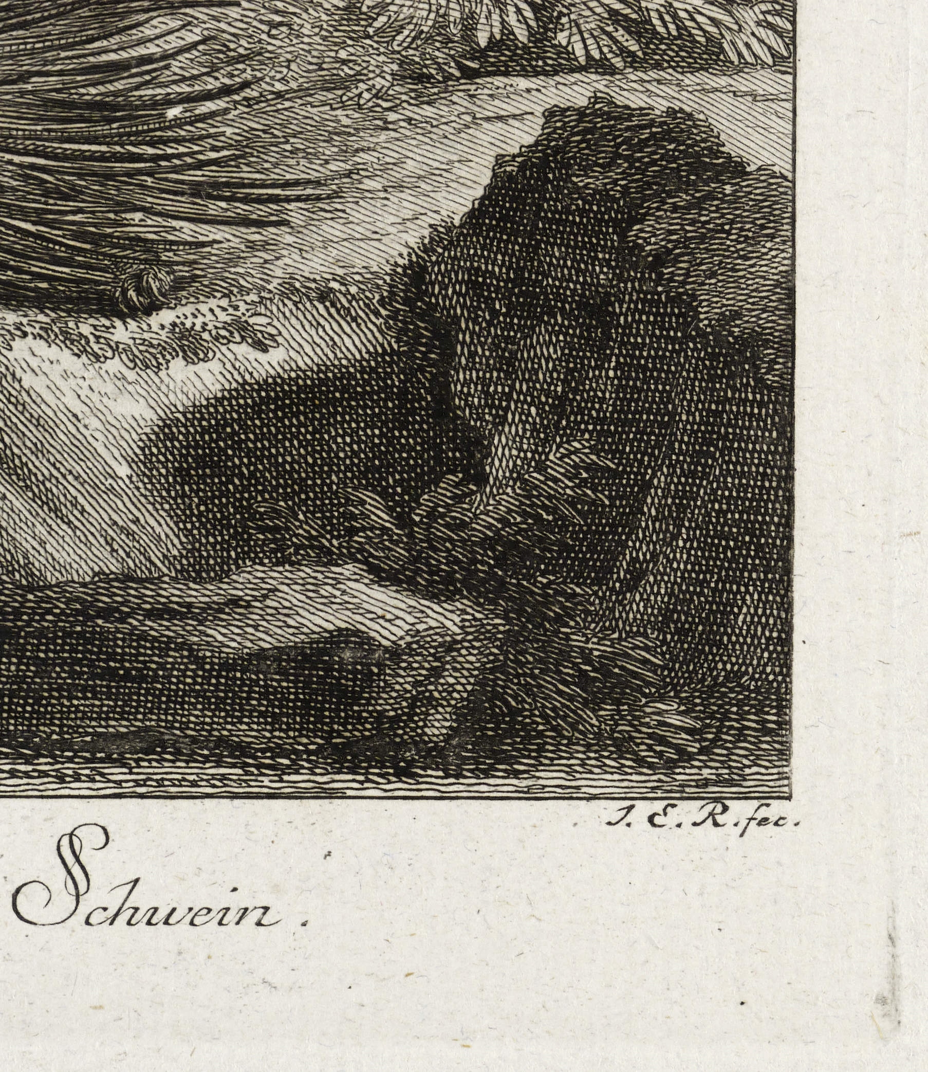 1740. Radierung / Strichätzung, in Schwarz, auf grobem Büttenpapier. – Von Johann Elias Ridinger. – 16,3 x 13,6 cm (Darstellung), 18,7 x 15,3 cm (Platte), 36 x 24 cm (Blatt).
