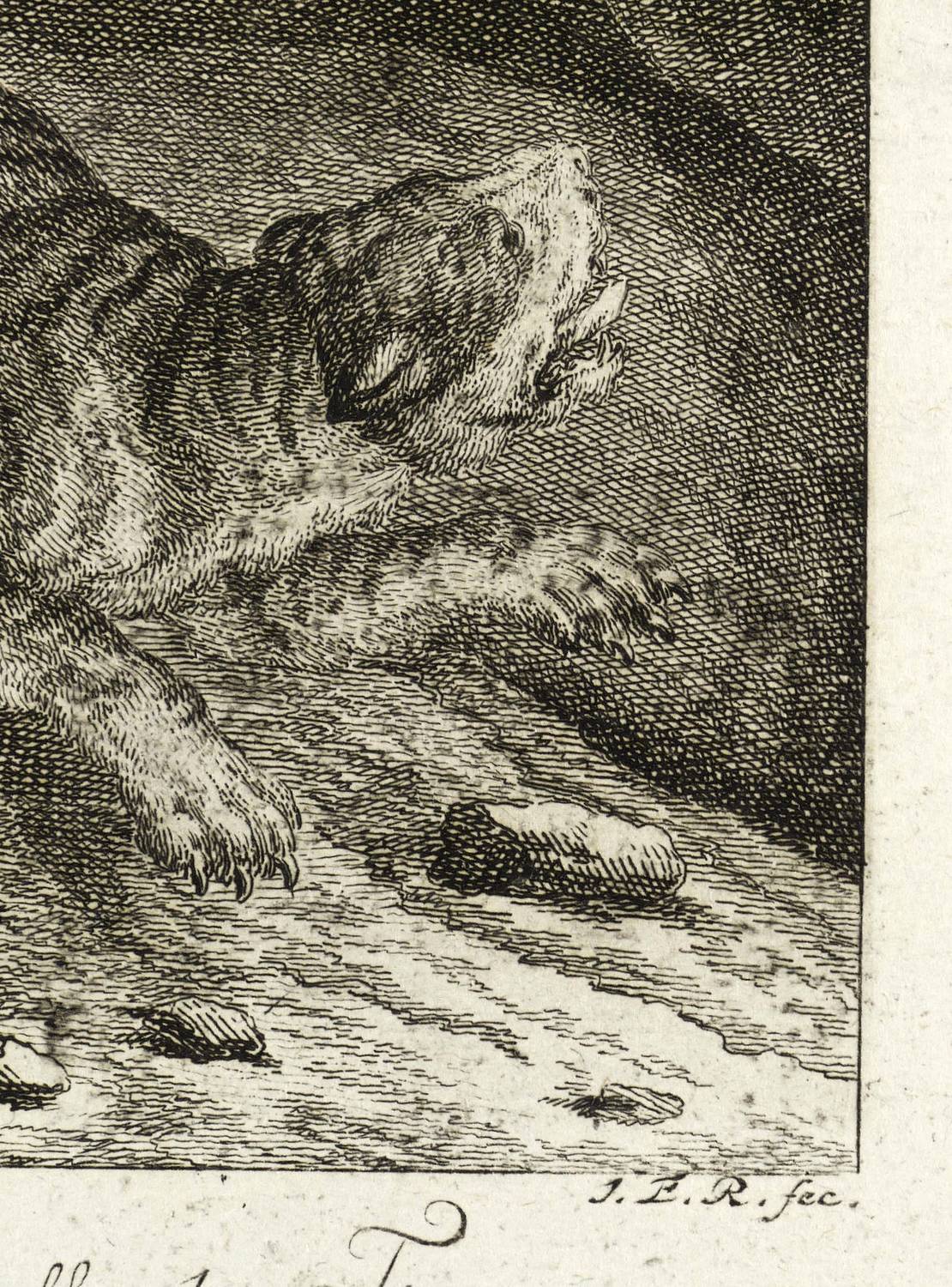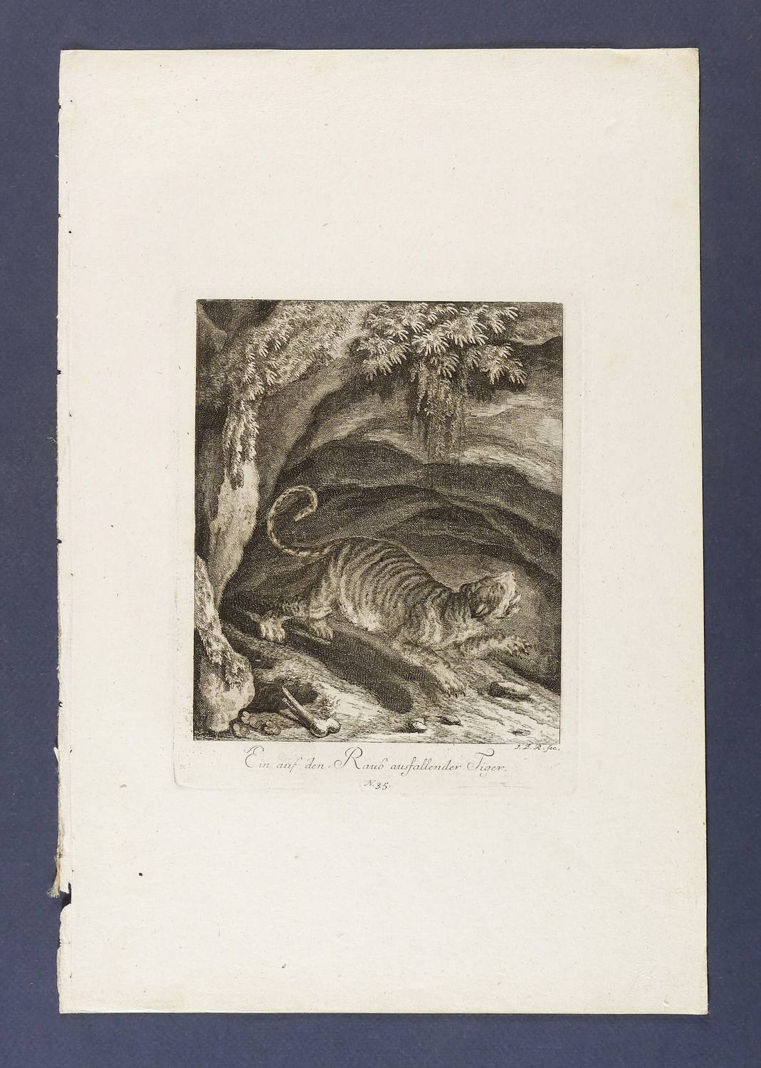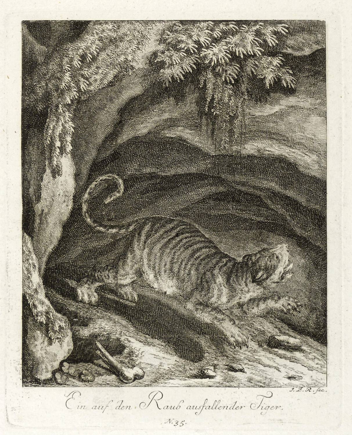 Thienemann 425. – Aus: Johann Elias Ridinger, Entwurff einiger Thiere, wie solche nach ihren unterschiedenen Arten, Actionen und Leidenschafften, nach dem Leben gezeichnet (Augsburg: Johann Elias Ridinger 1738-1754), Bd. 1-7. – In der Platte rechts unten signiert: ″J.E.R. fec.″ Dazu Titel sowie Platten- Nr.: ″N. 35.″ – Bei Thienemann wie folgt beschrieben: ″Dies ist nun erst der wahre Tiger (Felis tigris. Linn.). Er springt wütend aus einer Höhle mit weit aufgesperrtem Rachen hervor.″ – Im linken Rand Bindungsspuren. Sehr guter Zustand.
