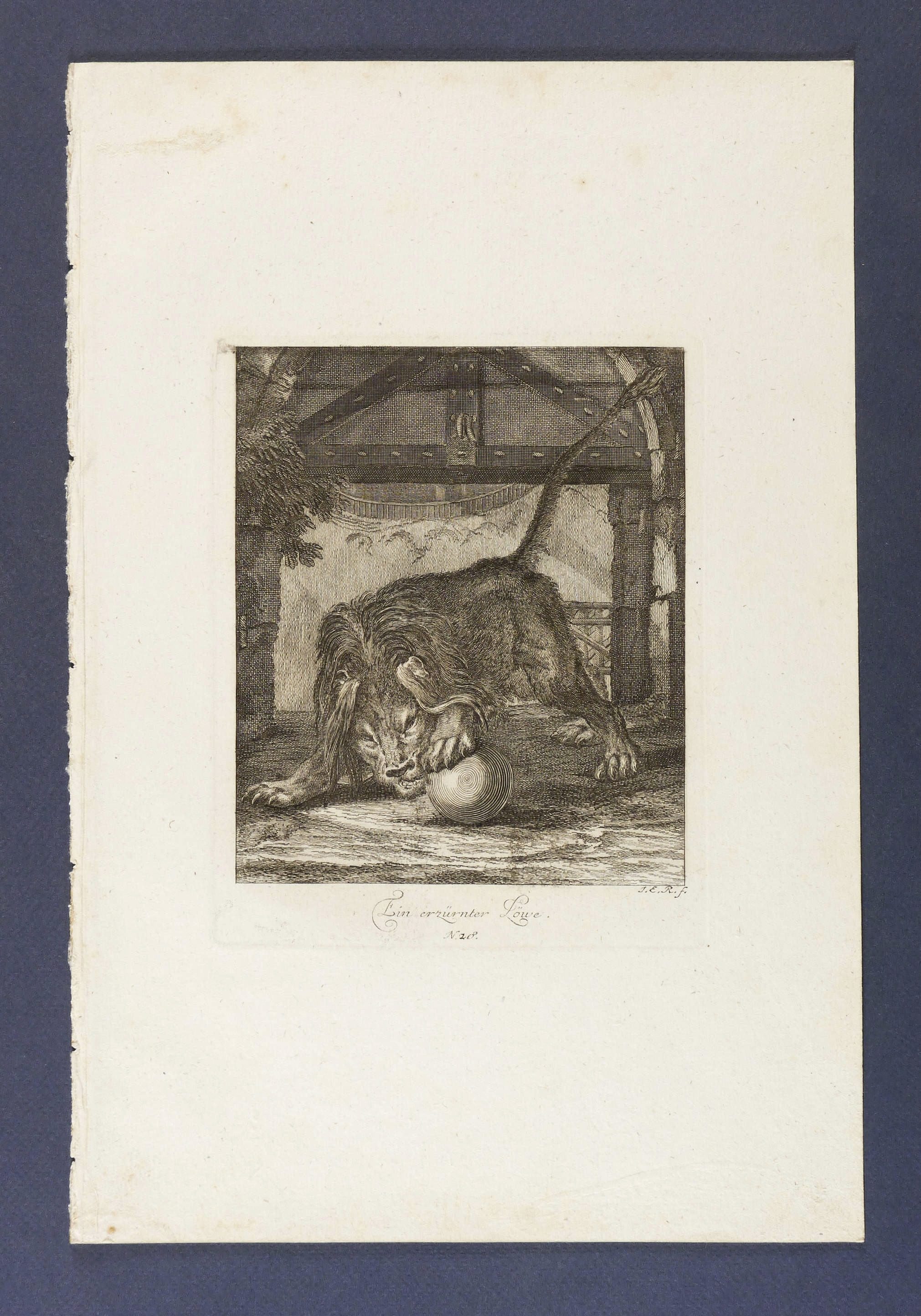 Thienemann 418. – Aus: Johann Elias Ridinger, Entwurff einiger Thiere, wie solche nach ihren unterschiedenen Arten, Actionen und Leidenschafften, nach dem Leben gezeichnet (Augsburg: Johann Elias Ridinger 1738-1754), Bd. 1-7. – In der Platte rechts unten signiert: ″J.E.R. f.″ Dazu Titel sowie Platten-Nr.: ″N. 28.″ – Bei Thienemann wie folgt beschrieben: ″Er hat in der linken Vordertatze eine Kugel. In der Zeichnung hat er ein erlegtes wildes Schwein unter sich, was sich recht gut ausnimmt.″ – Im linken Rand Bindungsspuren. Im Rand unmerklich fleckig. Guter Zustand.