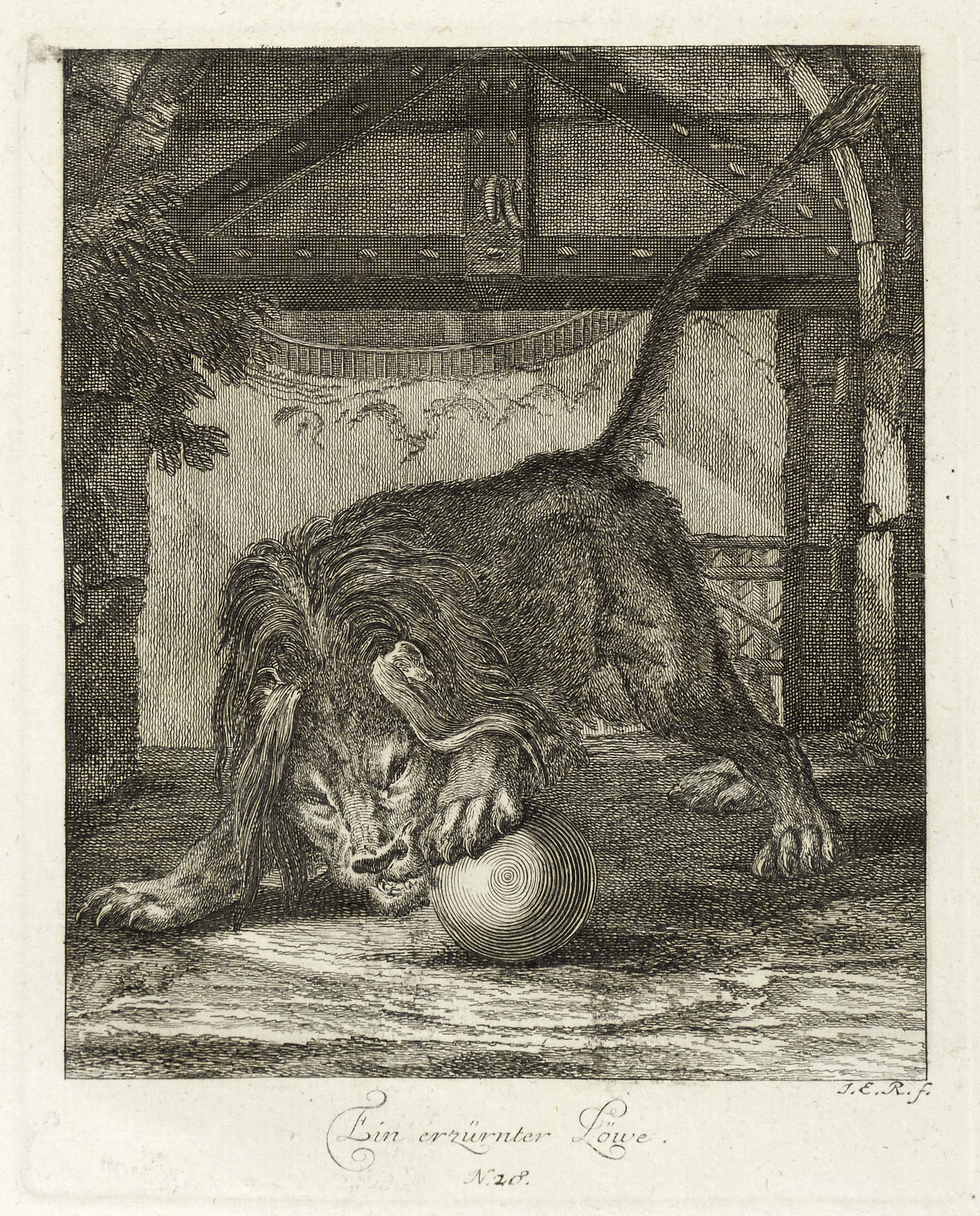 Raubkatzen. – Löwen. - Gereiztes Männchen. – Ridinger. – „Ein erzürnter Löwe”.