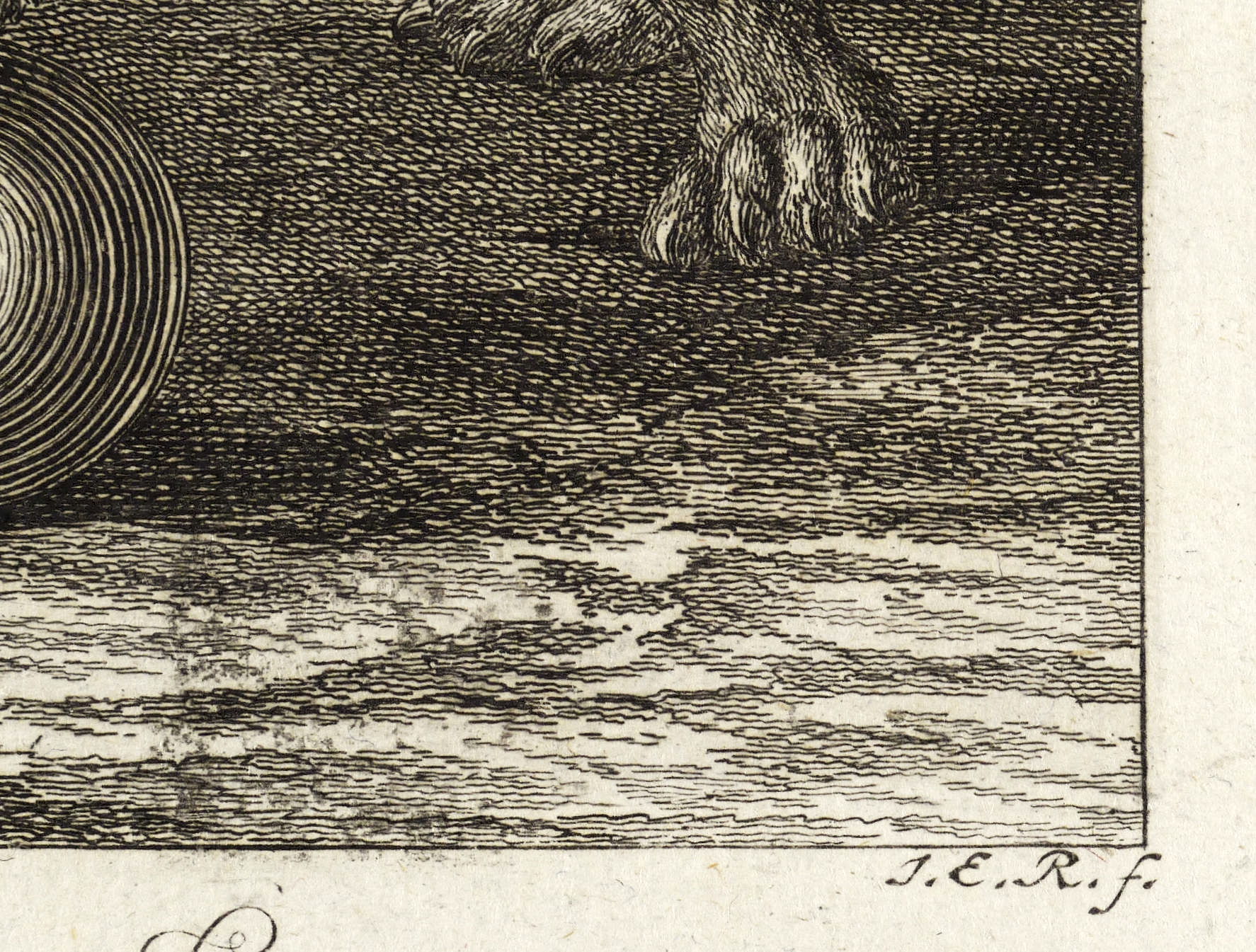 1738. Radierung / Strichätzung, in Schwarz, auf grobem Büttenpapier. – Historische Buchillustration, von Johann Elias Ridinger. – 16,2 x 13,4 cm (Darstellung), 18,4 x 14,6 cm (Platte), 36 x 24 cm (Blatt).