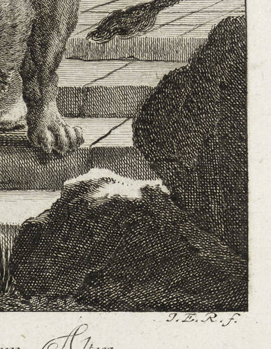 Thienemann 413. – Aus: Johann Elias Ridinger, Entwurff einiger Thiere, wie solche nach ihren unterschiedenen Arten, Actionen und Leidenschafften, nach dem Leben gezeichnet (Augsburg: Johann Elias Ridinger 1738-1754), Bd. 1-7. – In der Platte rechts unten signiert: ″J.E.R. f.″ Dazu Titel sowie Platten-Nr.: ″N. 23.″ – Bei Thienemann wie folgt beschrieben: ″In einer ausgemauerten Höhle steigt er steinerne Stufen herab.″ – Im linken Rand Bindungsspuren. Partiell geringfügig fleckig. Noch guter Zustand.