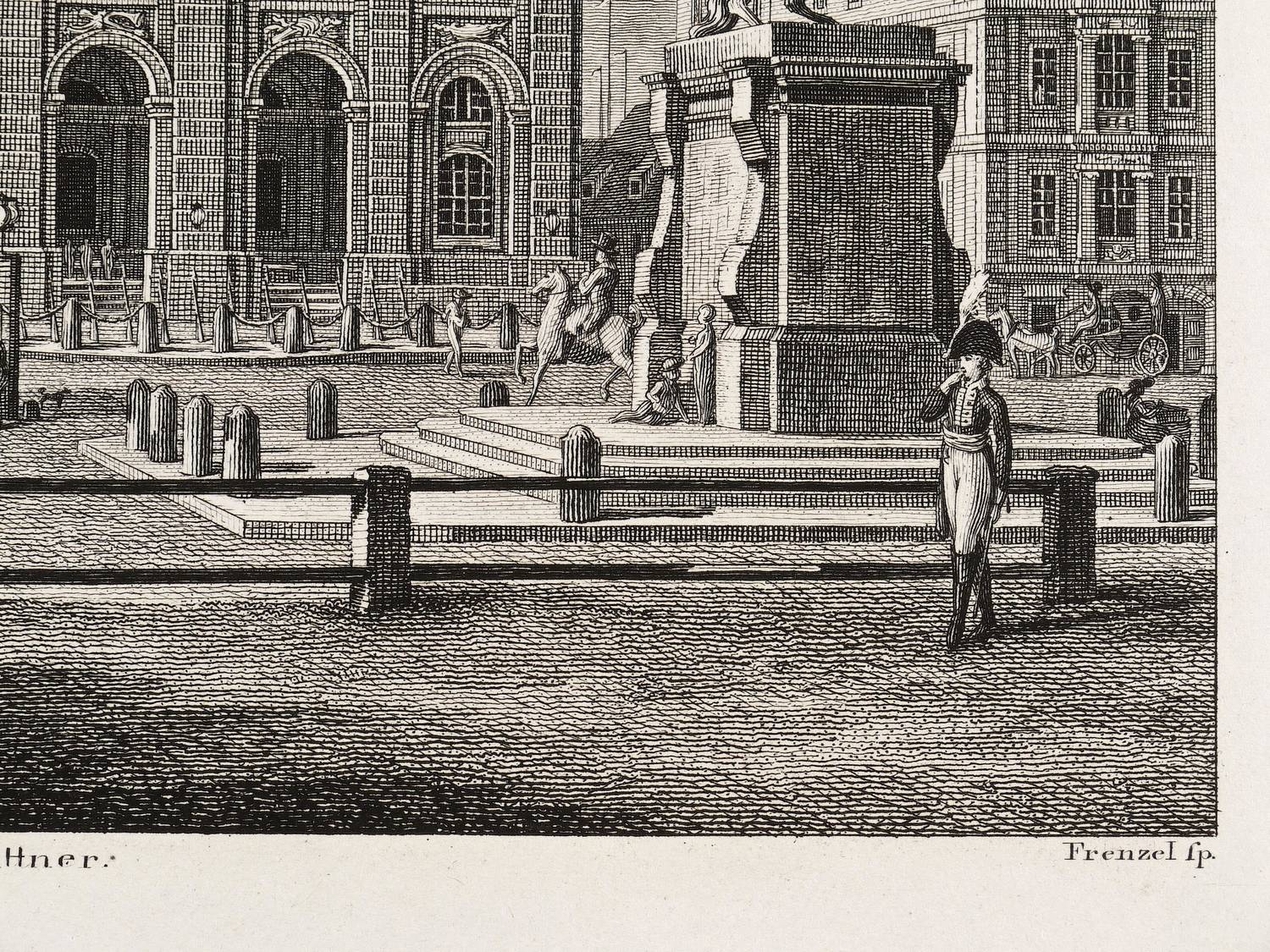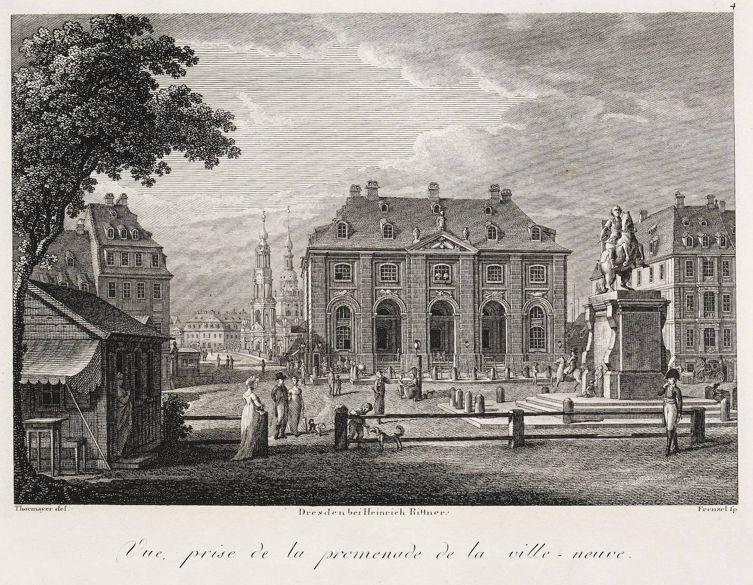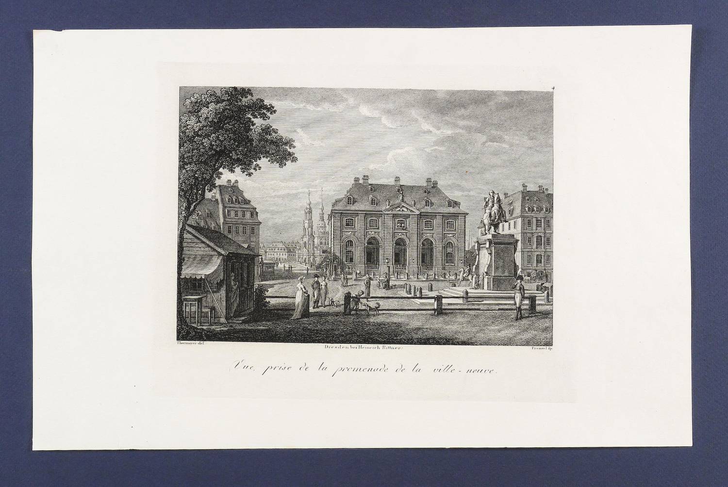 Aus: Gottlob Friedrich Thormeyer, Dresden mit seinen Prachtgebäuden und schönsten Umgebungen. Dresde avec ses édifices et plus beaux environs (Dresden: Meinhold & Rittner 1808). – In der Platte rechts unter der Darstellung signiert: ″Frenzel sp.″ Links bezeichnet: ″Thormayer del.″ Mittig Verlegeradresse: ″Dresden bei Heinrich Rittner″. Darunter französischer Titel. – Im Bereich der Platte leicht angeschmutzt. Papier geringfügig knickspurig. Insgesamt gut erhalten.