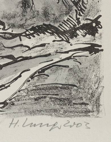 2003. Lithografie / Pinsel- und Kreidelithografie, in Schwarz, auf grauem Büttenpapier. – Originale Künstlergrafik, von Heinz Langer. – 32,0 x 22,0 cm (Darstellung), 53 x 40 cm (Blatt), 60 x 50 cm (Passepartout).