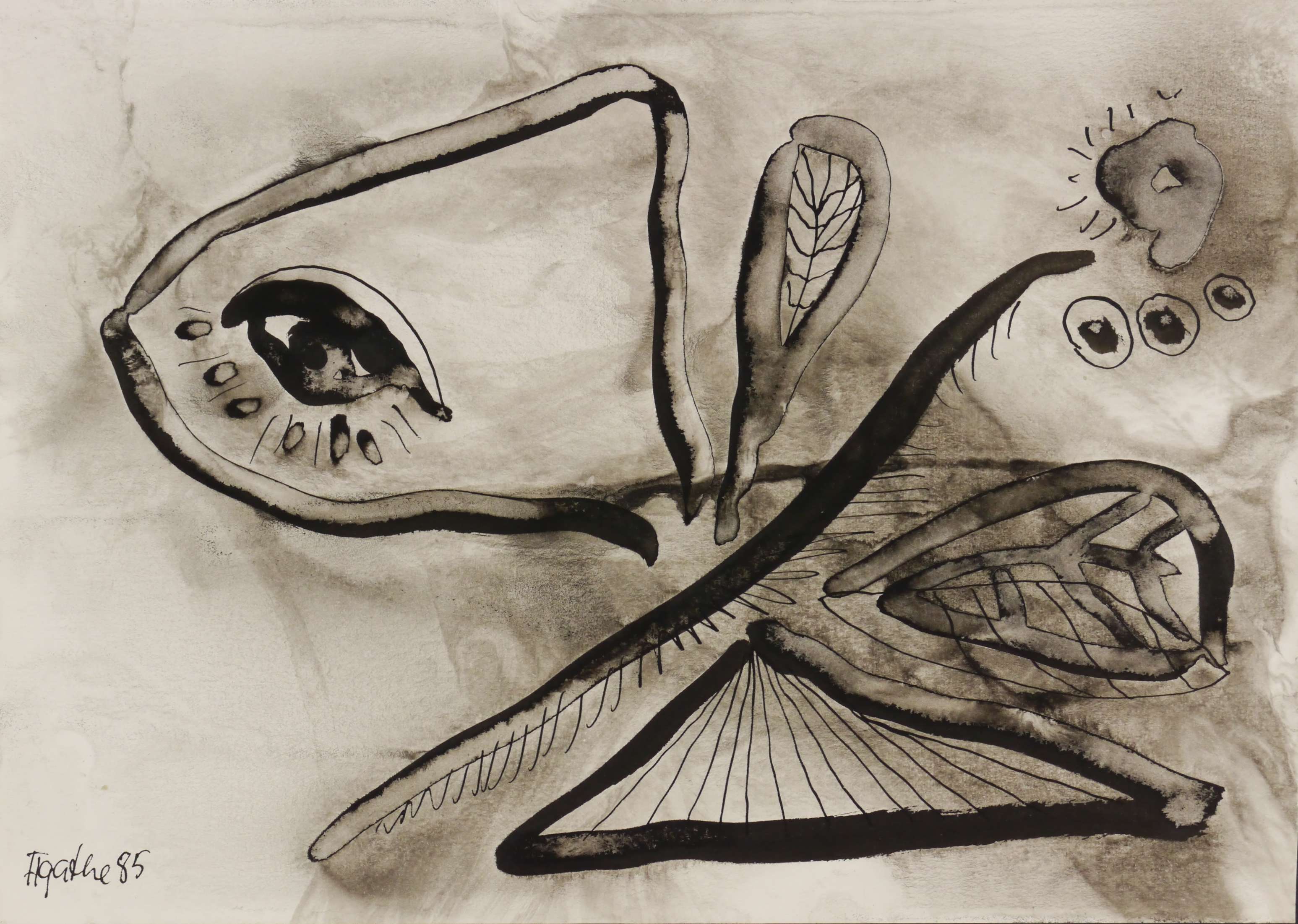 1985. Zeichnung / Pinselzeichnung, in schwarzer Tusche, hellgrau laviert, auf Papier. – Originale Künstlergrafik, von Agathe Böttcher. – Unikat. – 21,0 x 29,5 cm (Darstellung / Blatt), 30 x 41,5 cm (Trägerblatt), 40 x 50 cm (Passepartout).