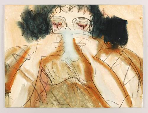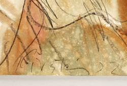 In der Darstellung links unten mit Kreide signiert und datiert: ″Kirstein 72″. Verso in Bleistift von fremder Hand bezeichnet: ″Die weinende Frau″. Dazu Künstlername und Ausstellungs-Nr. – In den Ecken originale Reißzwecklöchlein. Wasserfarben frisch leuchtend. Verso leichte MOntagespuren. Sehr guter Zustand.