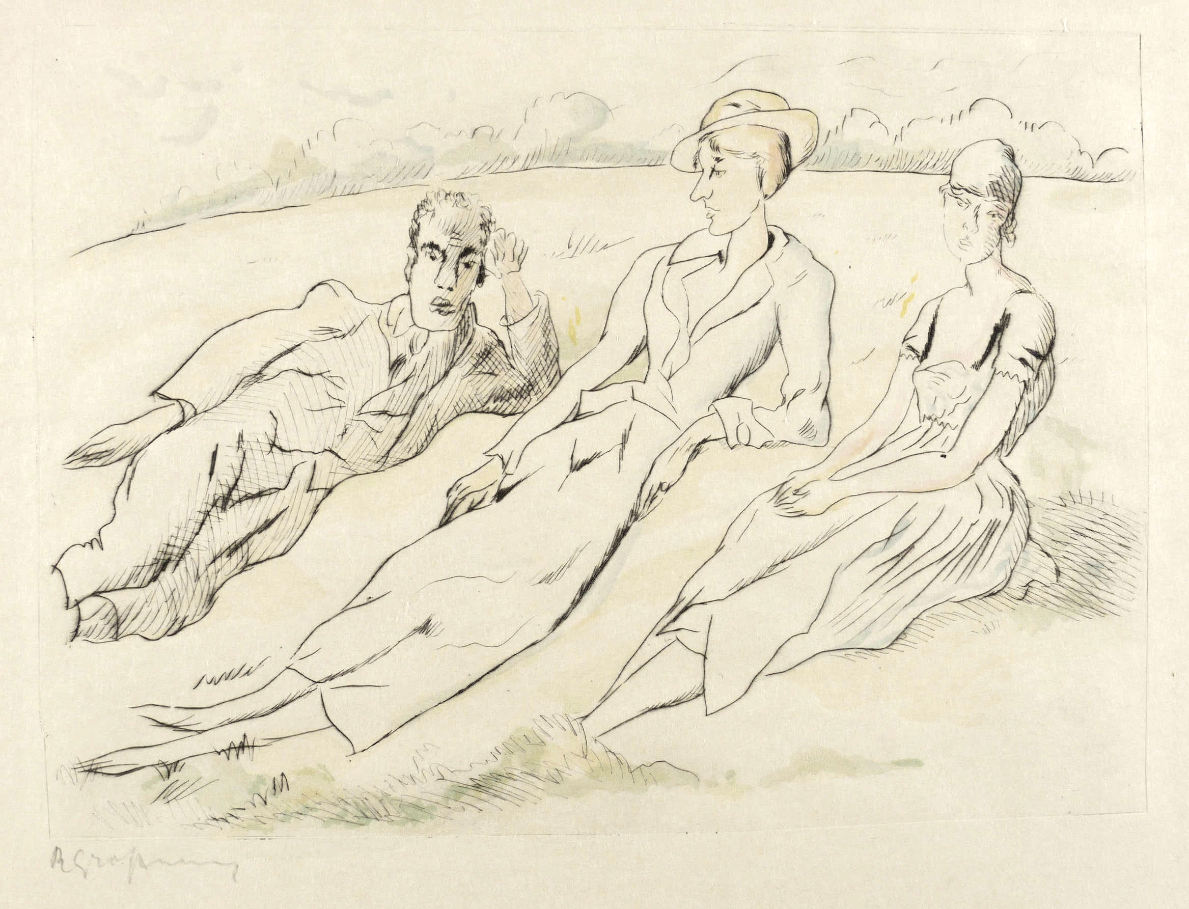 1925-1930. Radierung / Kaltnadel, aquarelliert, auf feinem gelblichem Japanbütten. – Originale Künstlergrafik, von Rudolf Großmann. – 23,8 x 32,9 cm (Darstellung / Platte), 33 x 48 cm (Blatt).
