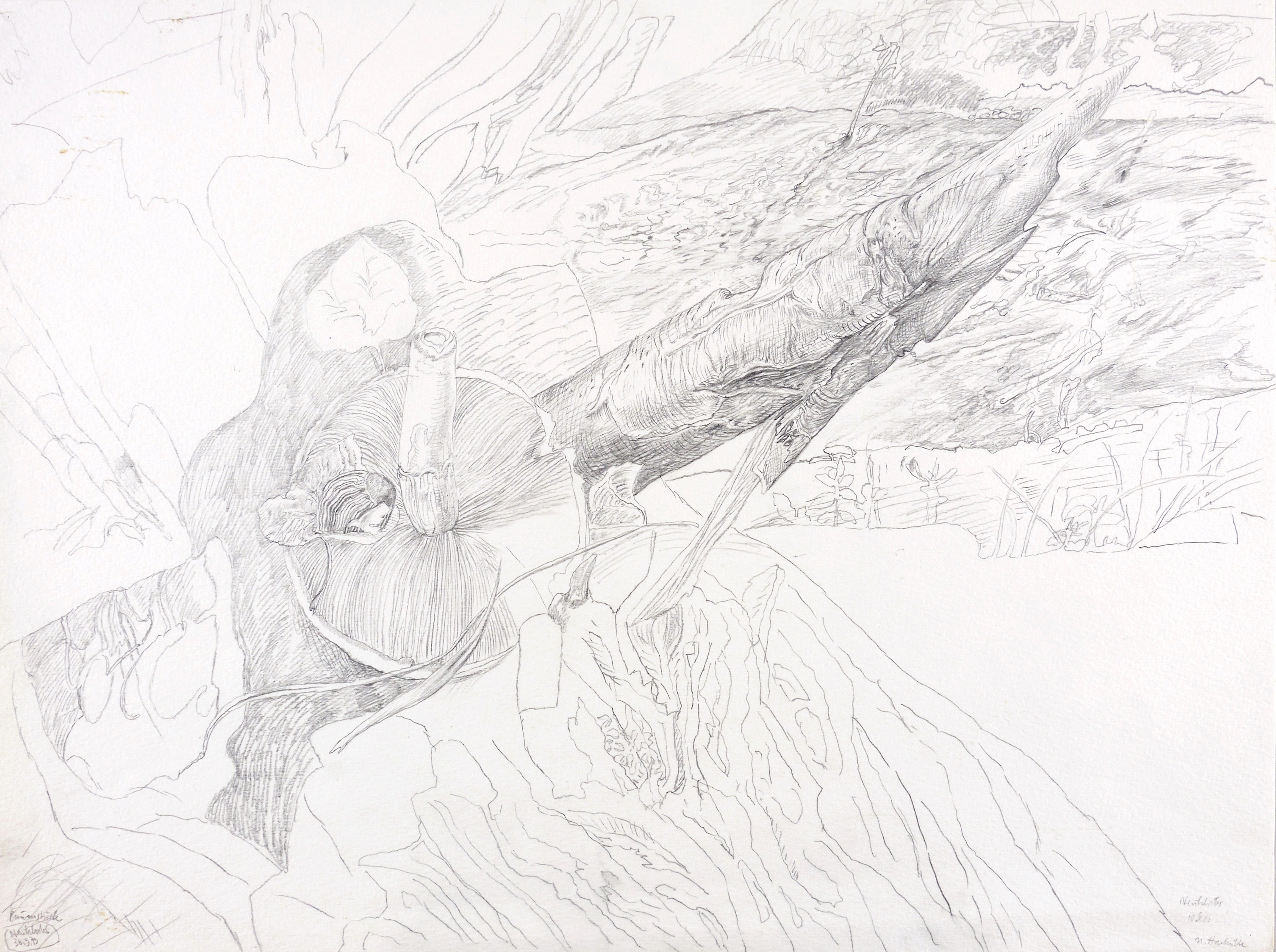 1979. Zeichnung / Bleistiftzeichnung, auf hellem Papier. – Originale Künstlergrafik, von Ulrich Hachulla. – Unikat. – 36 x 48 cm (Darstellung / Einfassungslinie).