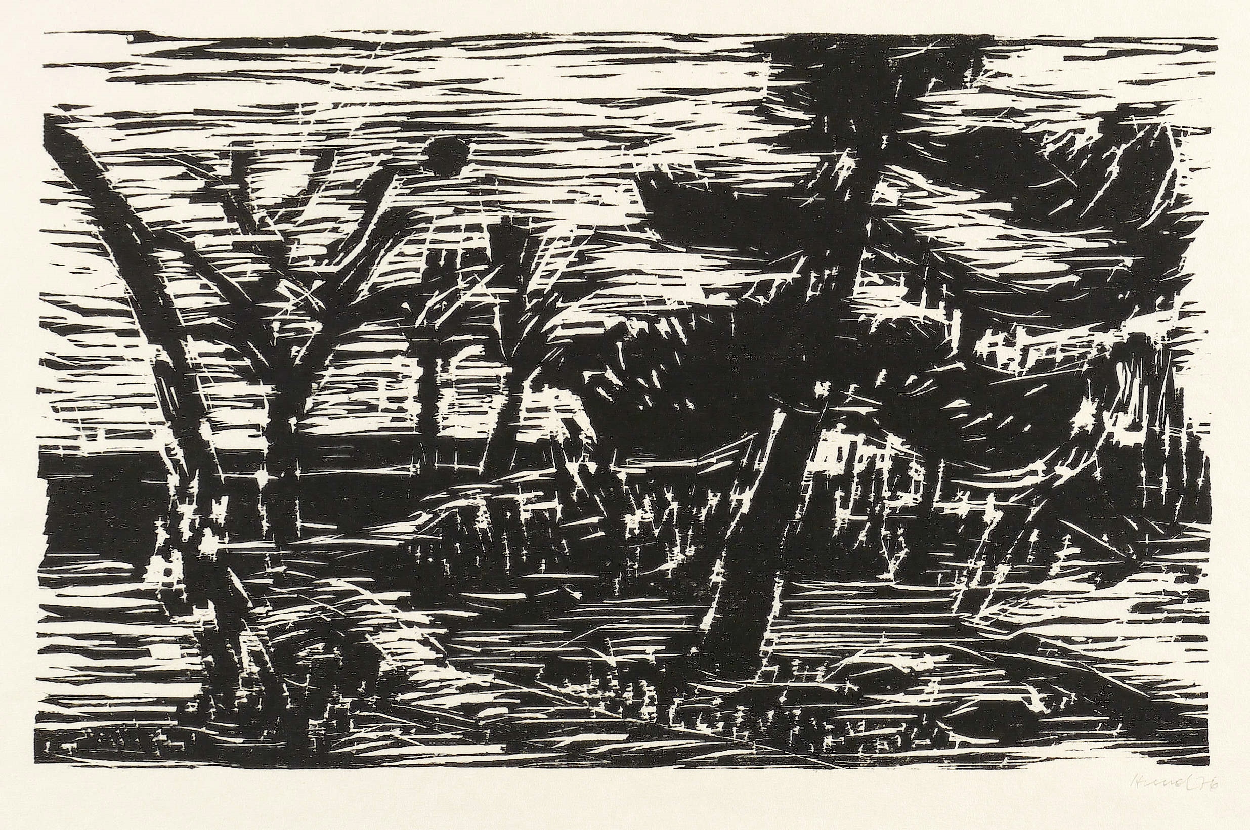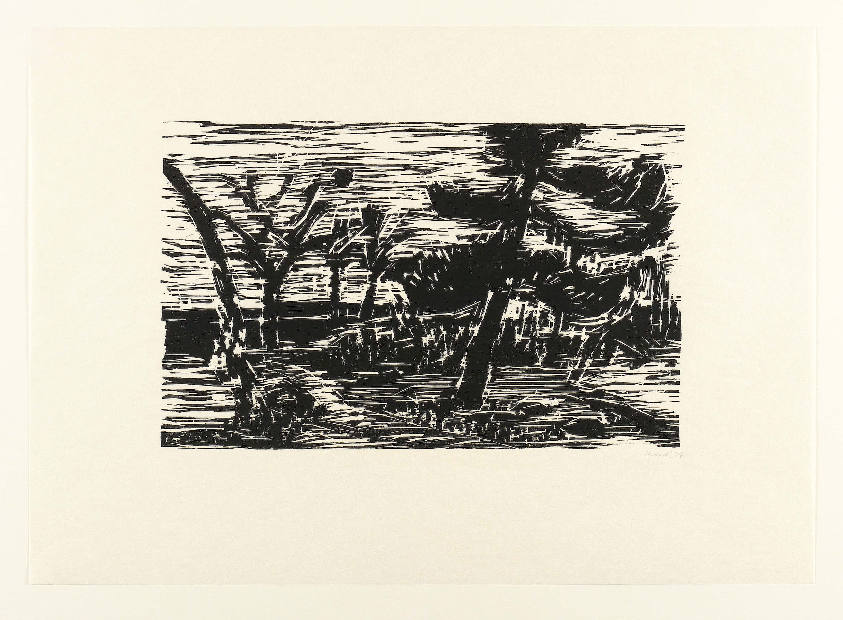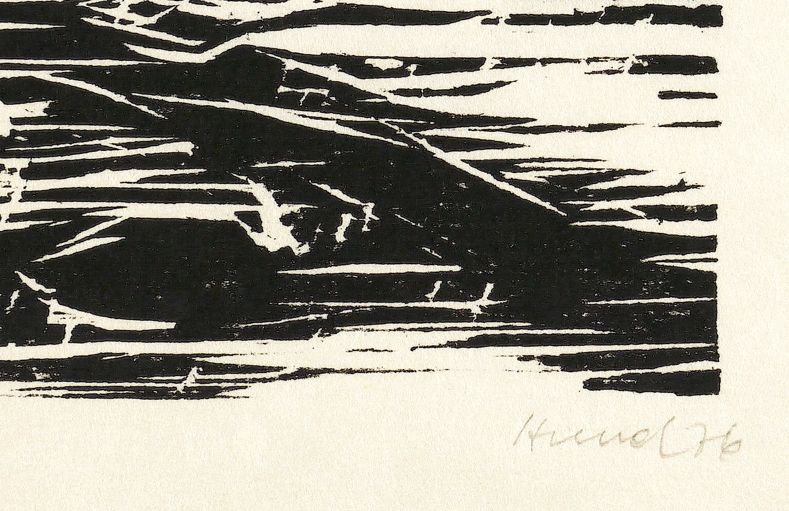1976. Holzschnitt, in Schwarz, auf rauem weißlichem Japanpapier. – Originale Künstlergrafik, von Hans-Peter Hund. – 19,9 x 31,6 cm (Darstellung / Druckstock), 34 x 48 cm (Blatt).