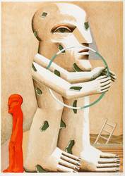 Horst Antes (*1936 Heppenheim - lebt und arbeitet in Karlsruhe, Berlin und Castellina in Chianti / Italien). Deutscher Maler, Grafiker und Bildhauer. Studierte Malerei 1957-59 bei HAP Grieshaber an der Akademie der Bildenden Künste Karlsruhe. Seit 1967 Professor für Malerei an der Akademie Karlsruhe. 1962 Villa Romana Florenz, 1963 Villa Massimo Rom. 1963 Ausstellung der ersten plastischen Kopffüßler-Figur. 1967 Metallplastiken zum Garten der sieben Denkmäler der Lüste anlässlich der Bundesgartenschau für den Botanischen Garten in Karlsruhe. 1968 Gastprofessur an der Hochschule für Bildende Künste Berlin. Seit 1983 Mitglied der Freien Akademie der Künste Hamburg. - Seine monolithisch wirkenden, oft gnomenhaft körperlosen Figuren weisen Ankläge von spätem Kubismus und Surrealismus auf.