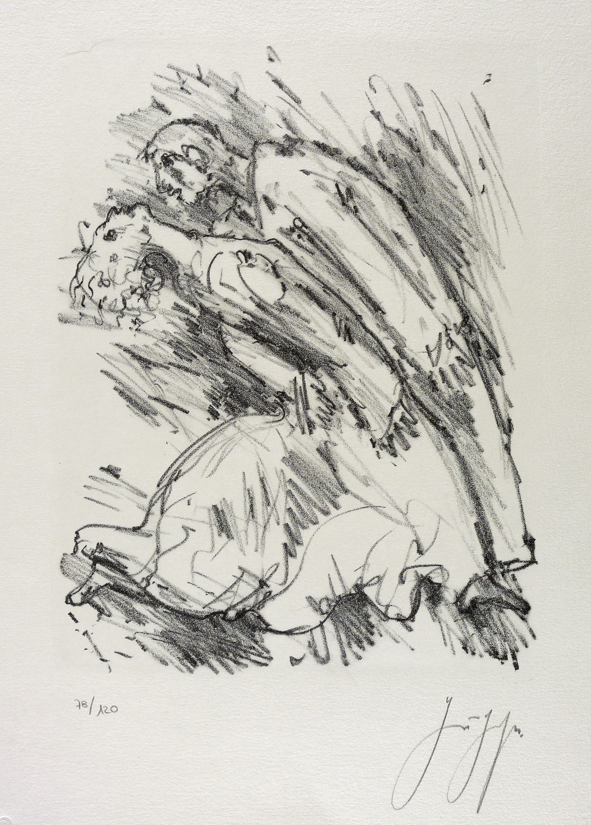 Um 1990. Lithografie / Kreidelithografie, in Schwarz, auf schwerem hellgrauem Hahnemühle. – Originale Künstlergrafik, von Günter Grass. – Auflage Exemplar Nr. 78/120. – 35,3 x 26,6 cm (Darstellung / Druckbild), 54 x 40 cm (Blatt).