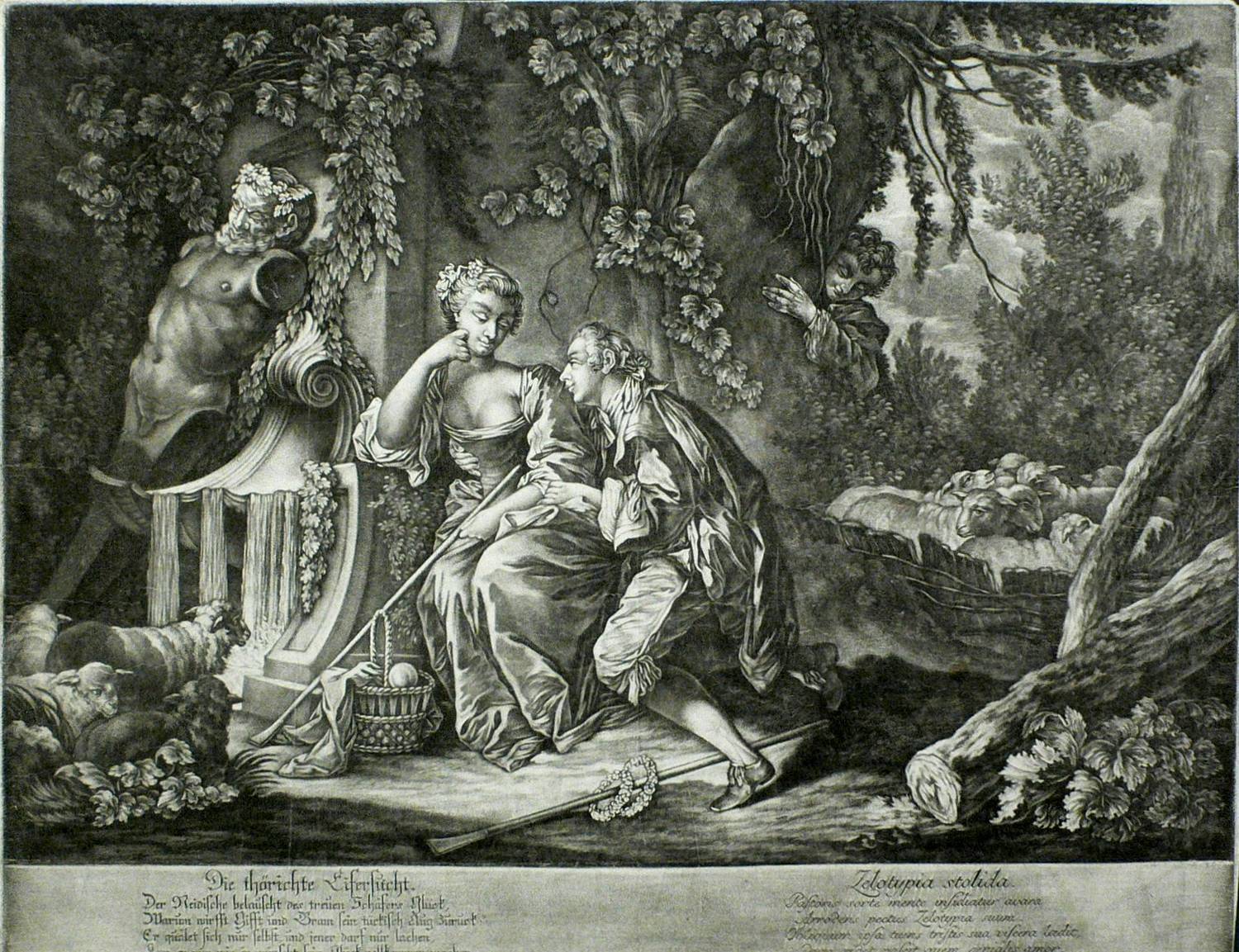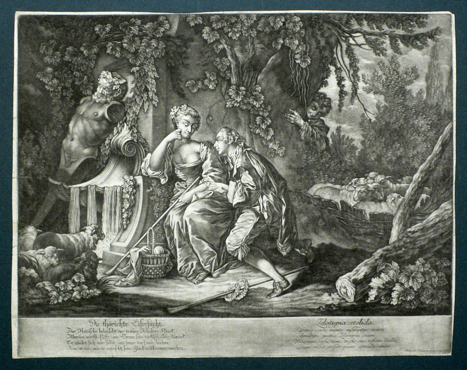 Schwarz 1461. Nicht bei Thienemann. – In der Platte unten rechts signiert. Unterhalb der Darstellung zwei kurze beschreibende Texte (deutsch/latein) in gebundener Rede: ″Der Neidische belauscht des treuen Schäfers Glück, / Warum wirfft Gifft und Gram sein tückisch Aug zurück? / Er quälet sich nur selbst, und jener darf nur lachen, / Kan er nur, wie er wünscht, sein Glück vollkommen machen.″ – Hübsche Schäferszene des Rokoko in einer weindurchrankten Grotte. Im Hintergrund die Herme eines Bacchus oder Satyrs. – Außerordentlich seltenes Blatt! Der in jeder Hinsicht hervorragend zu nennende Internet-Katalog zu Ridinger von Lüder H. Niemeyer verweist hinsichtlich der ″von altersher übergroße(n) Seltenheit seiner Schabblätter gerade auch gegenüber der verhältnismäßig vielfach noch sichtbaren Häufigkeit der herkömmlichen Kupfer″ auf Sandrart, der schon 1675 schrieb, dass geschabte Kupferplatten Auflagen von höchstens 50 bis 60 sauberen Abdrucken ermöglichen. – Blatt mit Lagerspuren, bis an die Plattenränder beschnitten. Fachmännisch restaurierter Einriss im unteren Rand. Verso Reste alter Montierung. Eher mäßig guter Zustand.