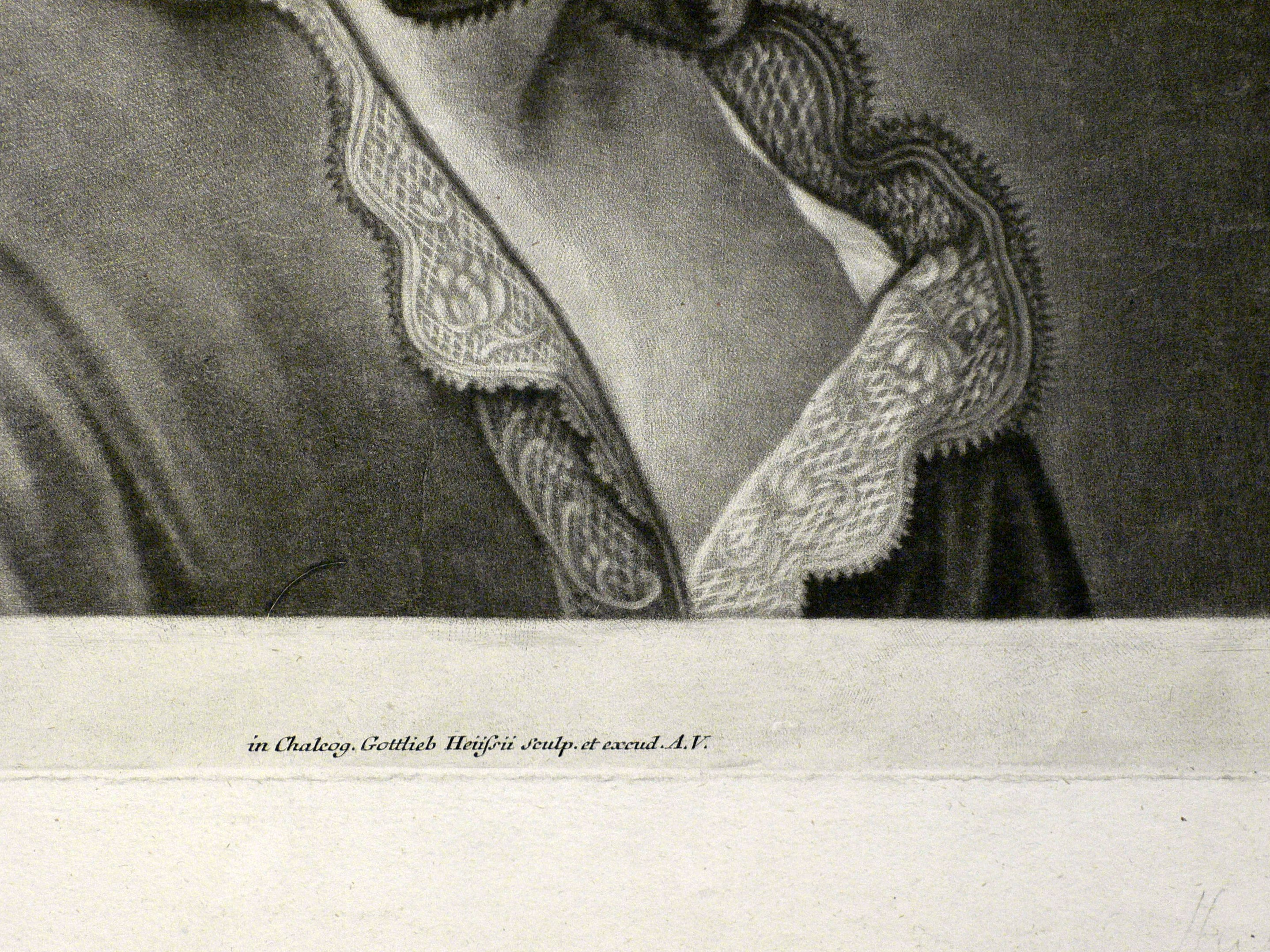 Um 1710. Mezzotinto / Schabkunstblatt. – Originale Künstlergrafik, von Gottlieb Heiss. – 42,1 x 32,2 cm (Darstellung / Platte), 53 x 43 cm (Blatt).