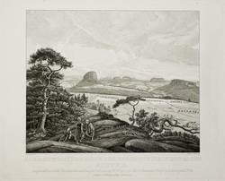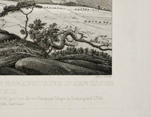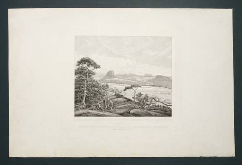 Kovalevski B-C 55. – Aus: Bilderchronik des Sächsischen Kunstvereins (Dresden: Sächsischer Kunstverein 1828-1836). – In der Platte rechts unten signiert und mittig betitelt. Darunter bezeichnet ″Angekauft vom Sächsischen Kunstvereine auf das Jahr 1830″. – Romantische Ansicht der Landschaft des sächsischen Elbsandsteingebirges. Im Vordergrund Mädchen beim Beerensammeln. Im Hintergrund der über die Elbe gelegene Königstein und der benachbarte Lilienstein. – Im Rand oberflächlich angeschmutzt. Rechte obere Ecke mit Knickspuren. Noch guter Erhaltungszustand.