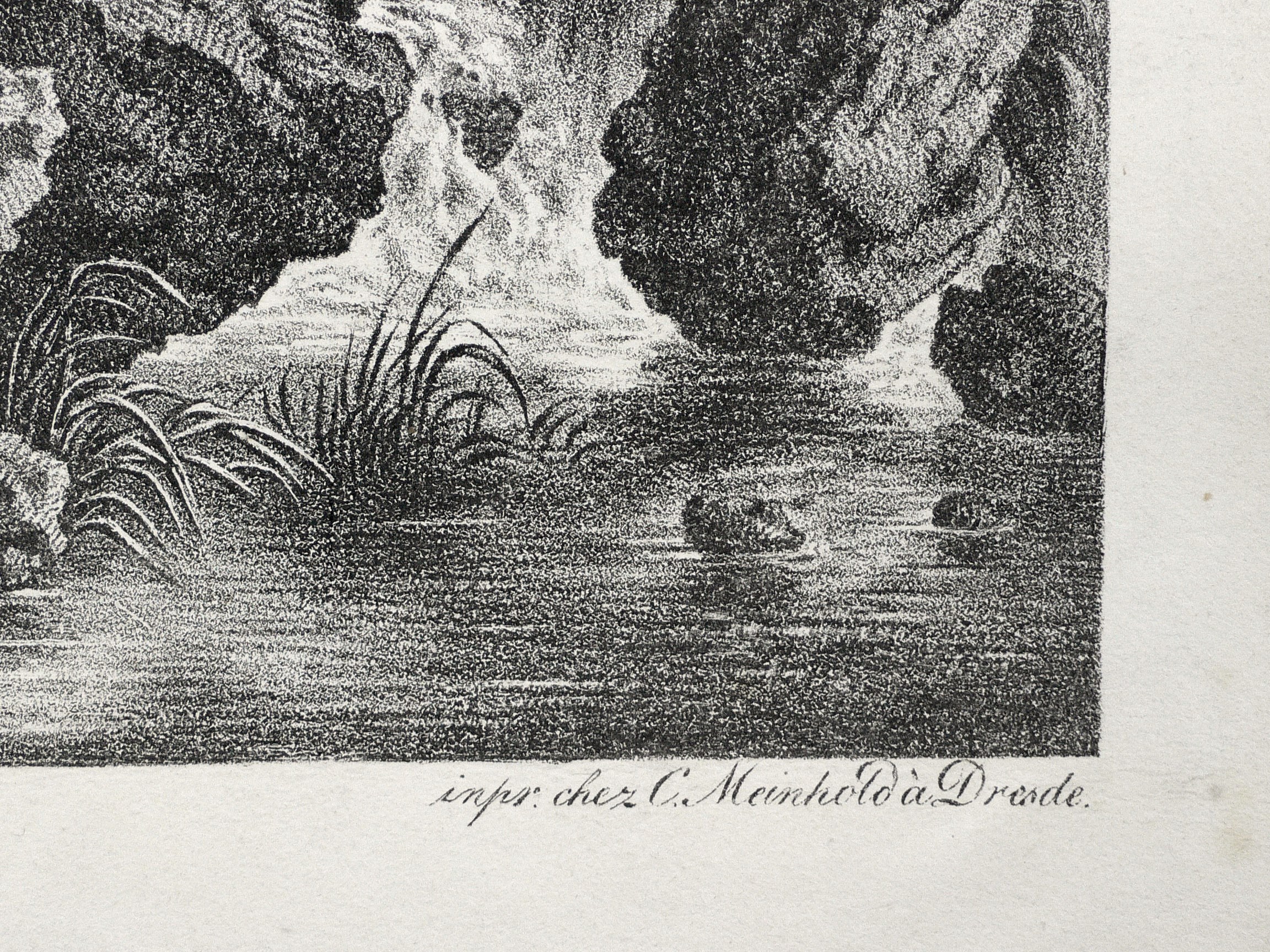Nicht bei Winkler. – Im Stein links unterhalb der Darstellung signiert: "Dietrich pinx. Le Co. Francois Cicognara sculp." Rechts Verlegeradresse: "impr. chez C. Meinhold à Dresde". – Sehr schöne Arbeit nach einem Gemälde von C. W. E. Dietrich. - Allem Anschein nach eine bislang nicht verzeichnete Inkunabel der Lithografie. Wie alle Arbeiten des Francesco Cicognara selten! – Blatt mit einem restaurierten Schnitt innerhalb der Darstellung, ohne Papierverlust. In der linke Hälfte der Darstellung leichte Fehldruckspur. Insgesamt guter Erhaltungszustand.
