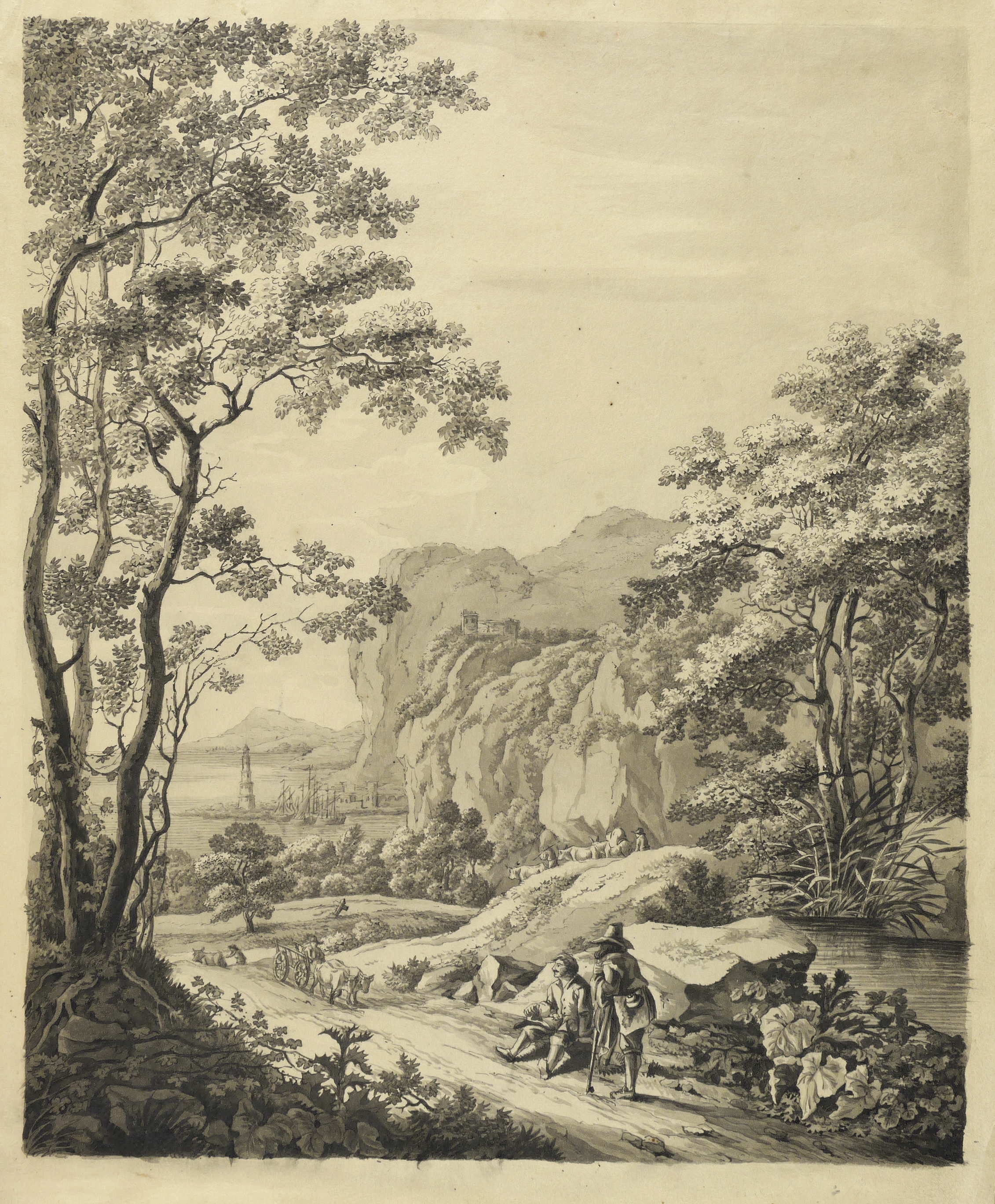 Nicht näher bezeichnet. Verso in Bleistift von fremder Hand: ″Romantische Handzeichnung″. – Wiedergabe der Radierung ″Landschaft mit einem Ochsenkarren″ aus der Serie ″Vier vertikale Landschaften″ von Jan Both aus den Jahren 1637-52 (Vgl. Bartsch 2. Hollstein 2). - Künstlerisch ambitionierteres Studienblatt von versierter, offenbar akademisch gebildeter Hand in der Manier von Johann Ludwig Aberli und mehr noch Adrian Zingg. – Mit schmalem Rand um die Darstellung. Geringe Verschmutzungen und Fleckchen. Insgesamt guter Zustand.