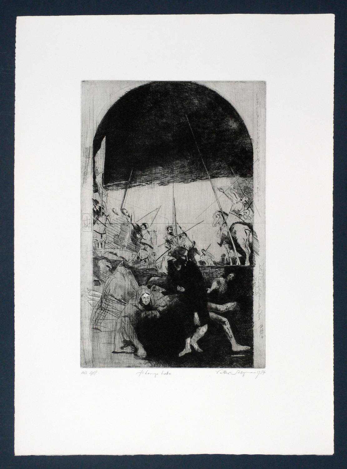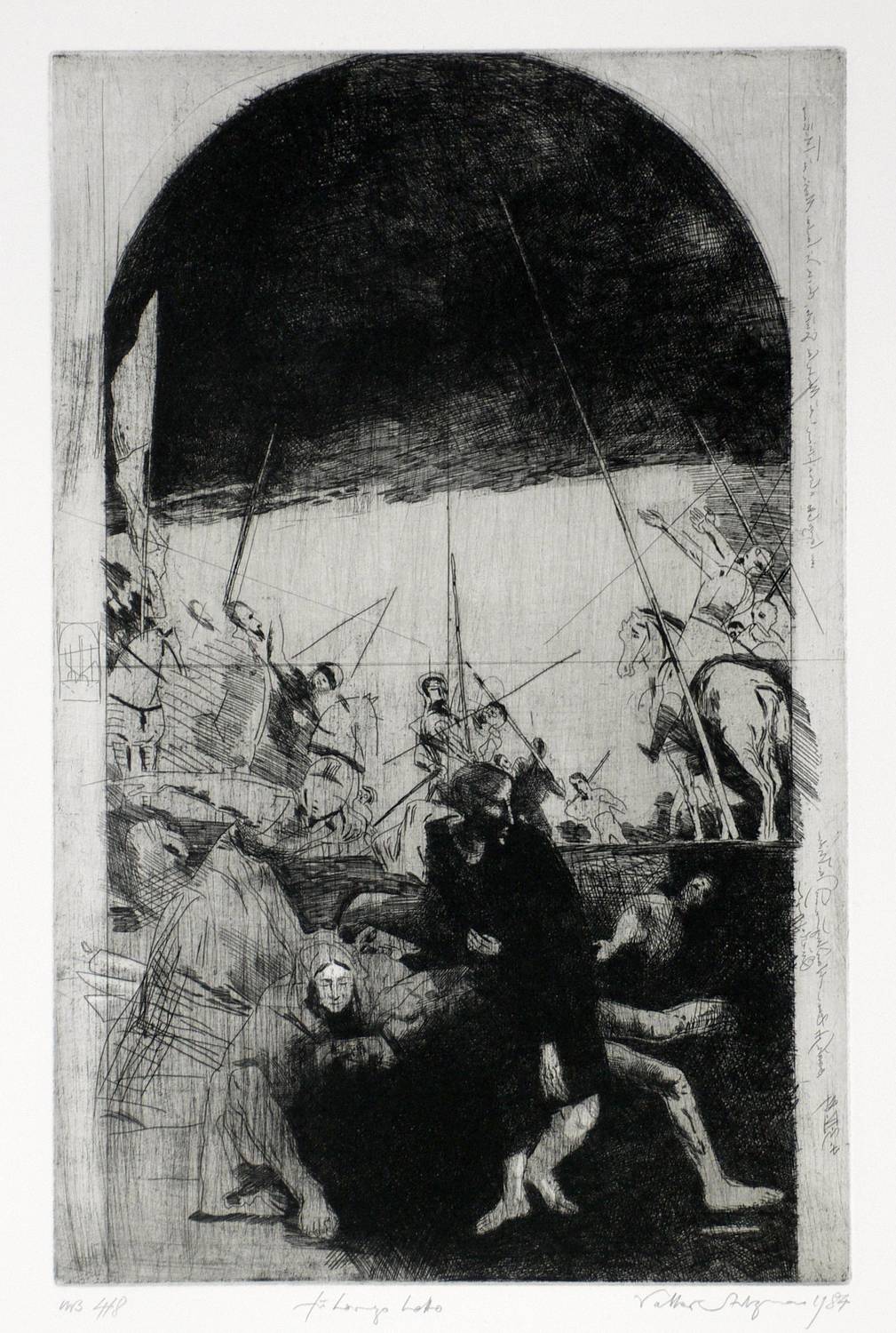 1984. Radierung / Strichätzung, in Schwarz, mit Plattenton, auf hellchamois Bütten. – Originale Künstlergrafik, von Volker Stelzmann. – Auflage Exemplar Nr. 4/8. – 50,0 x 32,0 cm (Darstellung / Platte), 79 x 55 cm (Blatt).