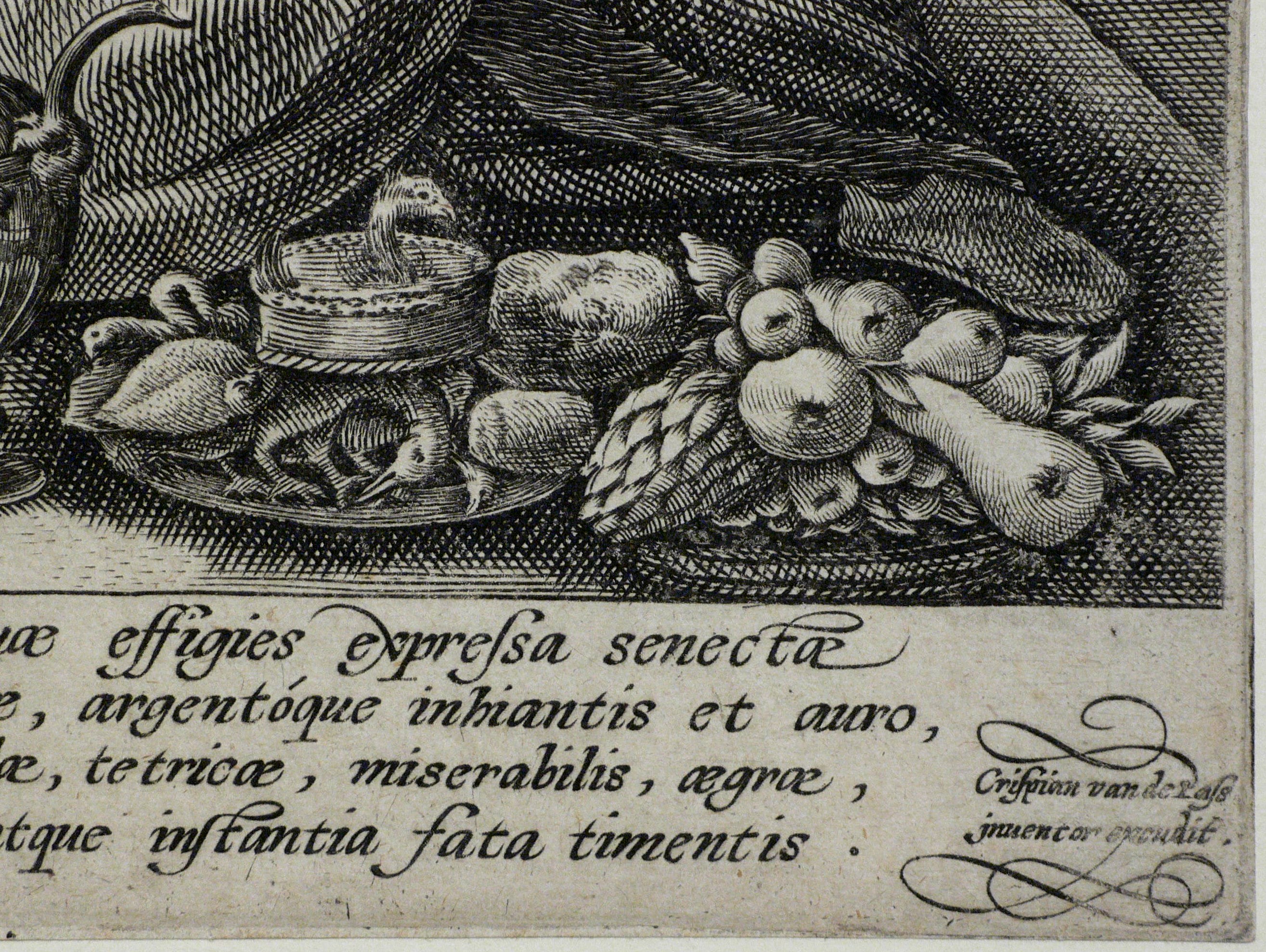 Hollstein Dutch and Flemish 497. Franken 1096. – In der Platte unten rechts signiert. Titel oben rechts. Unterhalb der Darstellung ein lateinischer Vierzeiler: ″Haec est occiduae expressa senectae Difficilis, querulae, argentoque inhiantis et auro, Spe longae, invalidae, tetricae, miserabilis, agrae, Vicinae capulo, atque instantia fata timentis.″. Blatt in der Darstellung unten links nummeriert: ″5″. - Wasserzeichen Krone über Wappenschild mit drei übereinander gesetzten Andreas-Kreuzen. – Blatt Nr. 5 aus einer Folge von 6 Blättern zu den Lebensaltern des Mannes. Hier dargestellt der zu Wohlstand und gesellschaftlichem Ansehen gelangte Alte. - Der Vierzeiler entstammt der Feder des Dichters und Gelehrten Karl Utenhoven (1500-1580). – Blatt umlaufend auf die Plattenkante beschnitten. Im Bereiich der Signatur oberflächlich geringfügig berieben. Fachgerecht im Passepartout montiert. Insgesamt in einem dem Alter entsprechend sehr guten Zustand.