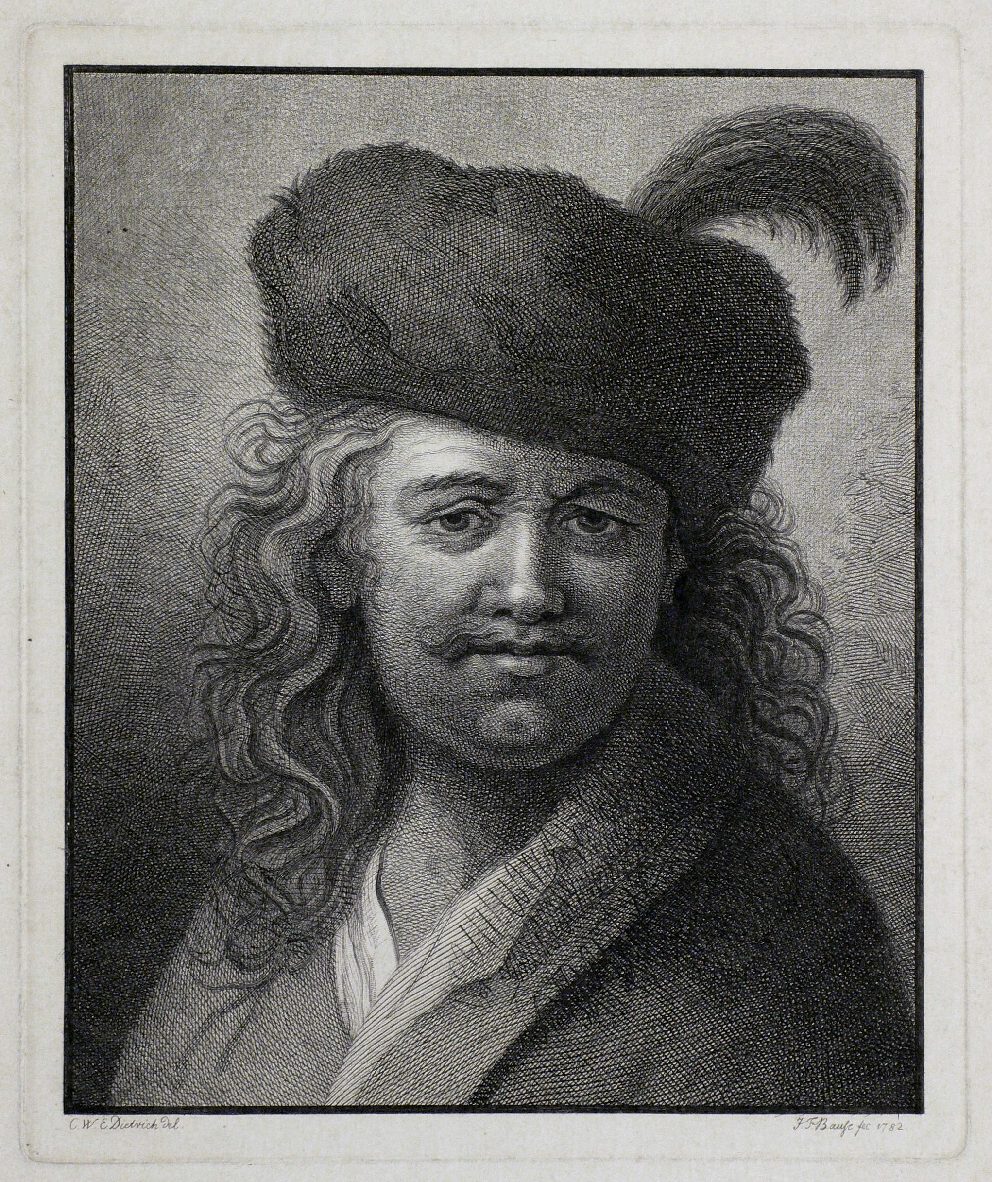 Keil 24 II (von II). – In der Platte rechts unter der Darstellung signiert und datiert: ″J.F. Bause fec. 1782.″ Links bezeichnet ″C.W.E. Dietrich del.″ – Zweite überarbeitete Fassung der schon 1777 als reine Radierung hergestellten Reproduktionsgrafik. 1782 überarbeitete Bause die Platte gründlich mit dem Grabstichel, verhalf dem Bildnis zu einem prägnanteren Ausdruck und änderte dementsprechend die Signatur von ″J.F. Bause fec, aq. fort.″ auf ″J.F. Bause fec. 1782″. – Schmaler Rand um die Platte, oben knapp auf die Plattenkante beschnitten. Büttenpapier durchgehend etwas knickspurig und fleckig. Insgesamt mäßig guter Erhaltungszustand.