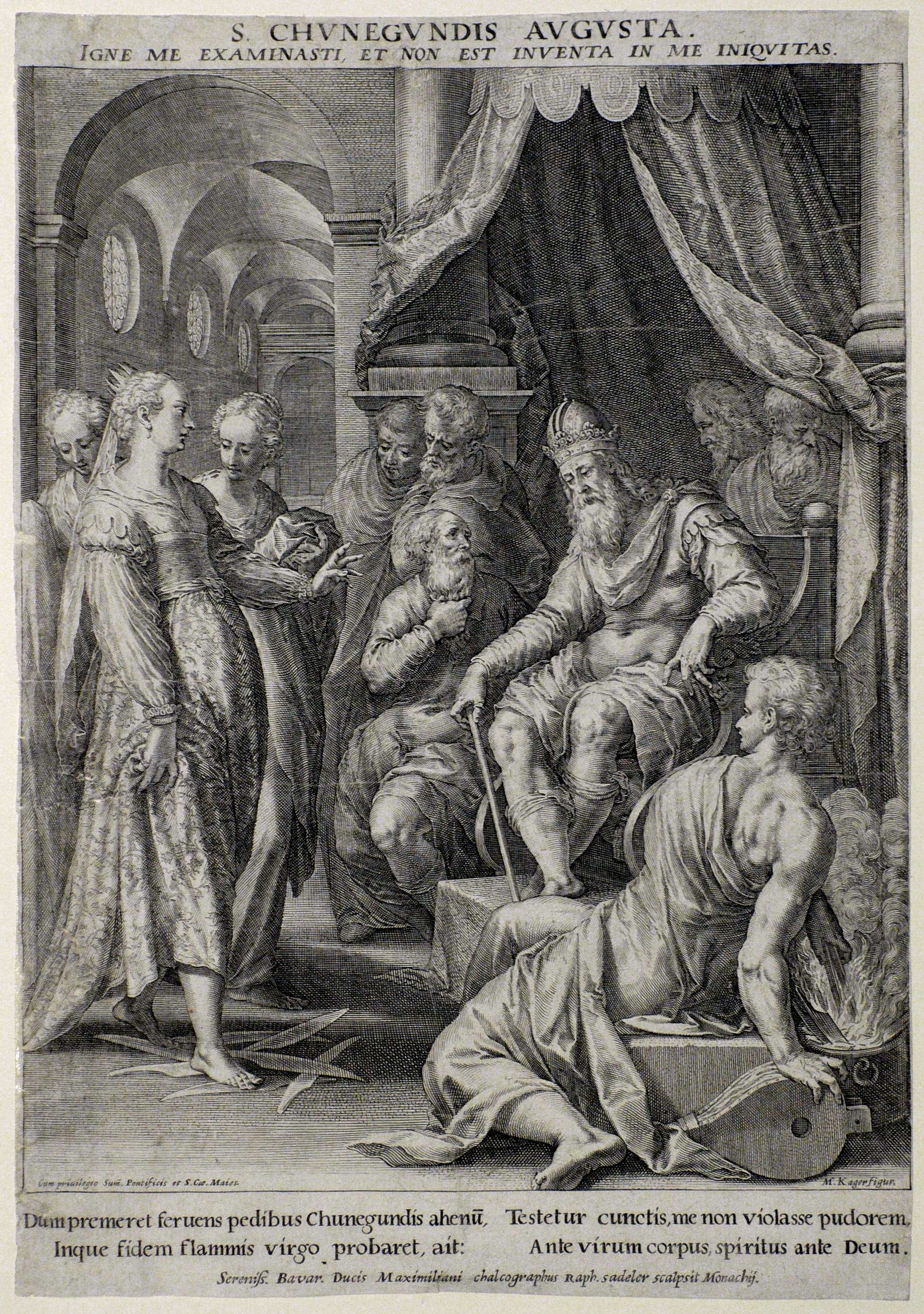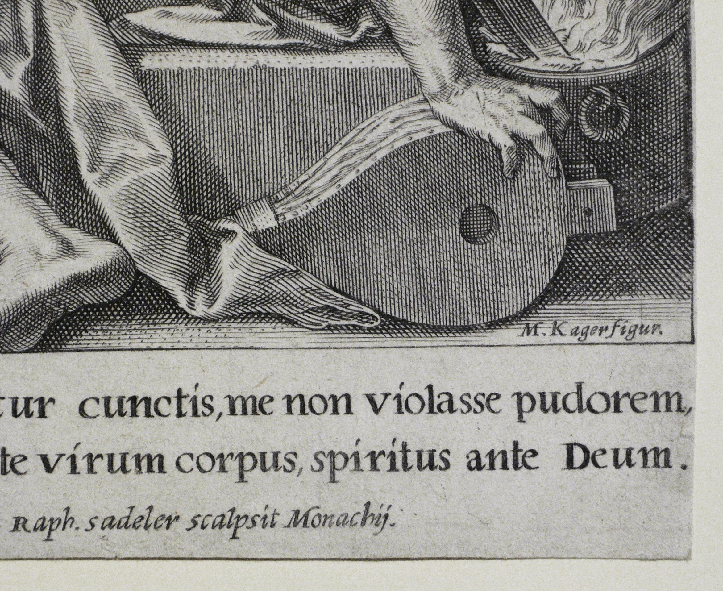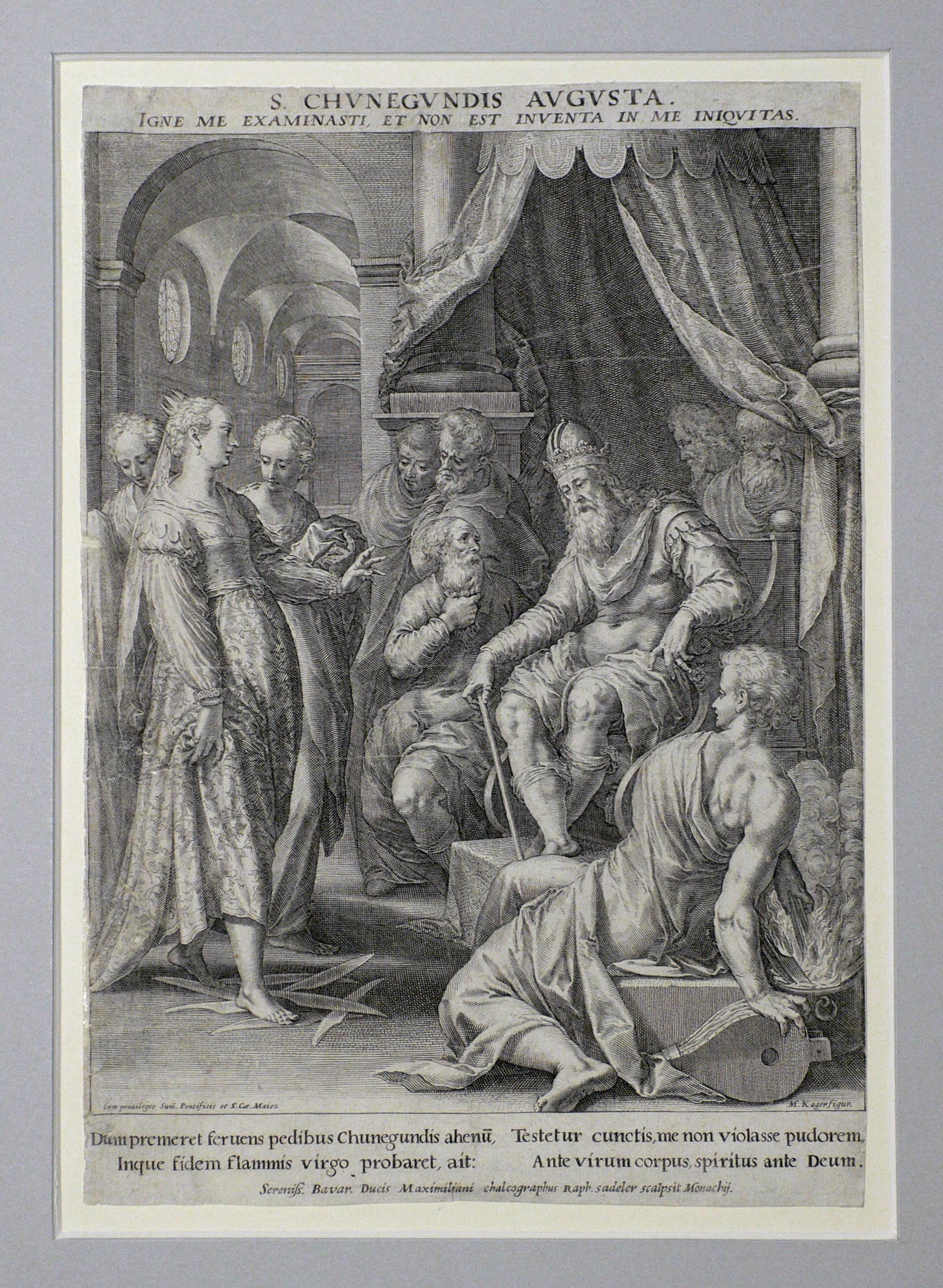 Aus: Matthäus Rader, Bavaria Sancta (München: Anna Berg & Raphael Sadeler 1615). – Am unteren Rand der Platte signiert: ″Sereniss. Bavar. Ducis Maximiliani chalcographus Raph. Sadeler sculpsit Monchij.″ Oberhalb der Darstellung betitelt: ″S. CHVNEGVNDIS AVGVSTA. / IGNE ME EXAMINASTI, ET NON EST INVENT IN ME INIQVITAS.″ Rechts unten in der Darstellung bezeichnet: ″M. Kager figur.″ Unterhalb der Darstellung die Unterschrift: ″Dum premeret feruens pedibus Chunegundis ahenu[..], / Inque fidem flammis virgo probaret, ait: // Testetur cunctis, me non violasse pudorem, / Ante virum corpus, spiritus ante Deum.″ – Dargestellt ist die heiliggesprochene Kunigunde von Luxemburg, Gattin Kaiser Heinrichs II., bei dem Gottesurteil über glühende Pflugscharen gehen zu müssen. – In der Platte beschnitten, schmaler Rändchem um die Einfassungslinie der Darstellung die Schrift. Oberflächlich stärker berieben. Diverse ältere Knickspuren geglättet. Mit Papiergelenken frei im Passepartout montiert. Insgesamt mäßiger Zustand.