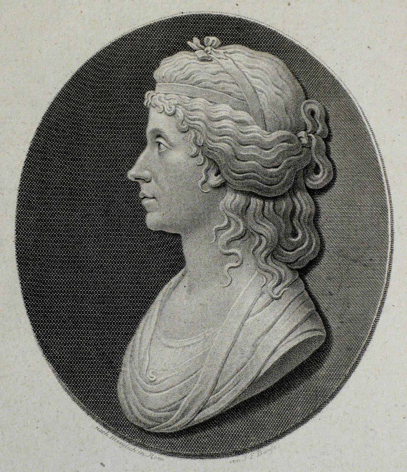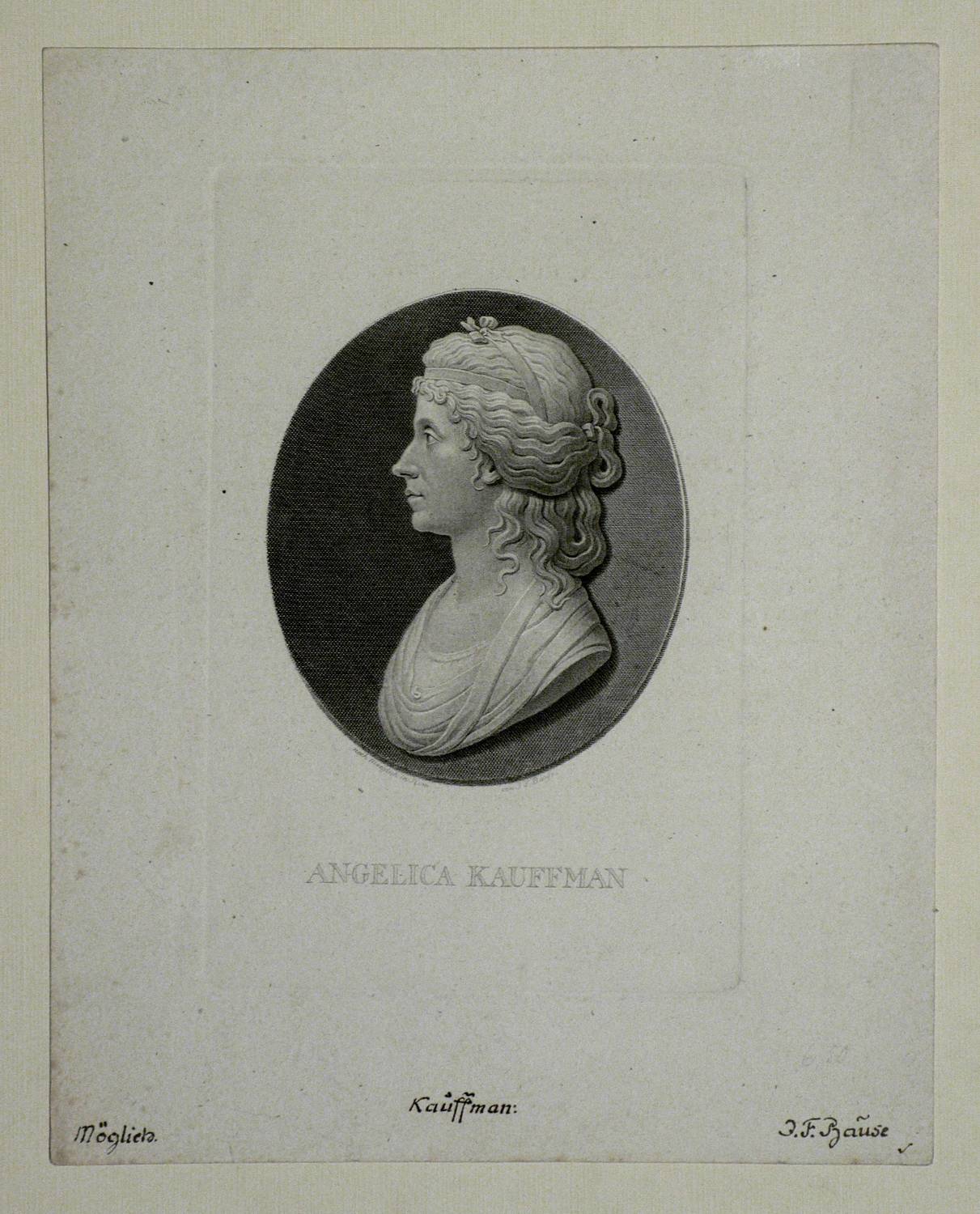 Keil 219 (II von II). – Am unteren Rand des Medaillons signiert: ″nach Moeglich in Rom // von J.F. Bause″. Mittig unten betitelt. Am unteren Blattrand alt in brauner Feder bezeichnet. – Dem Alter entsprechend guter Zustand.