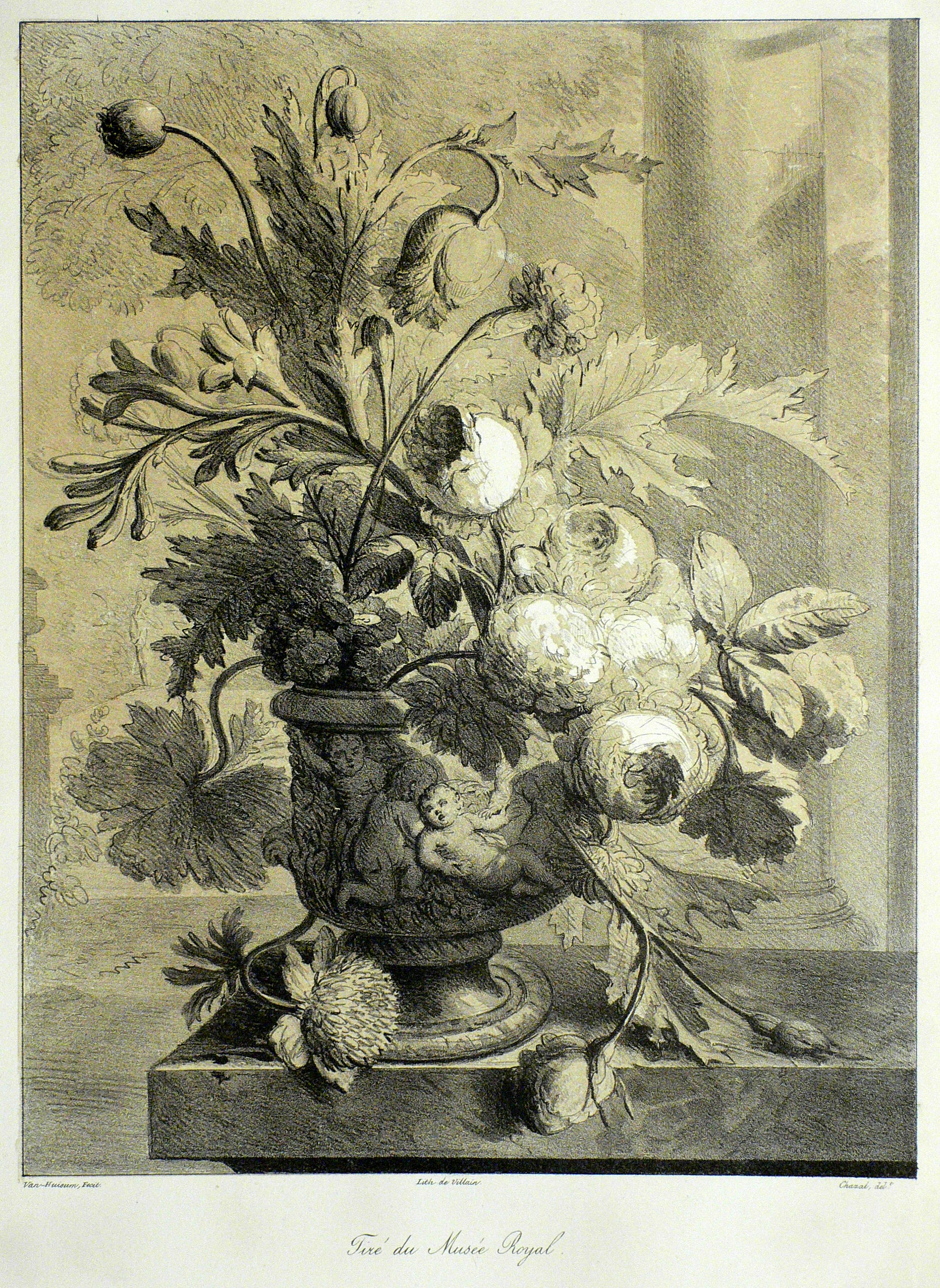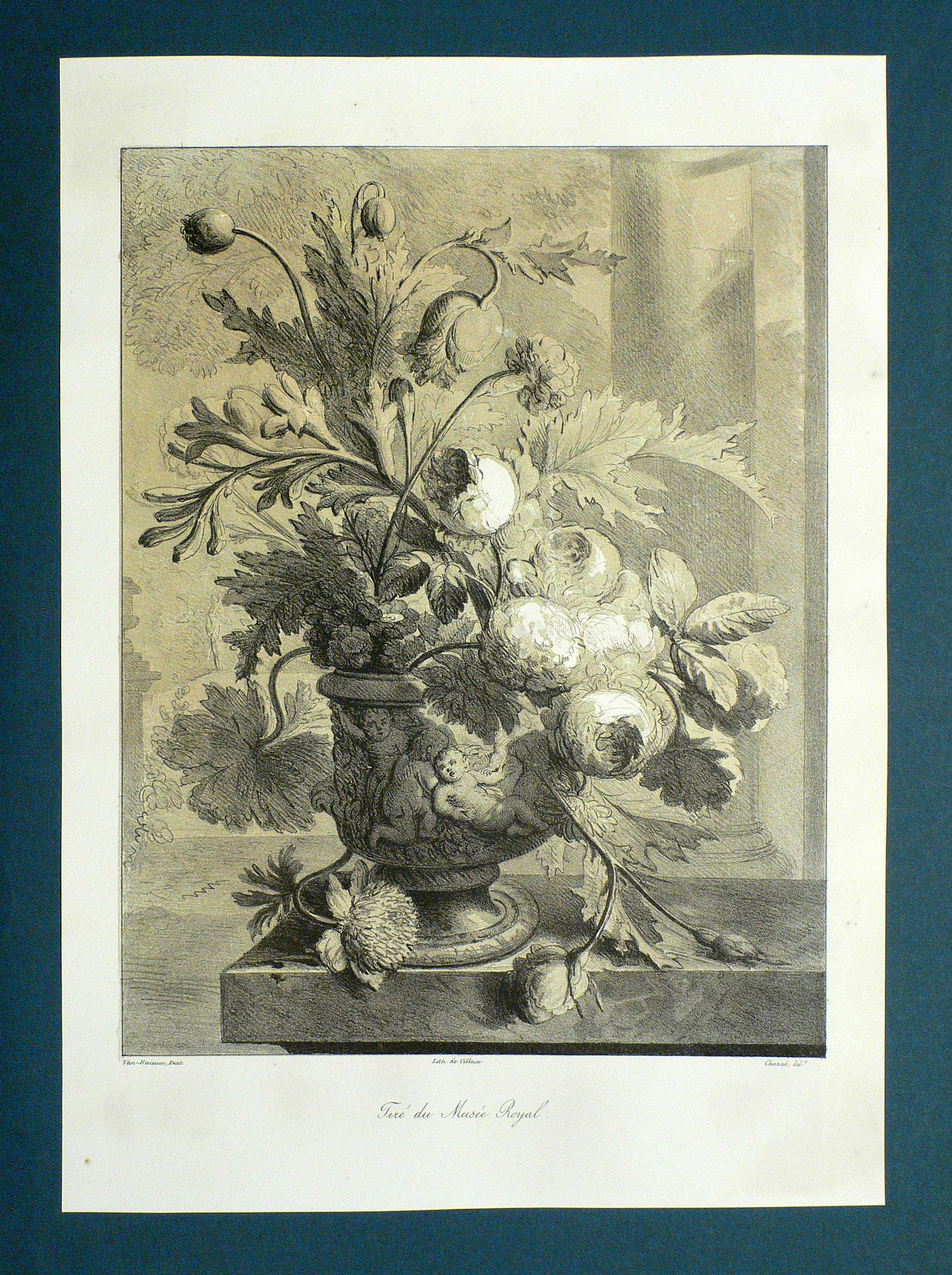 Unterhalb der Darstellung bezeichnet und signiert: ″Van Huisum Fecit. // Lith de Villain. // Chazal del.t // Tiré du Musée Royal.″ – Ausgesprochen delikates Blatt in nobler Grisaille-Tönung. – Hervorragend erhaltenes Blatt.