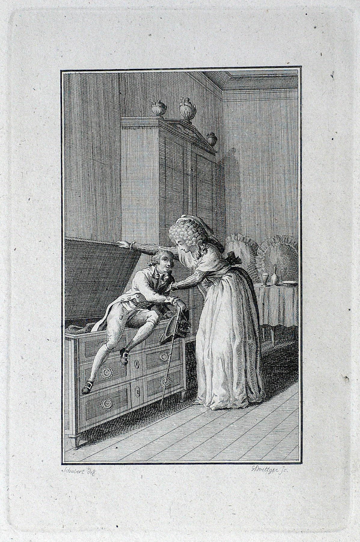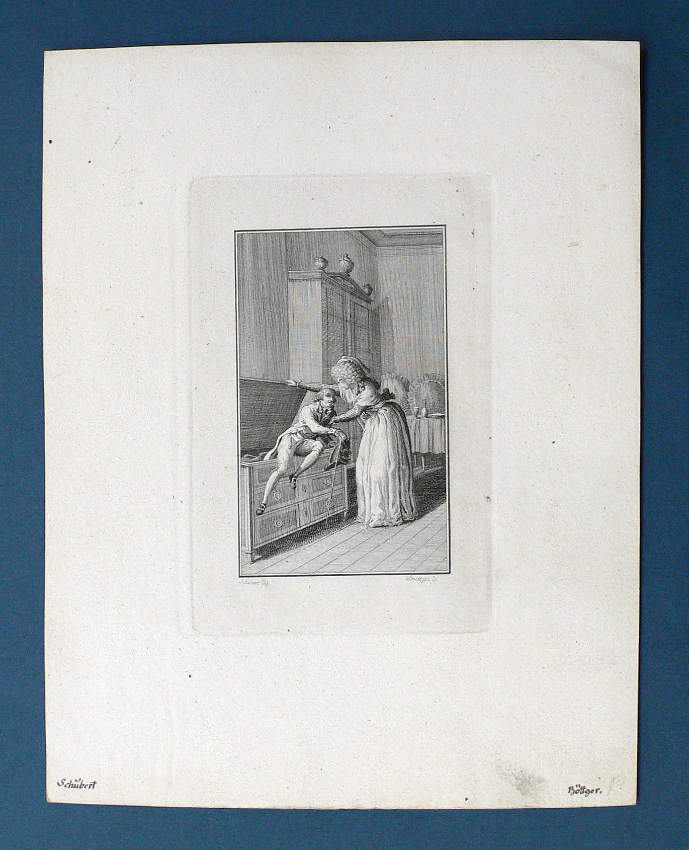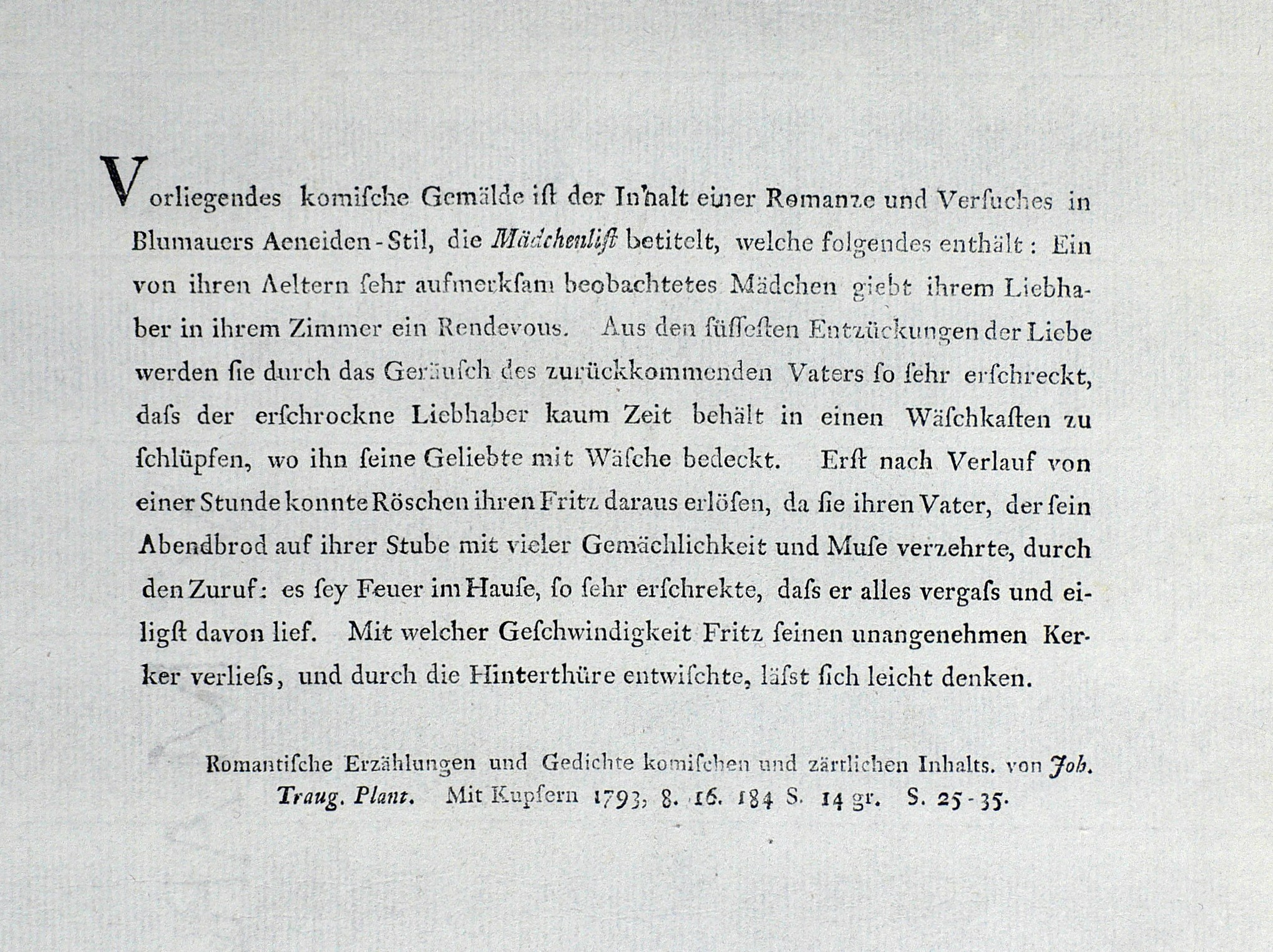 Aus: Johann Traugott Plant, Romantische Erzählungen und Gedichte komischen und zärtlichen Inhalts (Leipzig: Voß & Leo 1793). – In der Platte unterhalb der Darstellung signiert: ″Schubert del. / G Boettger sc.″ Das beigegebene Textblatt mit einem Kommentar, beginnend: ″Vorliegendes komische Gemälde ist der Inhalt einer Romanze und Versuches in Blumauers Aeneiden-Stil, die Mädchenlist betitelt, welche folgendes enthält: Ein von ihrem Aeltern sehr aufmerksam beobachtetes Mädchen giebt ihrem Liebhaber in ihrem Zimmer ein Redevous. Aus den süssesten Entzückungen der Liebe werden sie durch das Geräusch des zurückkommenden Vaters so sehr erschreckt, dass der erschrockne Liebhaber kaum Zeit behält in einen Wäschkasten zu schlüpfen, wo ihn seine Geliebte mit Wäsche bedeckt. Erst nach Verlauf von einer Stunde konnte Röschen ihren Fritz daraus erlösen, ...″ – Wohl als Verlagsanzeige zu Werbezwecken herausgegebener Einblattdruck für das entsprechend mit Kupfern ausgestattete Bändchen von Plant. - Beigegeben das zugehörige Textblatt! – Beide Blätter in hervorragendem Zustand.